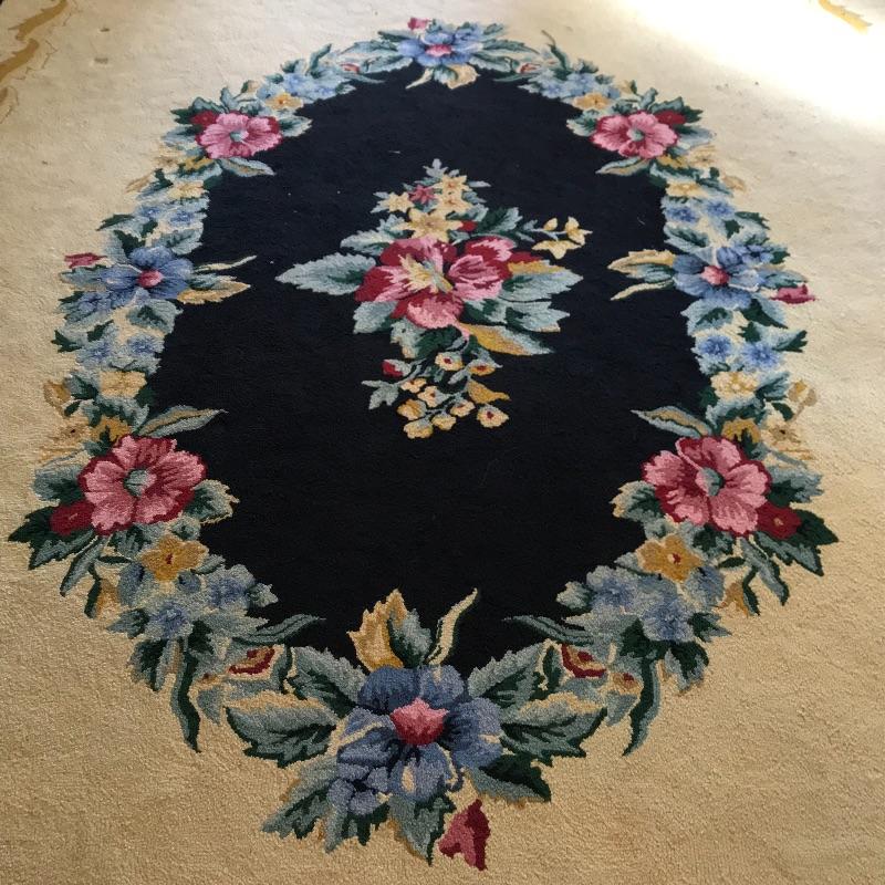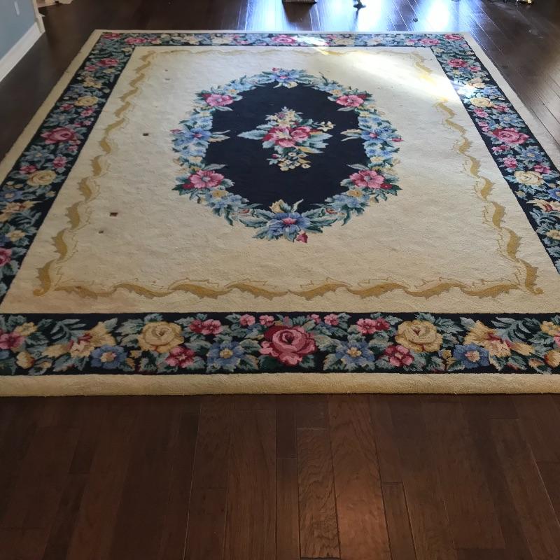 This is a beautiful indoor wool rug. Measures 18’ X 14.5’ you have all the primary colors ... white, black, blues, yellows/golds, and burgundy to pink.