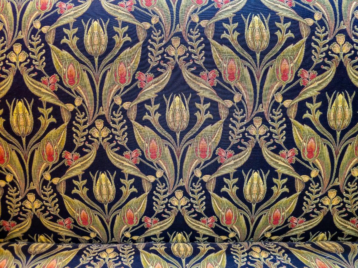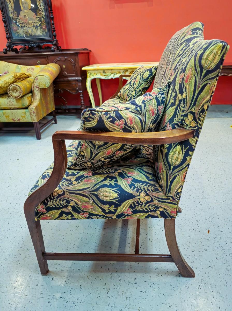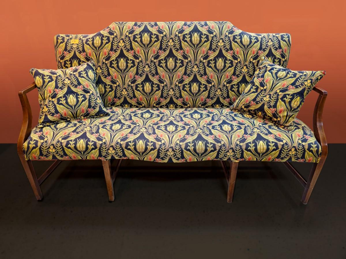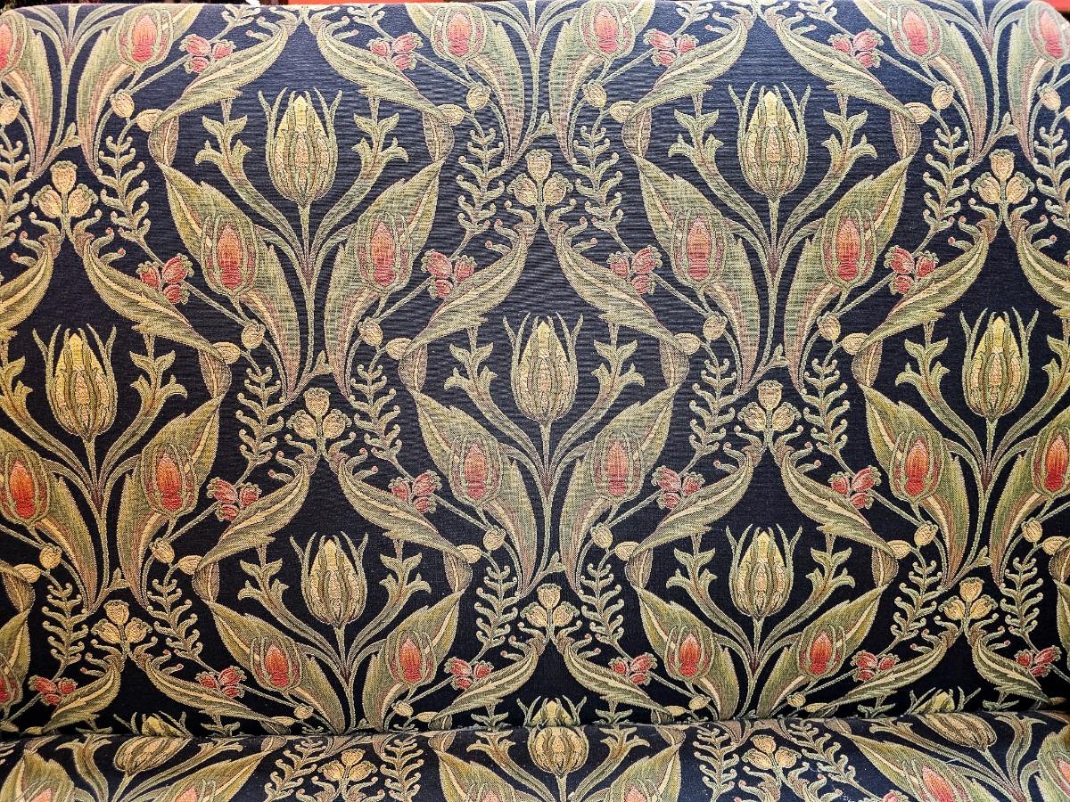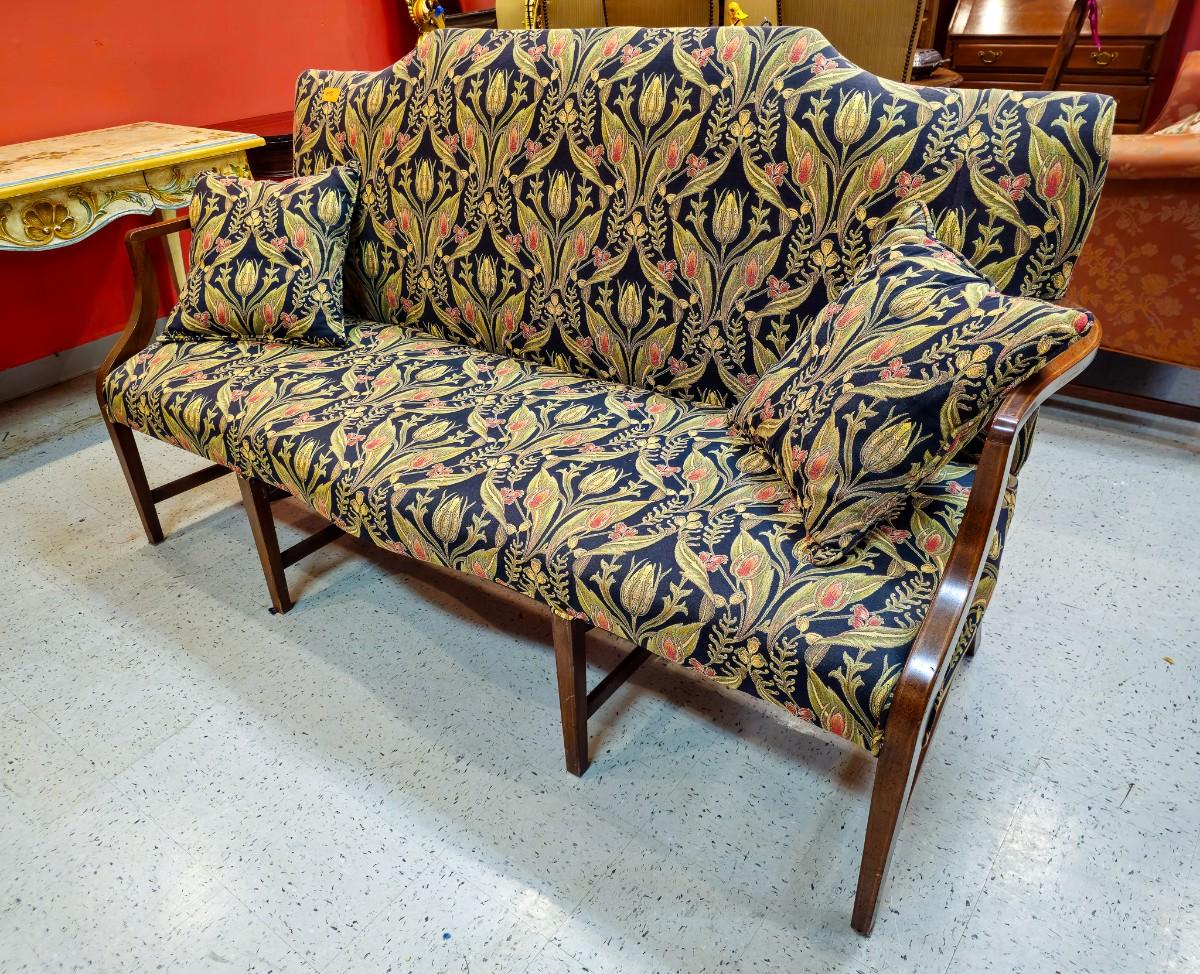Sheraton style sofa with black floral fabric, 74"W 28-1/2"D x 42"H back, 18"H seat