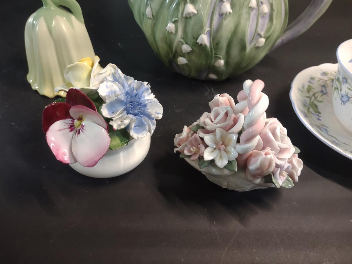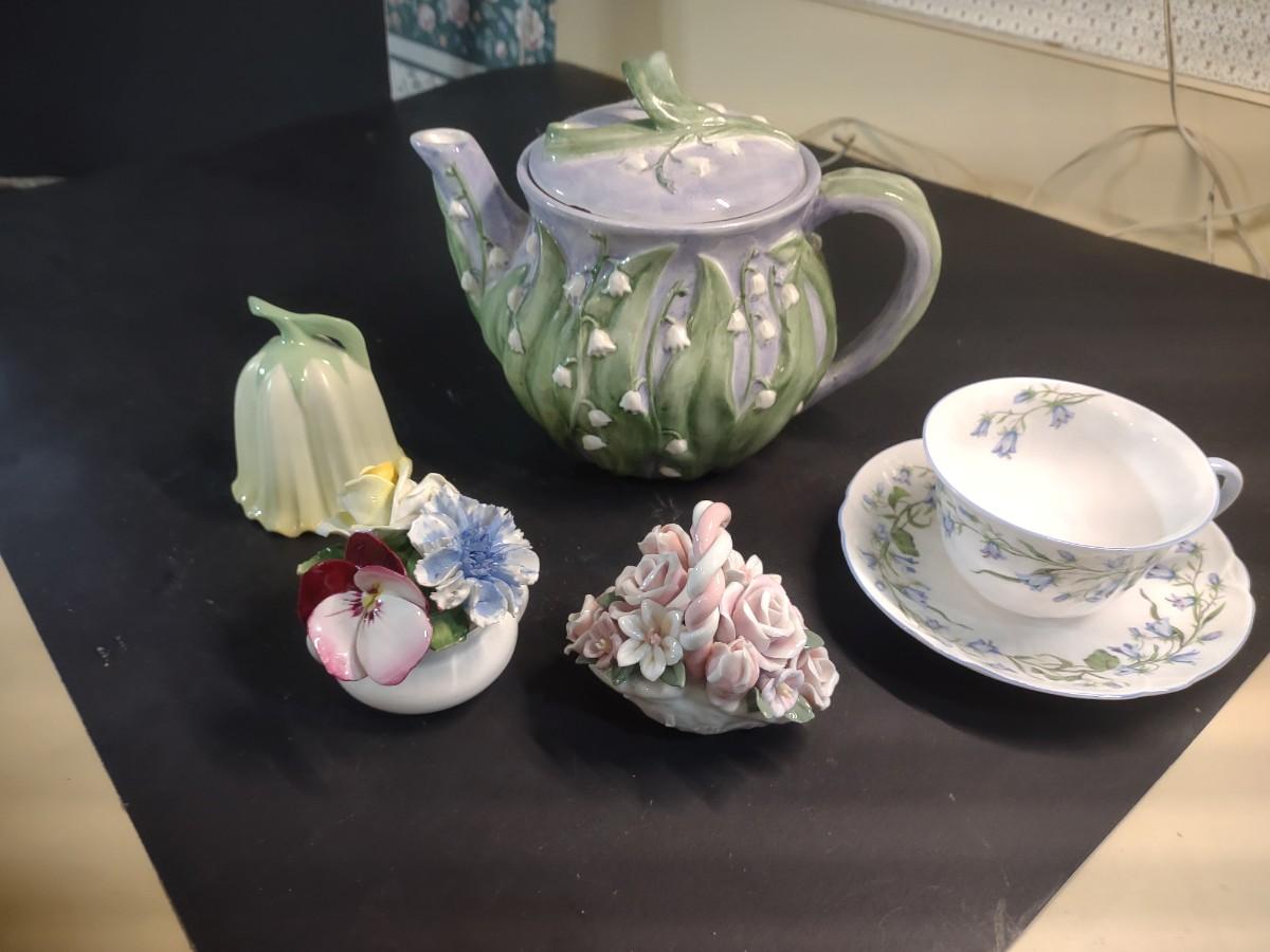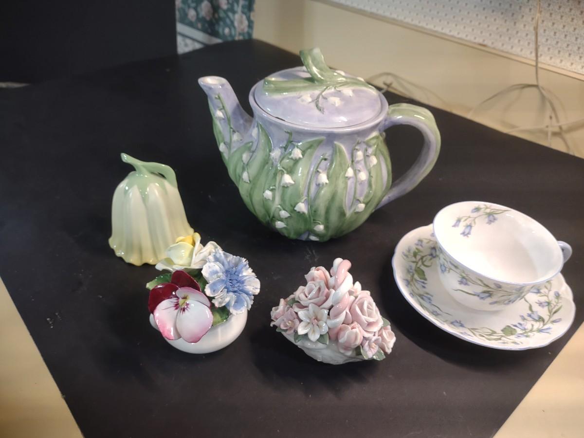 FLORAL TEAPOT AND BELL, SHELLEY CUP AND SAUCER PLUS MORE
