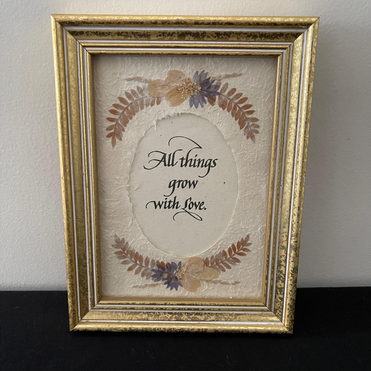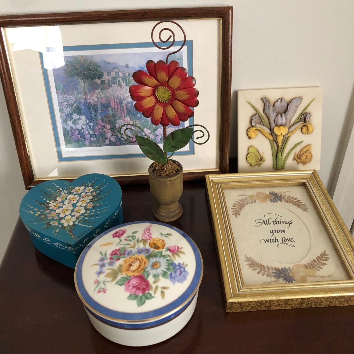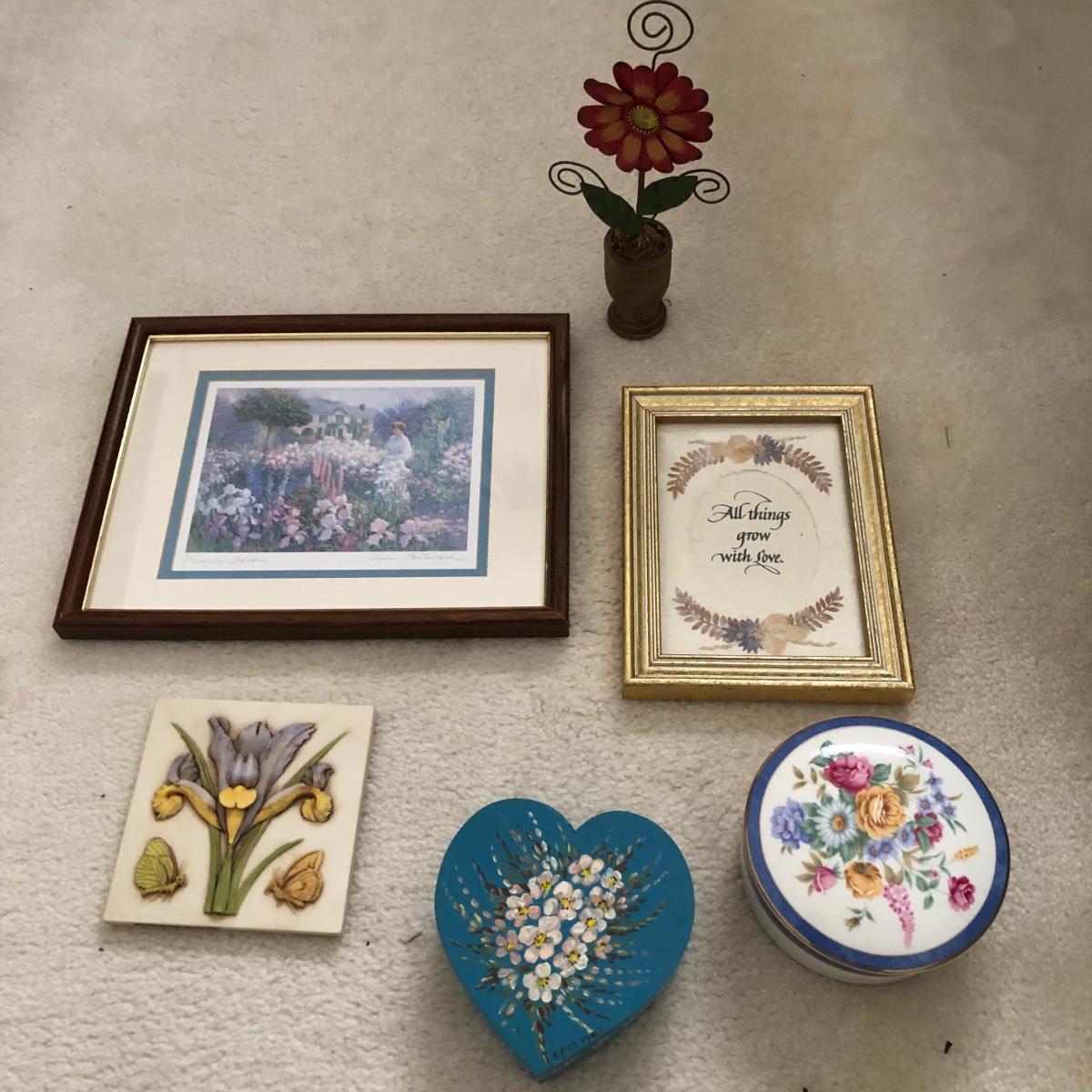 This lot includes framed artwork, a flower photo holder, two types of floral containers, and a decorative tile. The first art work is of a garden and it measure 9.5” x 11.75”. The second says “All Things Grow with Love” and has dried flowers. One of the lidded containers is ceramic with gold trim. The other is wooden with hand painted flowers.