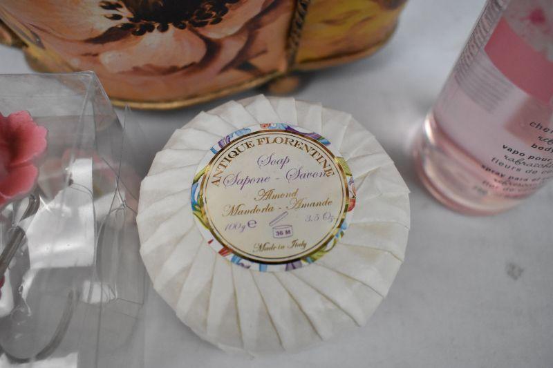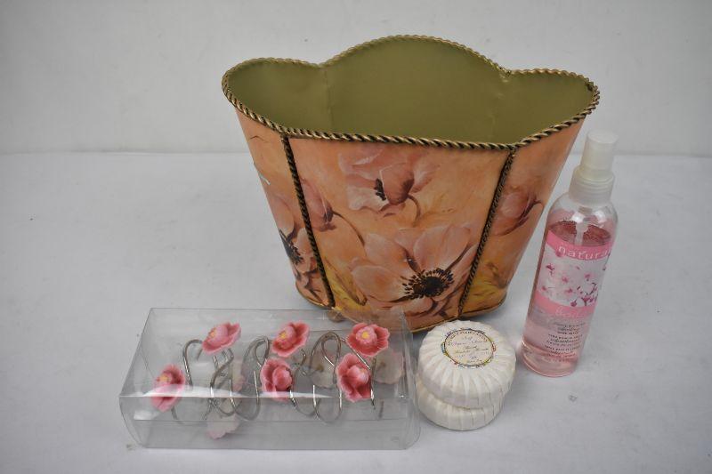 Floral Trash TIn, Flower Shower Curtain RIngs, Almond Soap (2), Cherry Blossom Spray