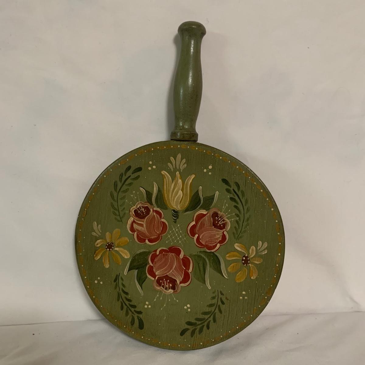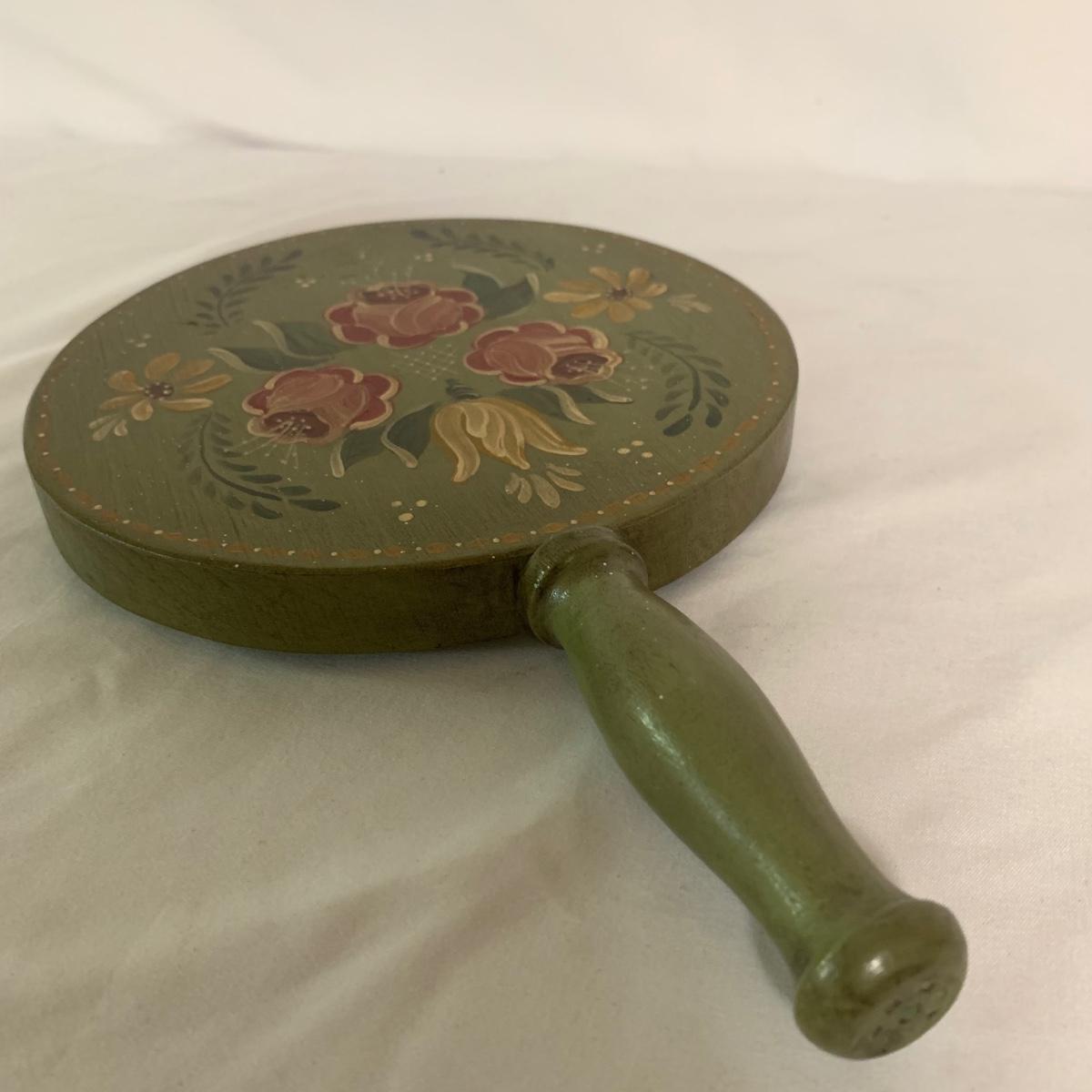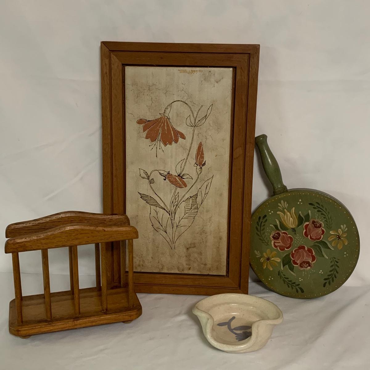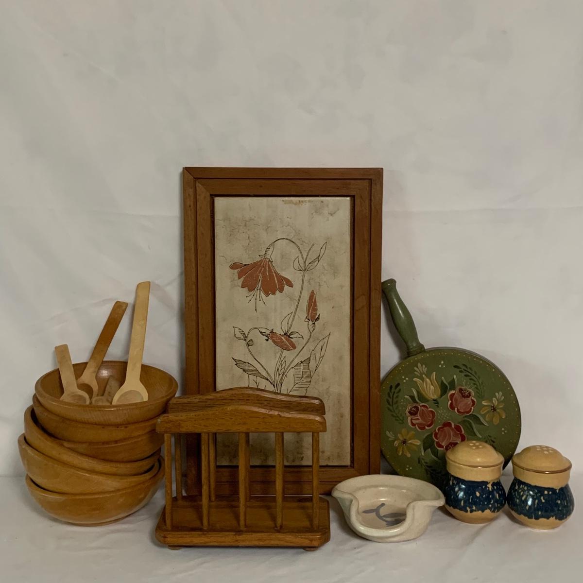 A variety of lovely and unique kitchen decor. There are two floral trivets. One is wood and hand painted with flowers. The other has a wood base/frame and ceramic tile center, by Sintopress. This one measures 8.75” x 14.5”. Also included is a wood napkin holder from Three Mountaineers, a ceramic spoon rest signed “Fletcher”, a ceramic salt and pepper shaker set, six wood bowls, and four wood spoons. All items are used, but structurally in good condition. The napkin holder, wood bowls, and wood spoons show a bit of wear, see photos.