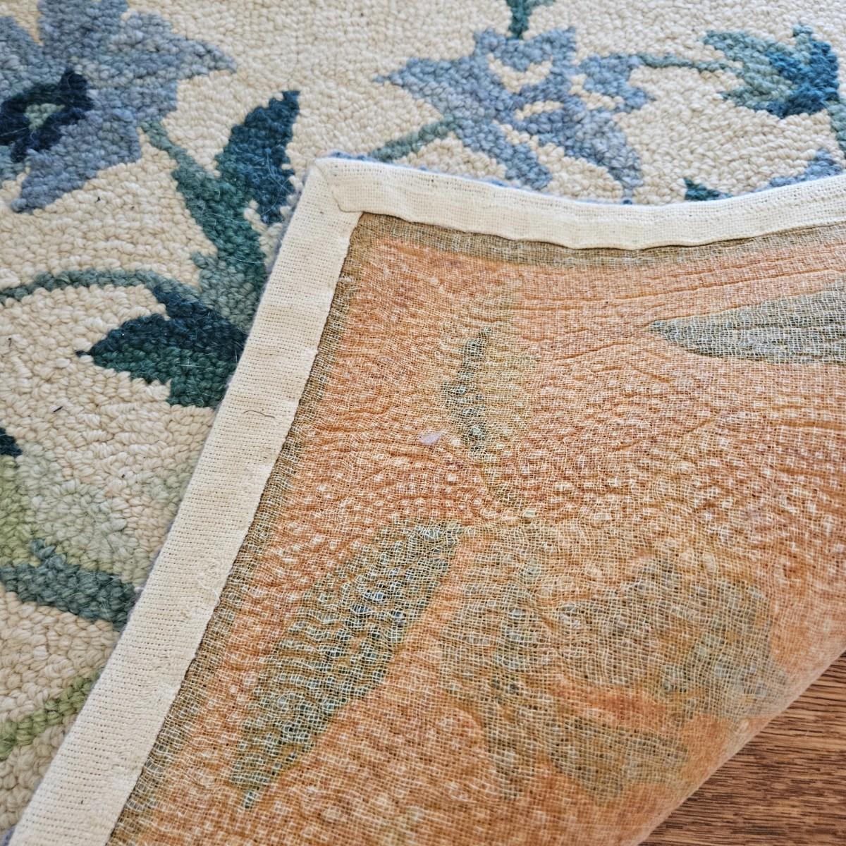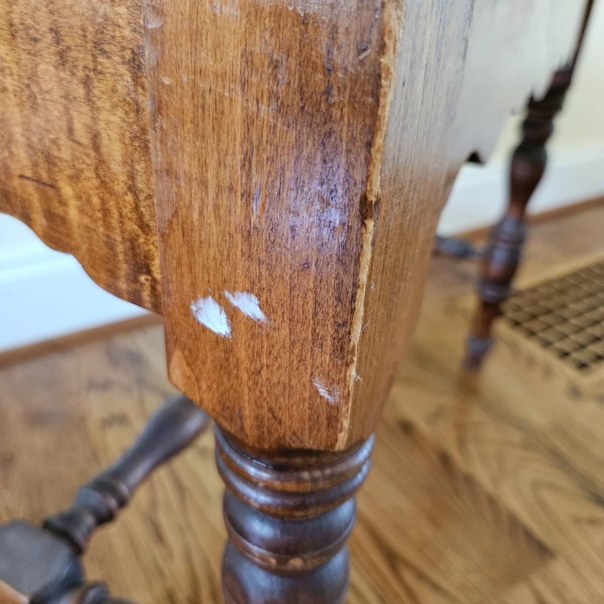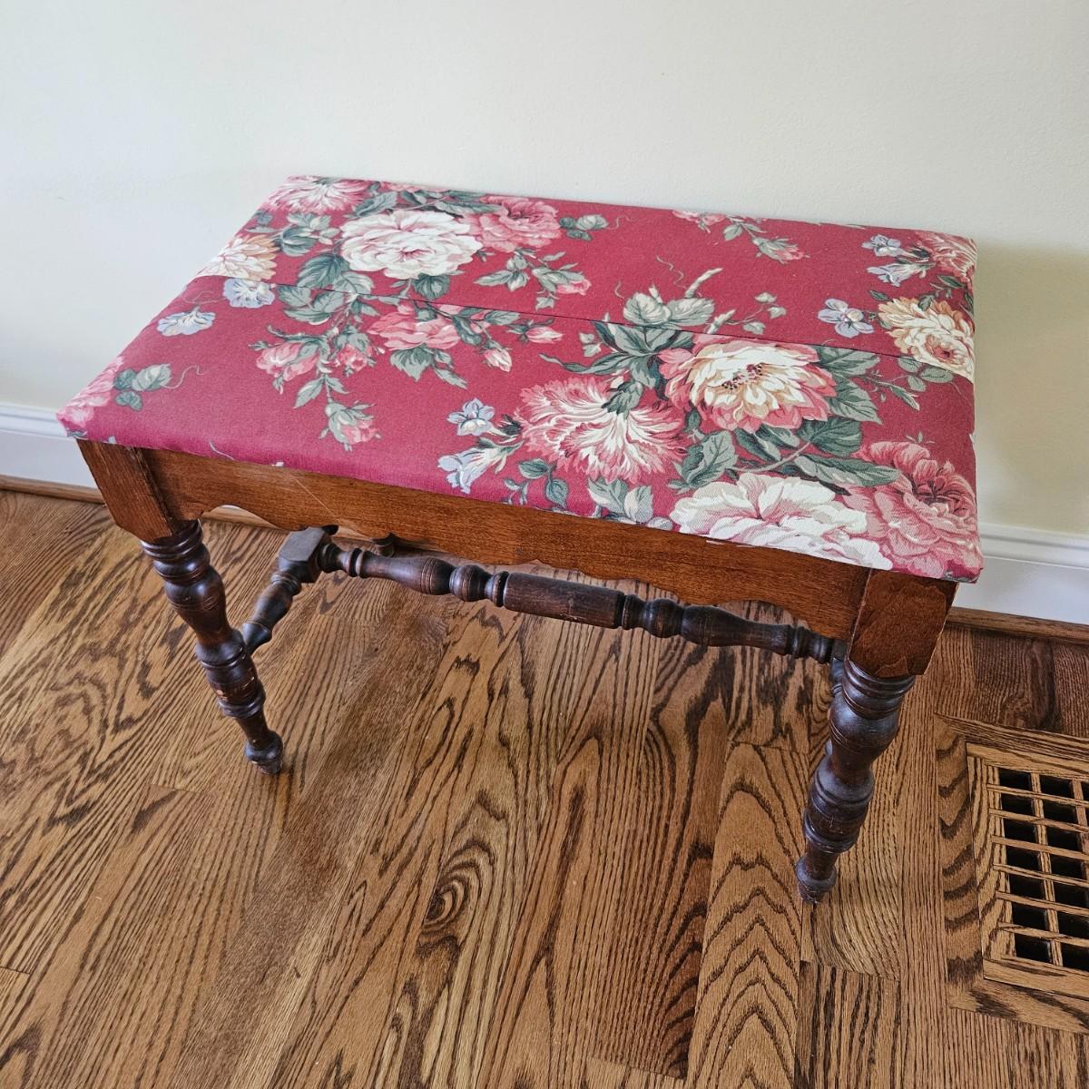 A vanity stool that has a wooden body with a rich medium brown stain and a rose motif upholstery. It measures approximately 24" x 14" x 18.5"H and has some minor scratches and blemishes. Also includes a floral themed rug that measures approximately 35" x 25". Local pickup only