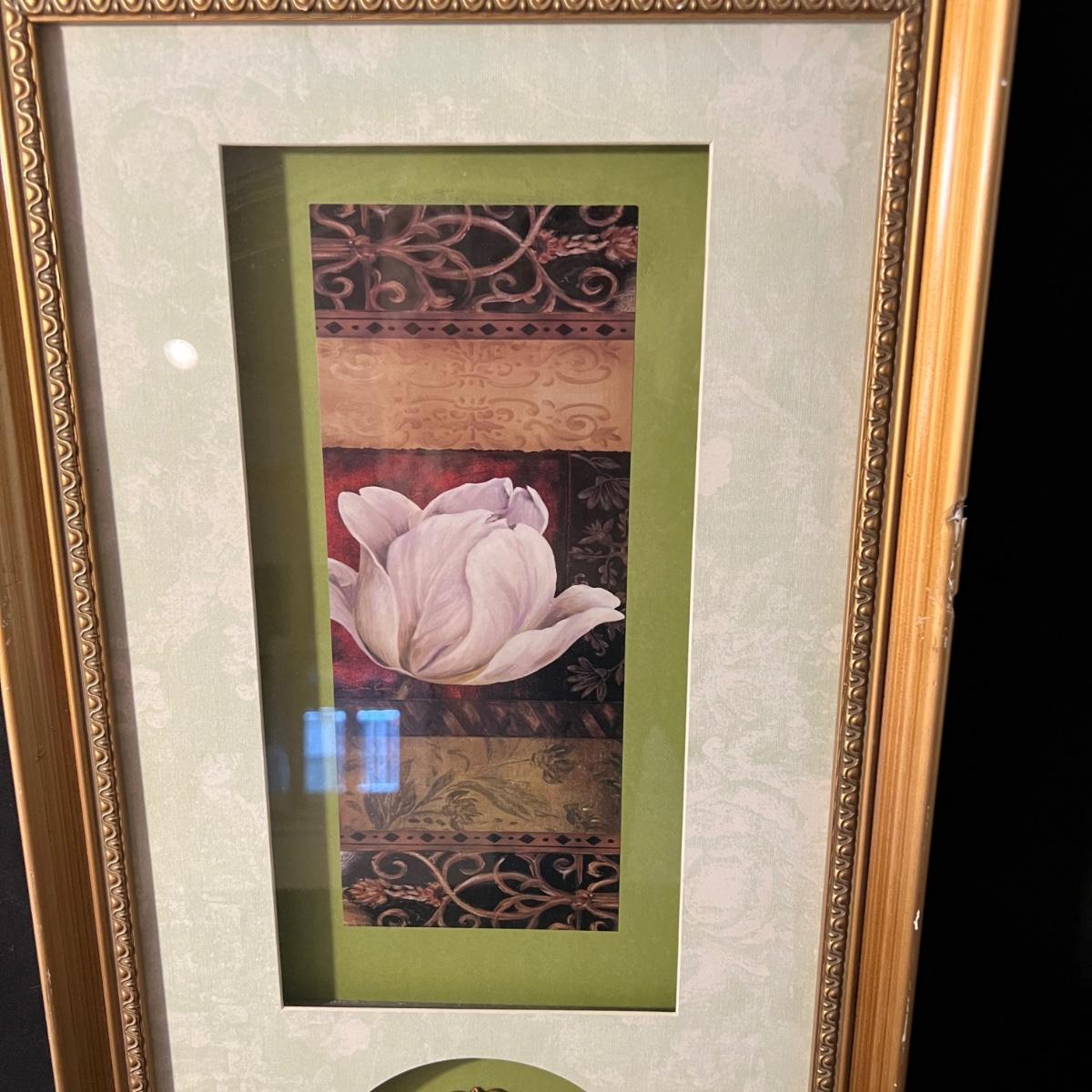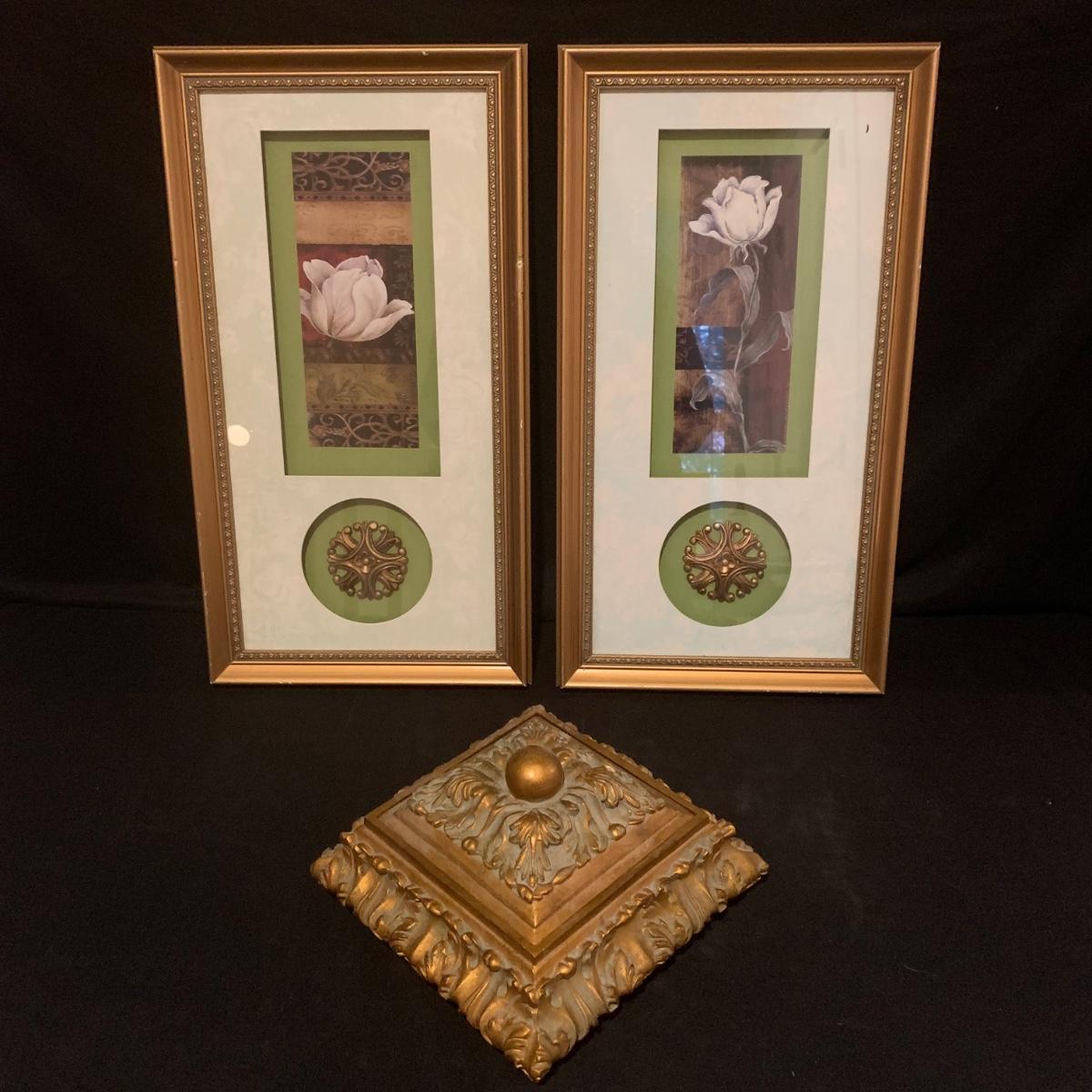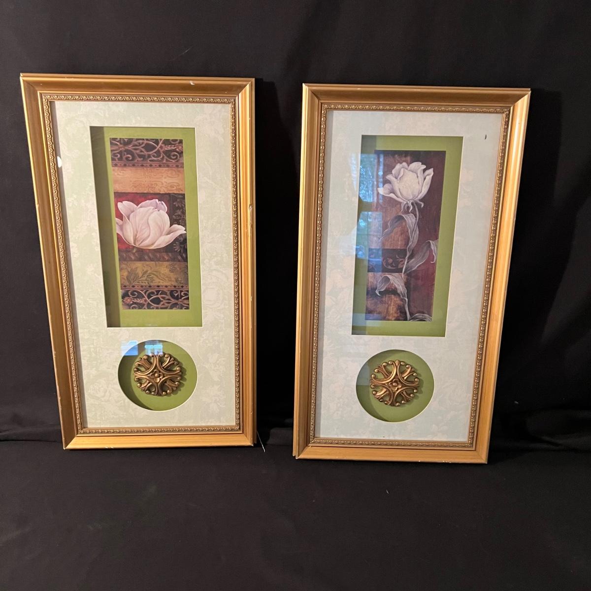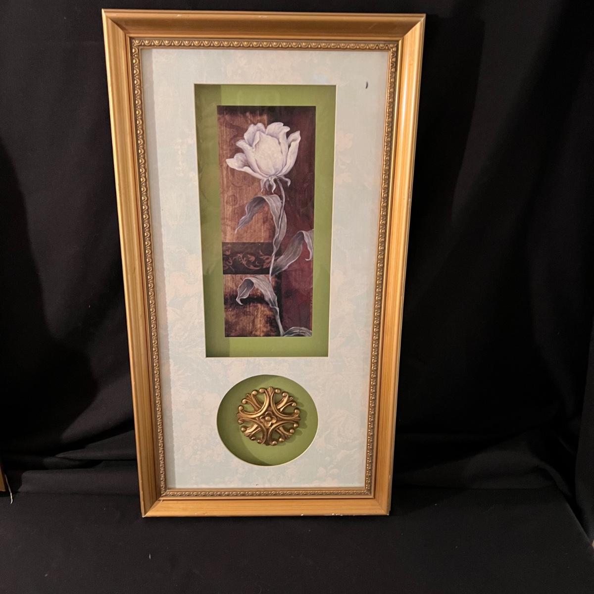 Two floral prints framed in wooden gold frames with a medallion at the bottom and set in a shadow style box frame. Both measure 22”H x 11.75”W. Frames shows slight marks (see photos). Lot also includes lovely decorative wooden box with removable lid. Shipping available. Shipping art can be costly. We suggest calling our local UPS with dimensions and getting an estimate before bidding: (828) 252-6930.