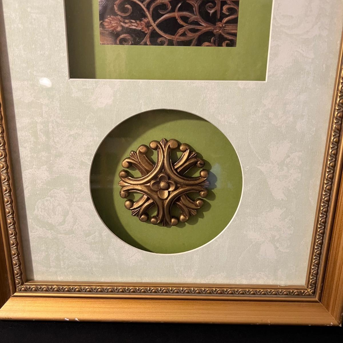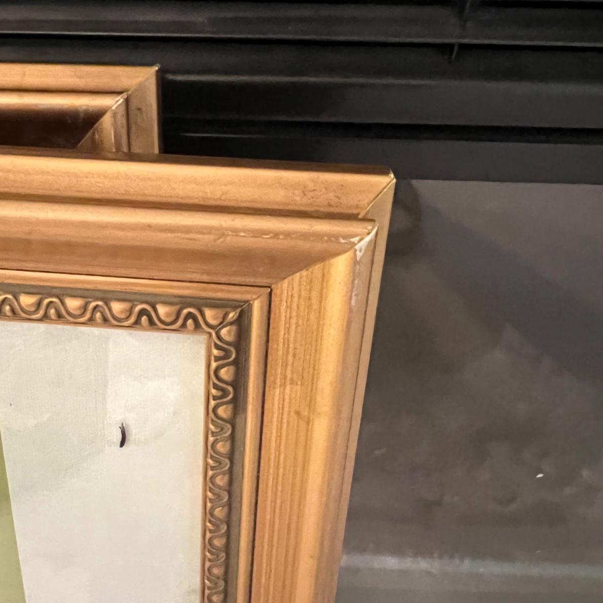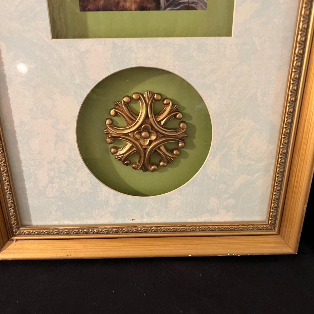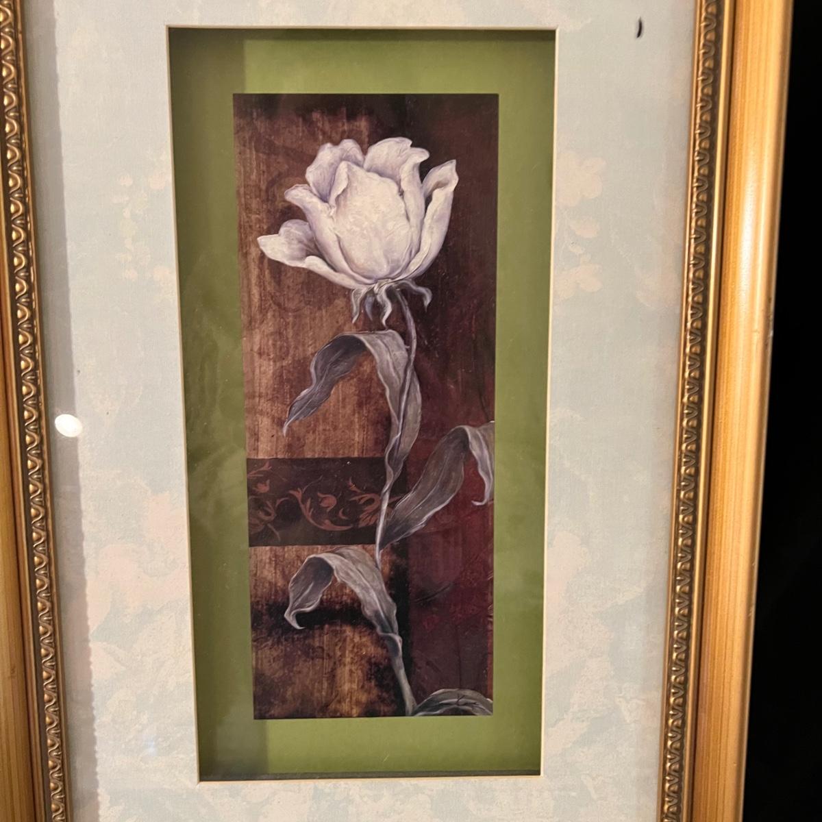Two floral prints framed in wooden gold frames with a medallion at the bottom and set in a shadow style box frame. Both measure 22”H x 11.75”W. Frames shows slight marks (see photos). Lot also includes lovely decorative wooden box with removable lid. Shipping available. Shipping art can be costly. We suggest calling our local UPS with dimensions and getting an estimate before bidding: (828) 252-6930.