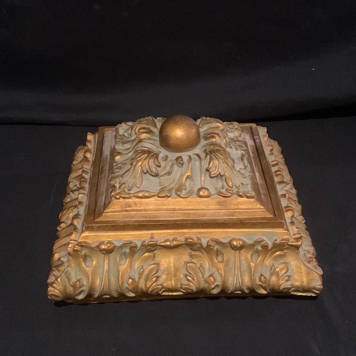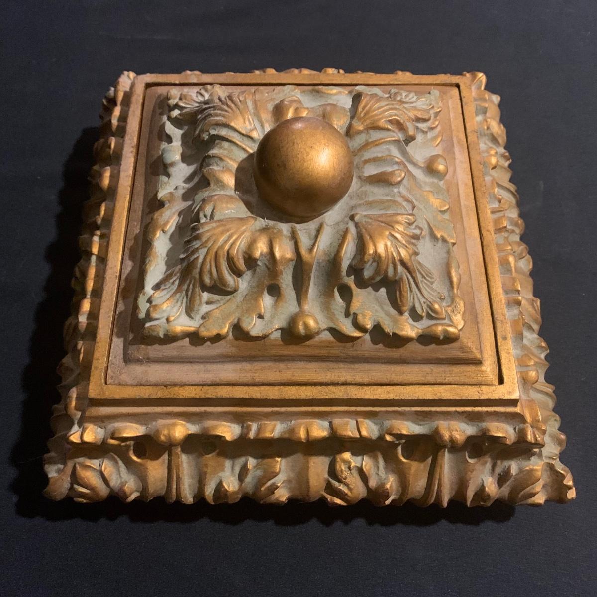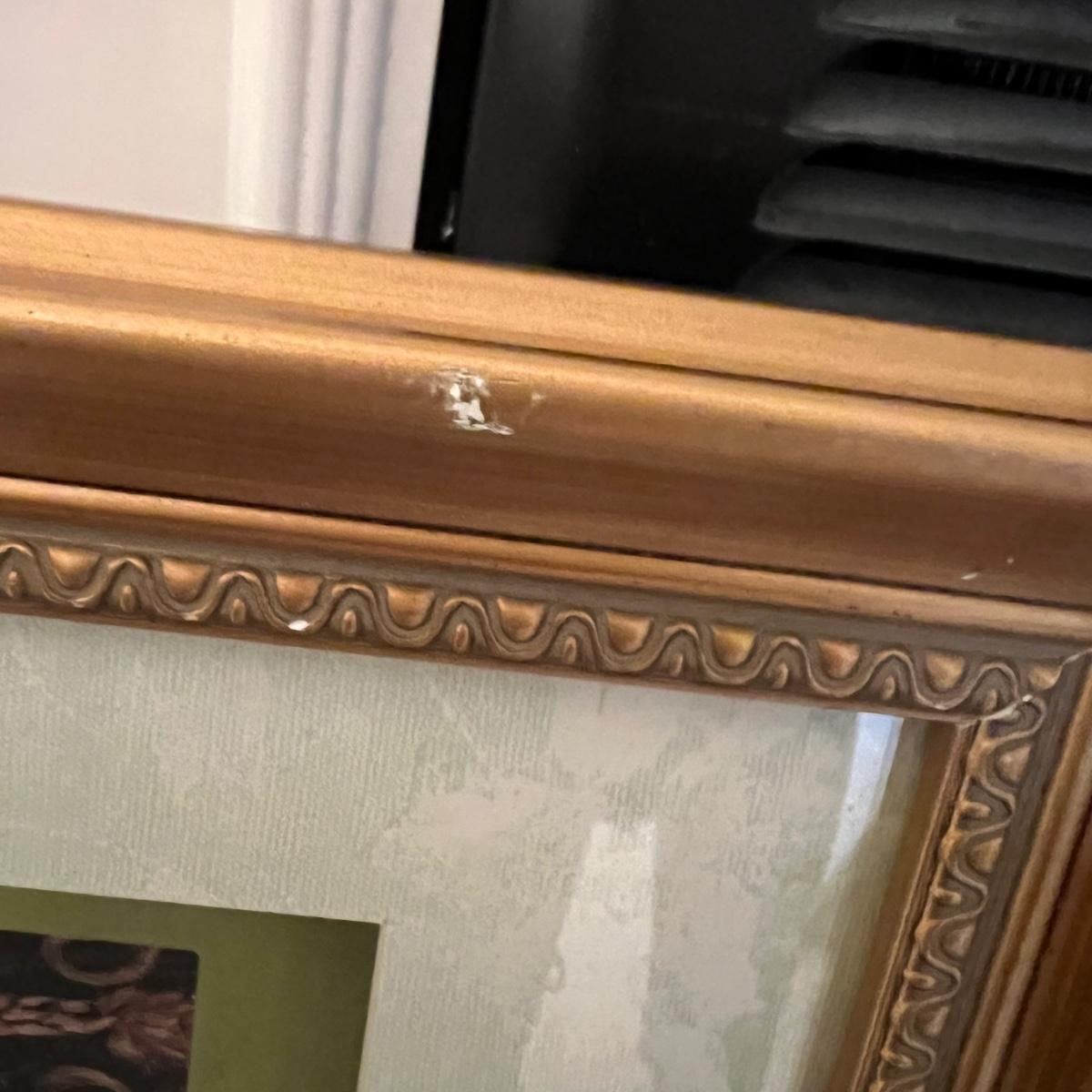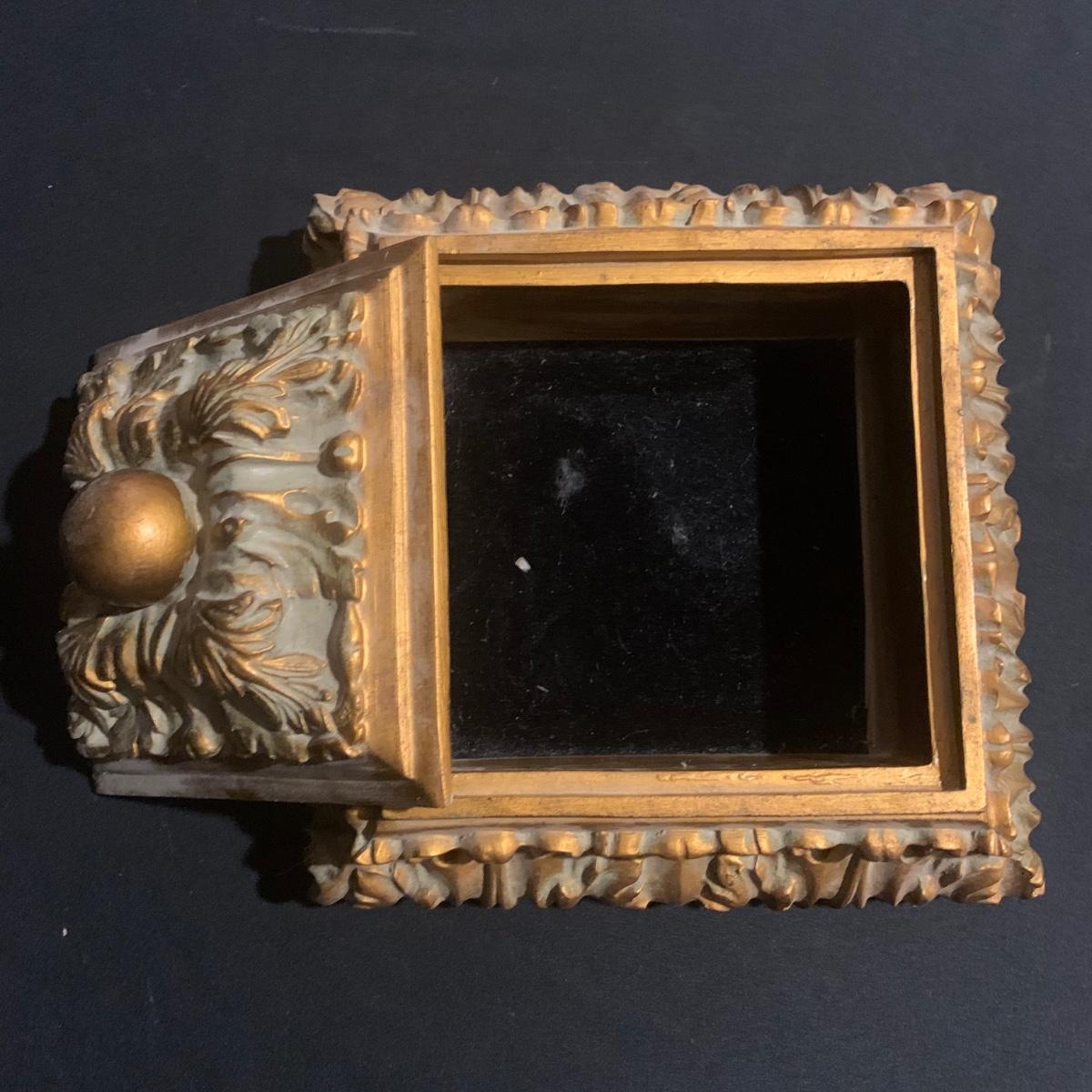 Two floral prints framed in wooden gold frames with a medallion at the bottom and set in a shadow style box frame. Both measure 22”H x 11.75”W. Frames shows slight marks (see photos). Lot also includes lovely decorative wooden box with removable lid. Shipping available. Shipping art can be costly. We suggest calling our local UPS with dimensions and getting an estimate before bidding: (828) 252-6930.