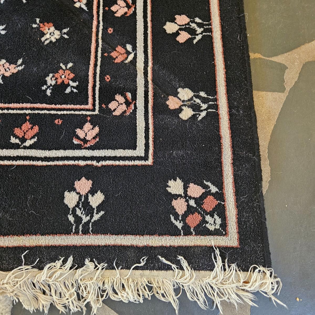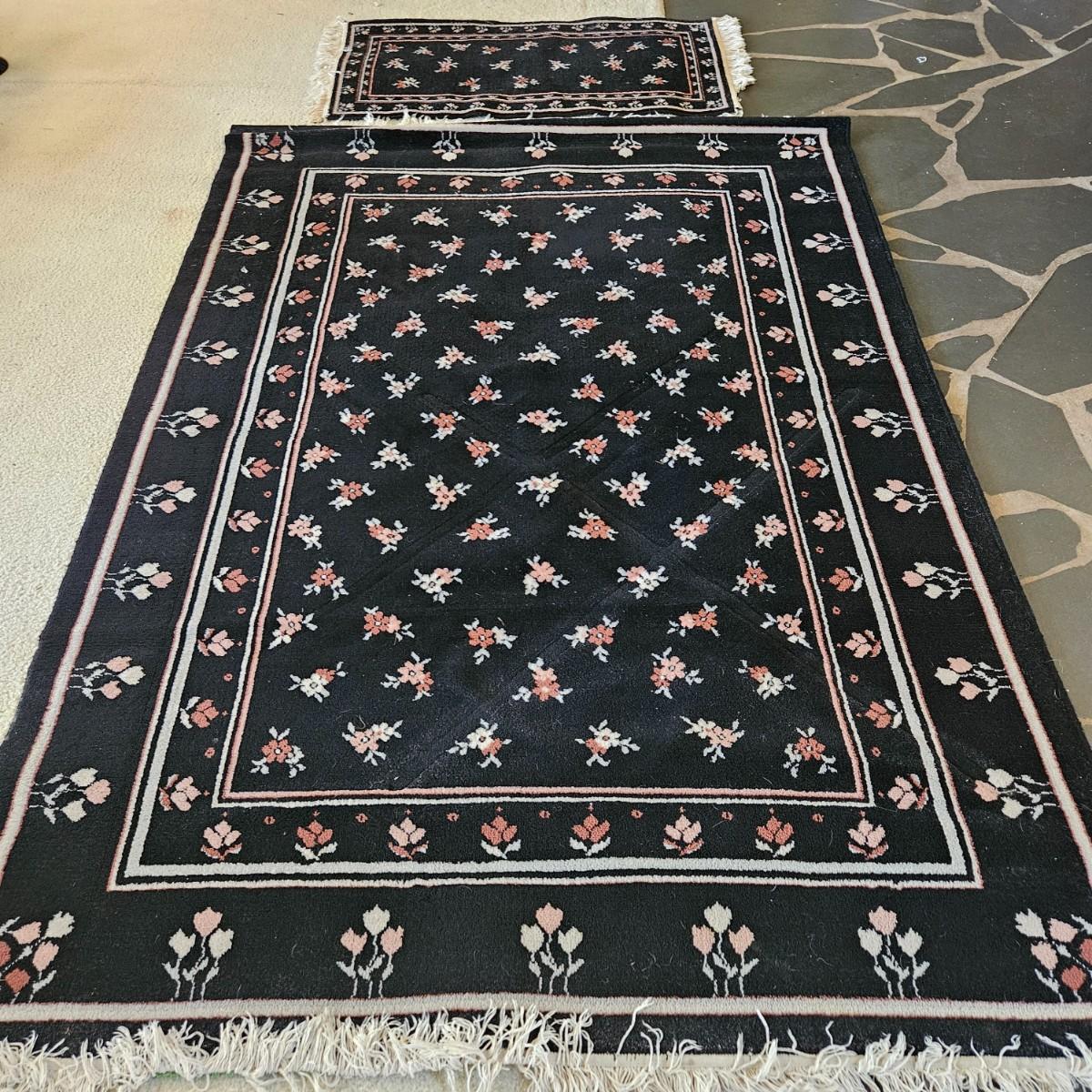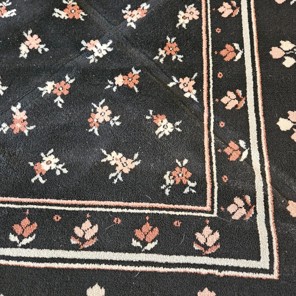 A pair of matching Florette rugs with a black aground and a floral pattern. The area rug measures approximately 8'6" x 5'6" and includes a rug slip pad. The runner measures approximately 2'4" x 4'4. Local pickup only