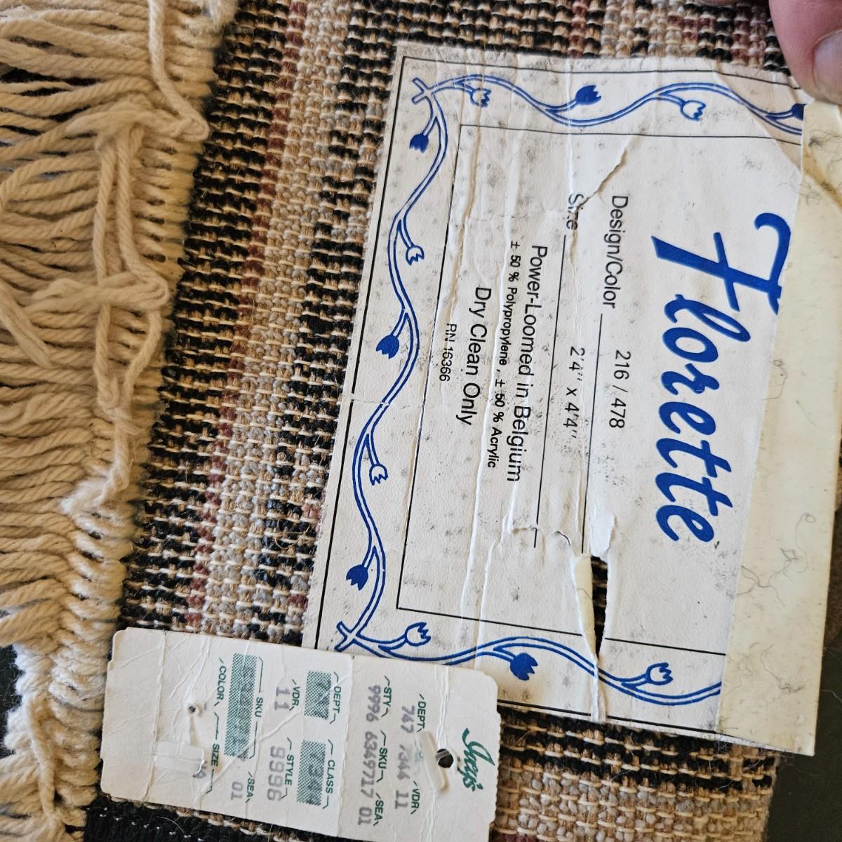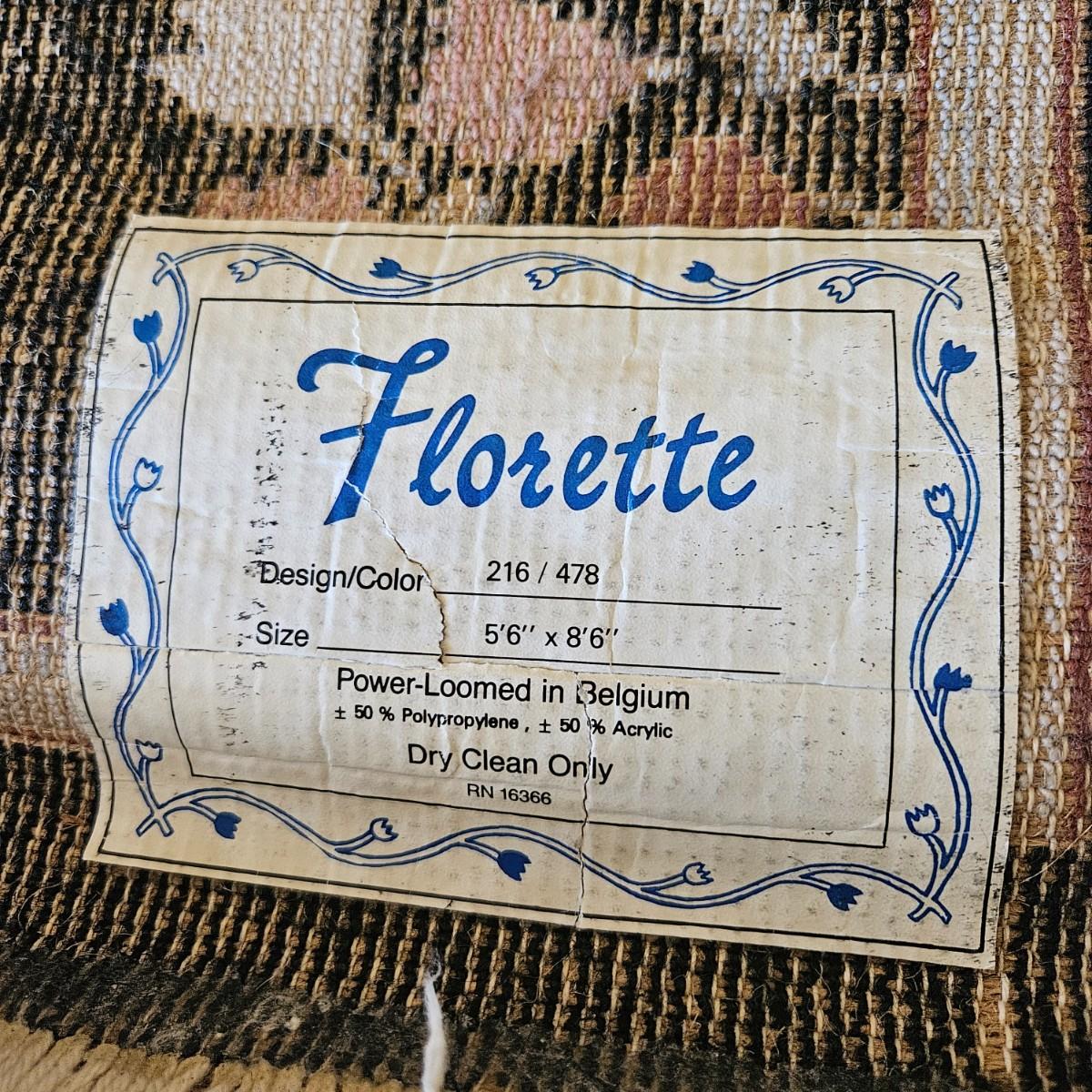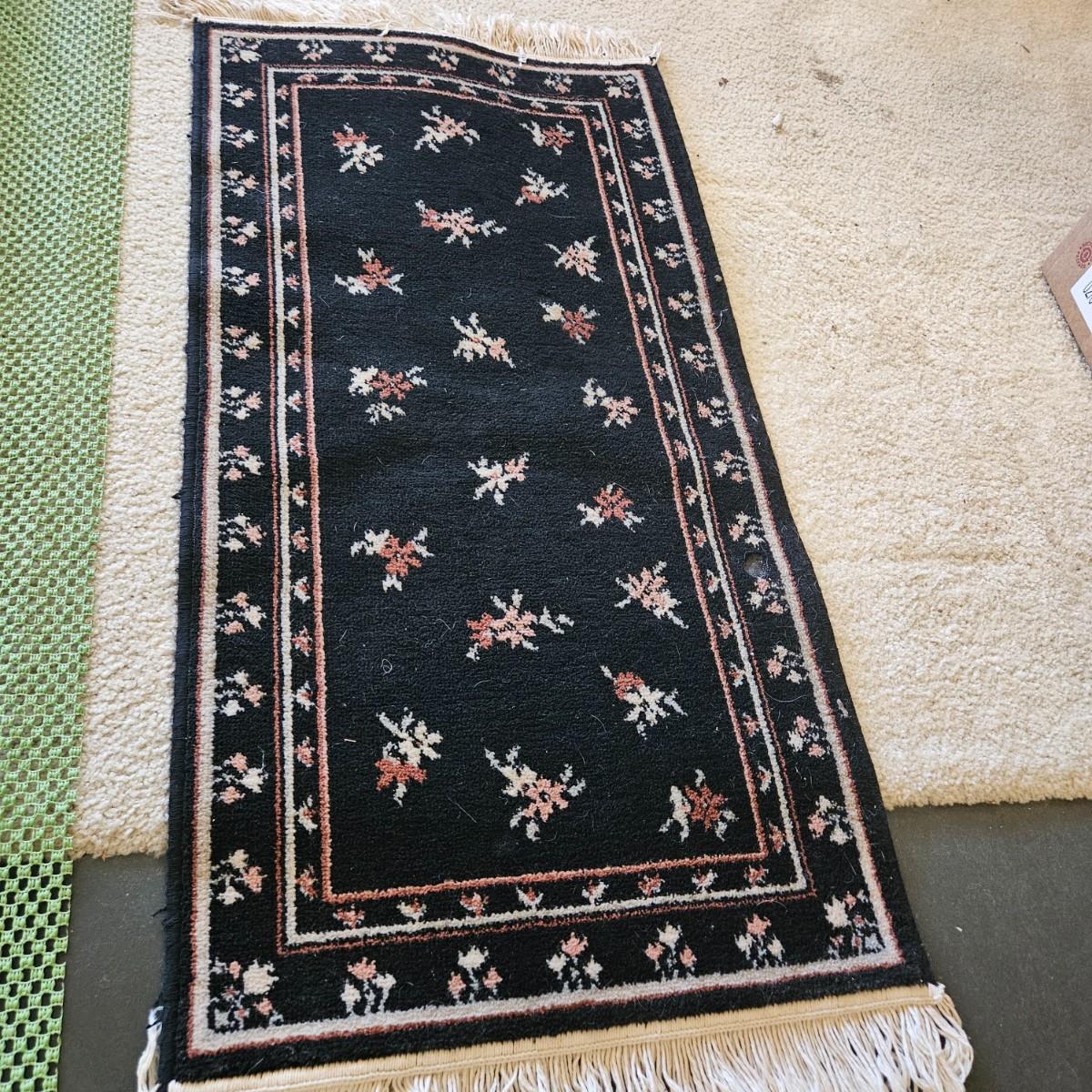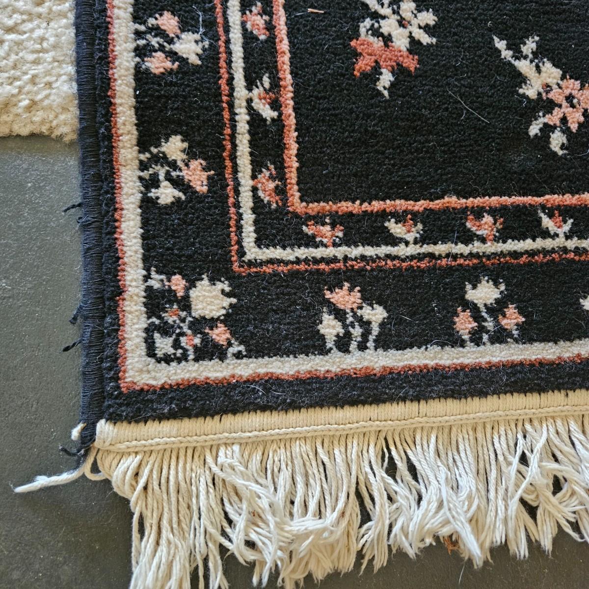A pair of matching Florette rugs with a black aground and a floral pattern. The area rug measures approximately 8'6" x 5'6" and includes a rug slip pad. The runner measures approximately 2'4" x 4'4. Local pickup only