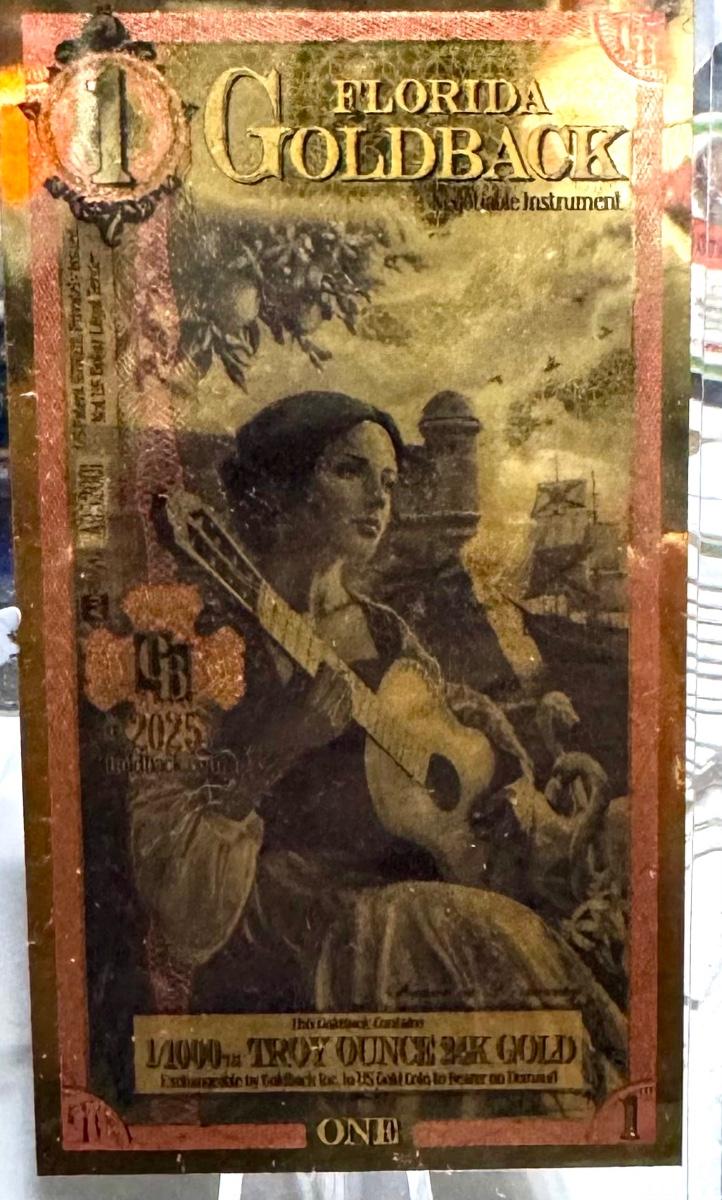 Florida 1 Goldback 2025 Gold Foil Note 1/1000th Troy Oz 24KT Currency Bullion