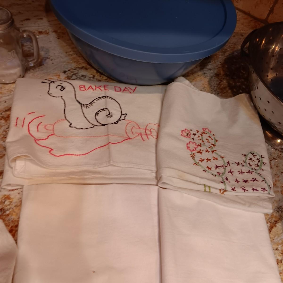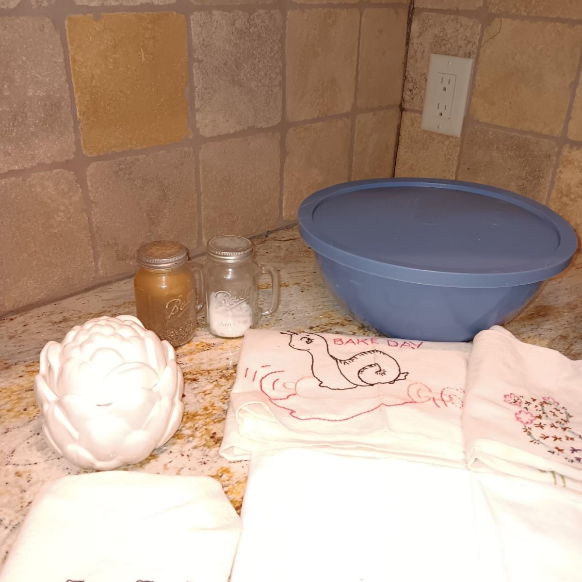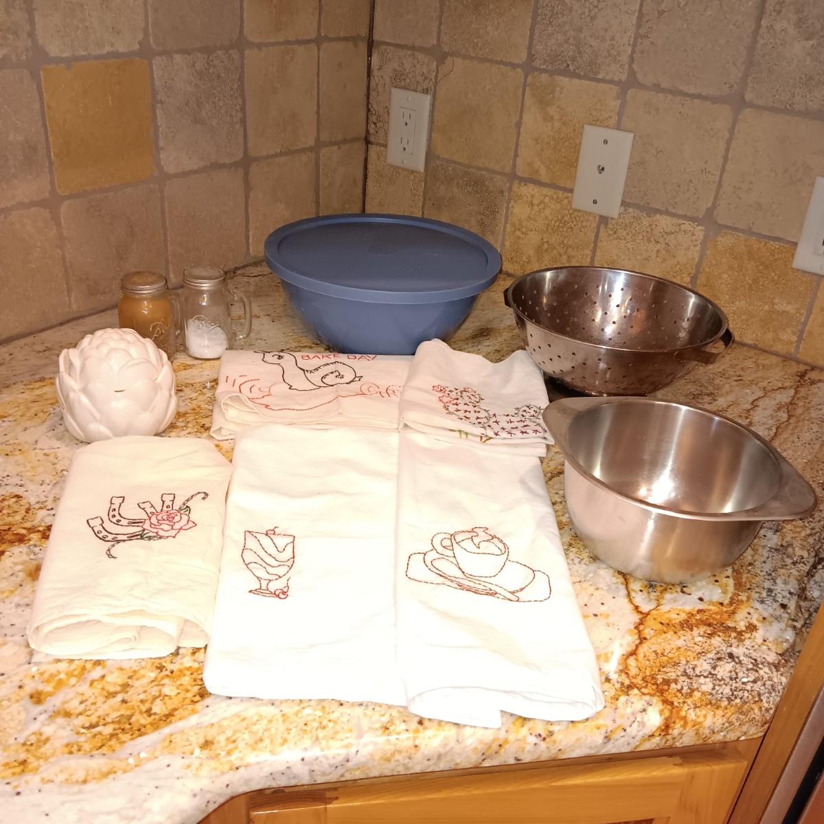 FLOUR SACK DISH TOWELS, BOWLS, SHAKERS AND SUGAR BOWL