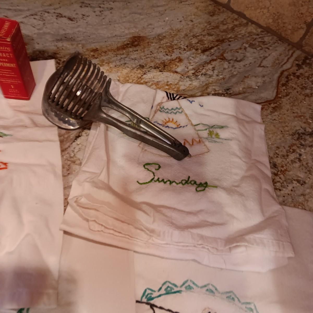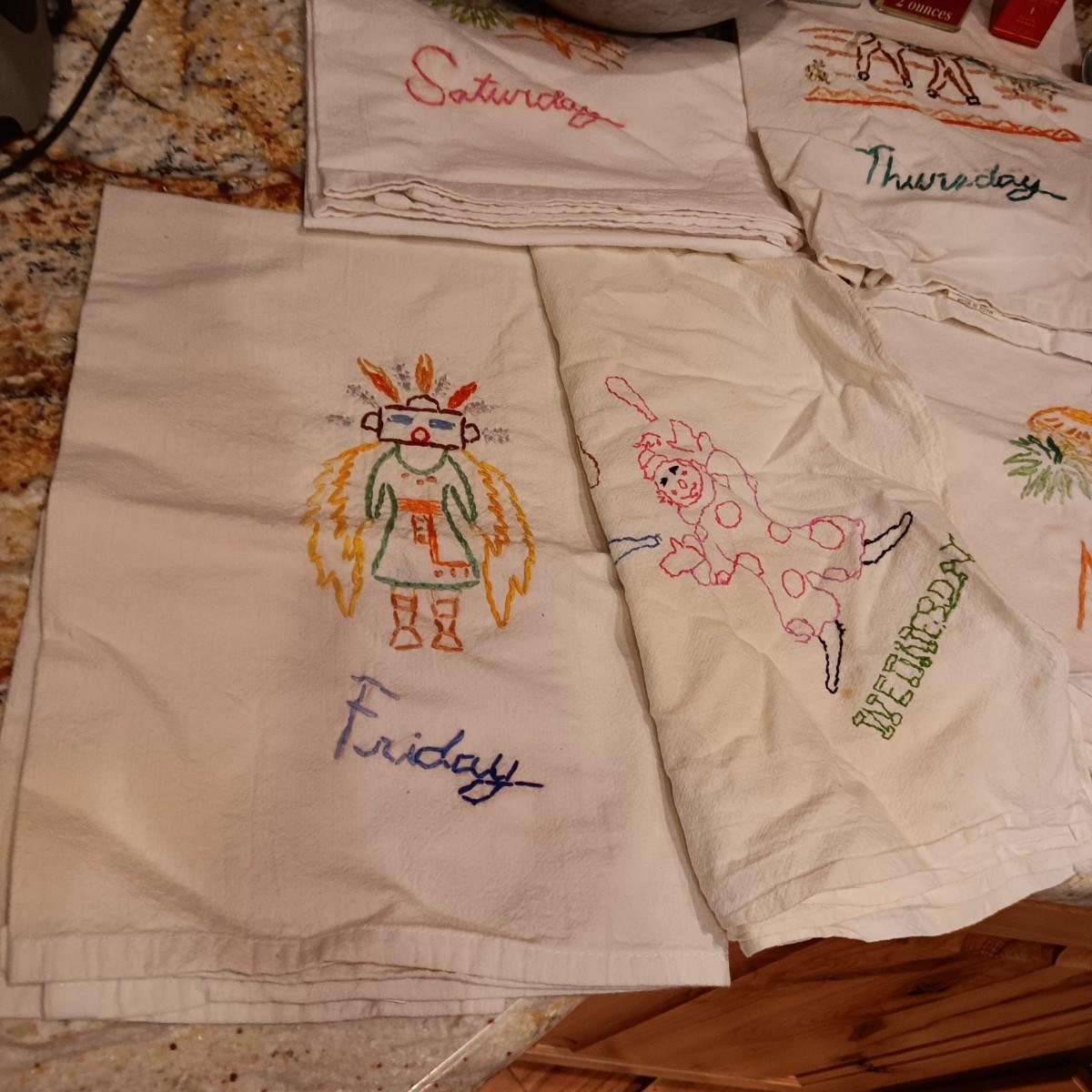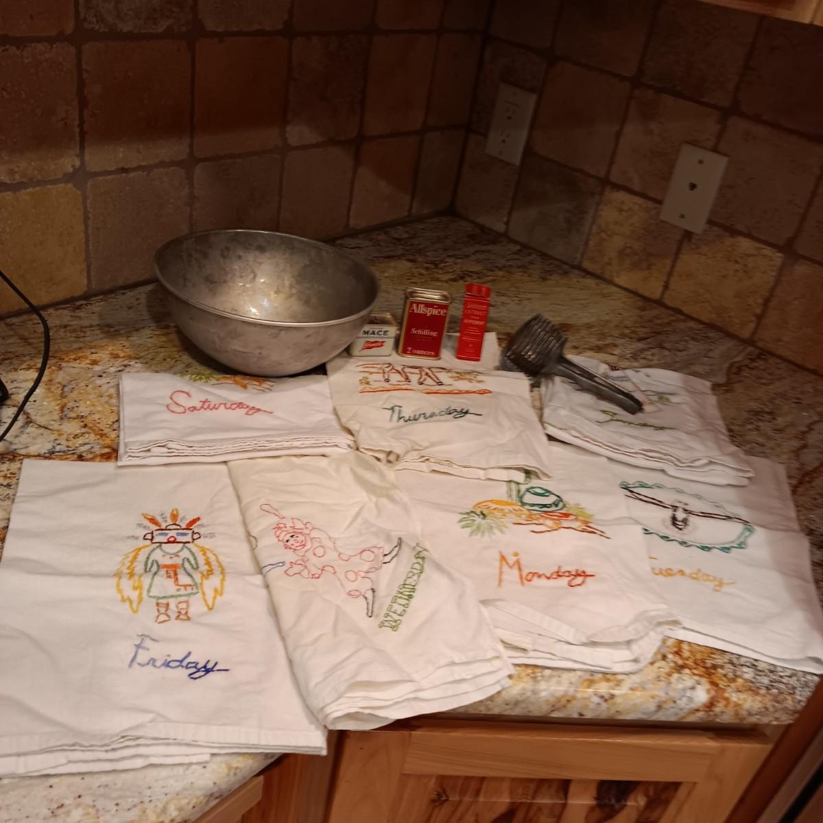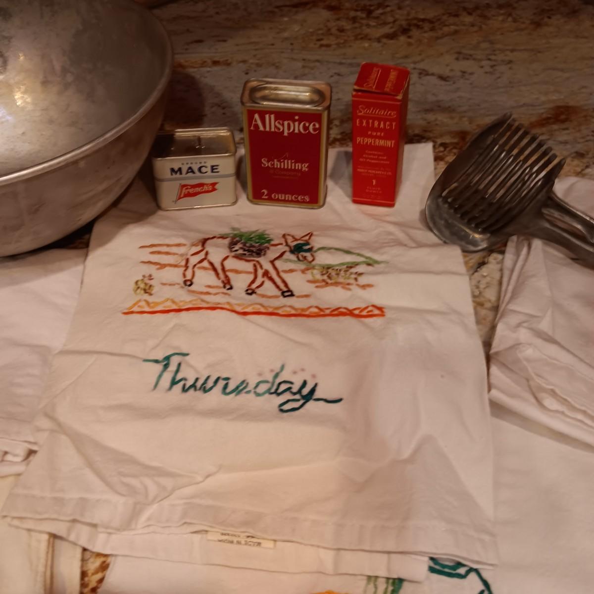FLOUR SACK EMBROIDERED DISH TOWELS, OLD SPICE CONTAINERS AND MORE