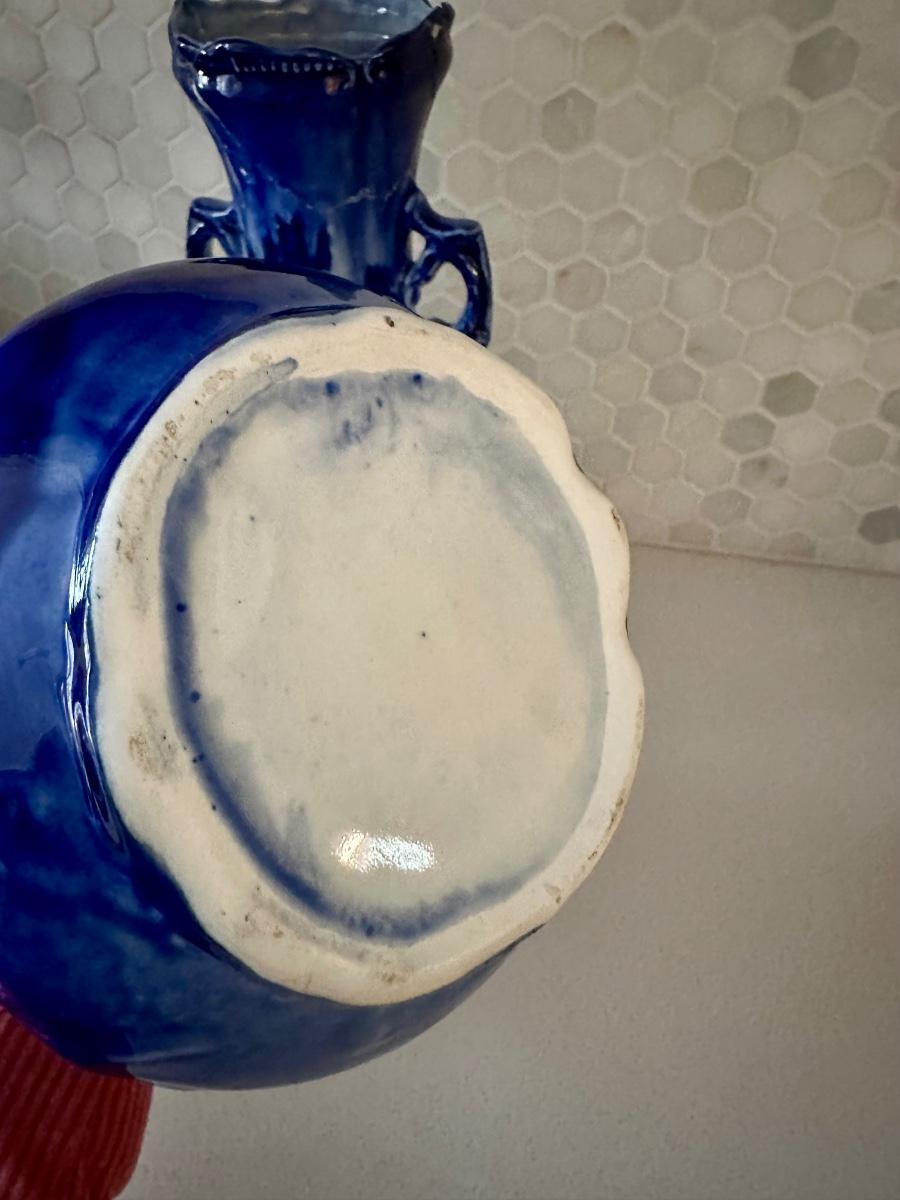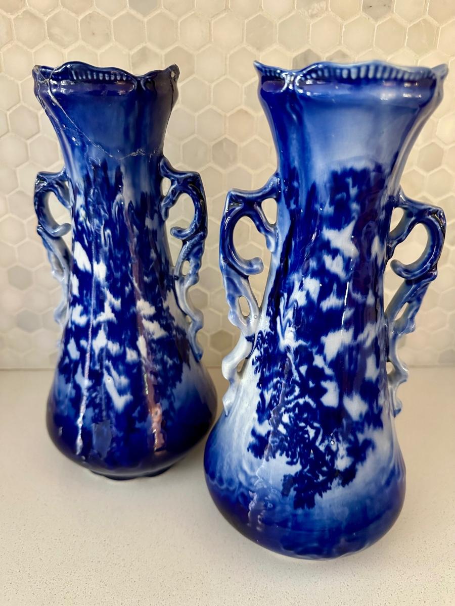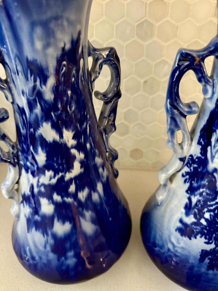 DOUBLE HANDLE FLOW BLUE VASE PAIR, ONE HAS BEEN REPAIRED