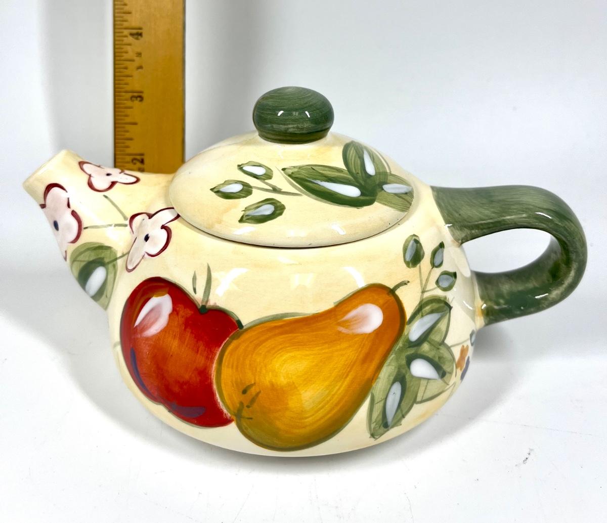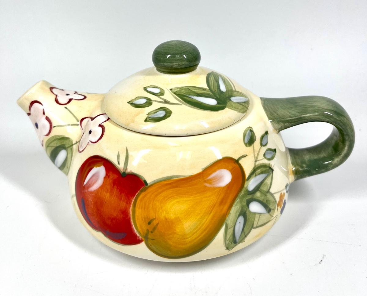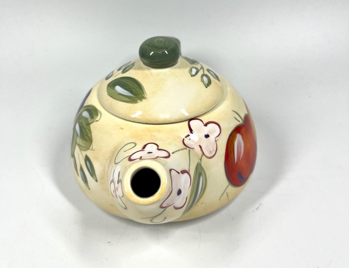Fruit and Flower Ceramic Teapot with Green Trim. In good condition.