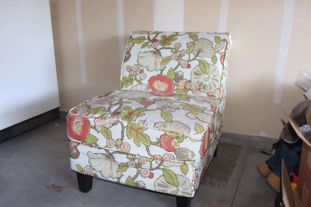 A charming armless chair featuring a floral design, perfect for adding a touch of nature and color to your decor.