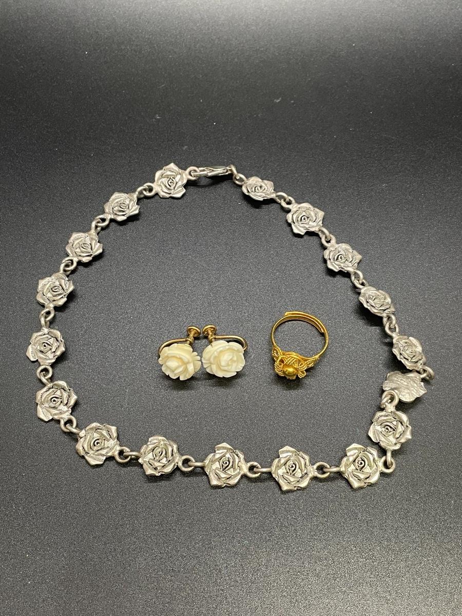 All items are in great condition. This set includes: One gold adjustable flower ring, one pair of clip-on earrings, and one silver flower necklace. The necklace is not adjustable.