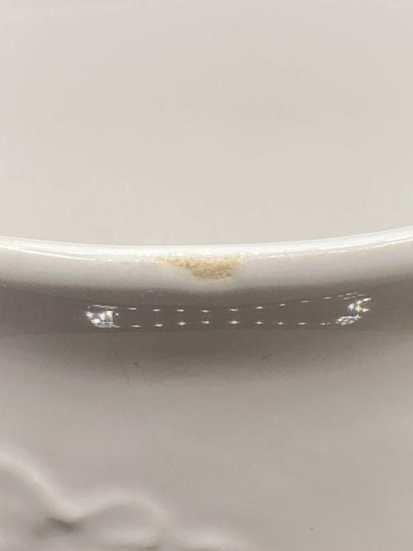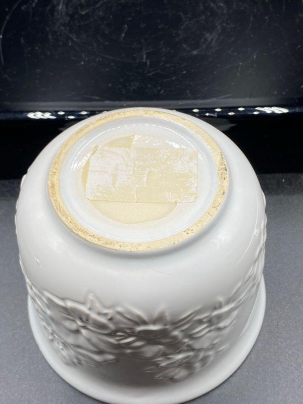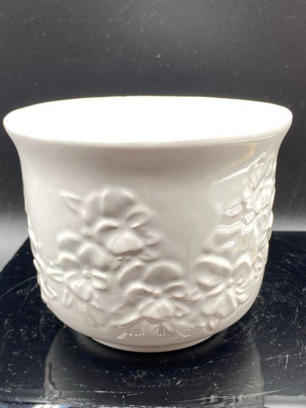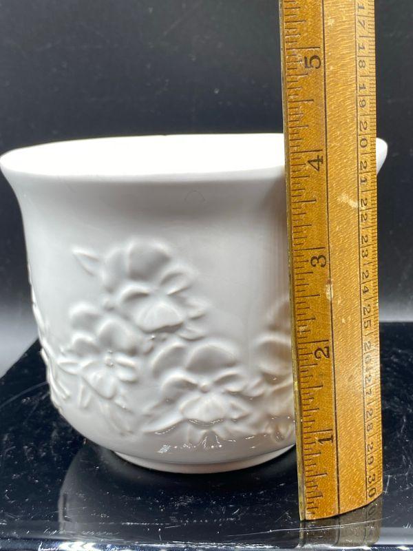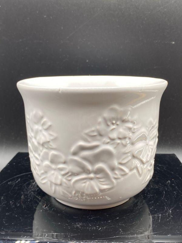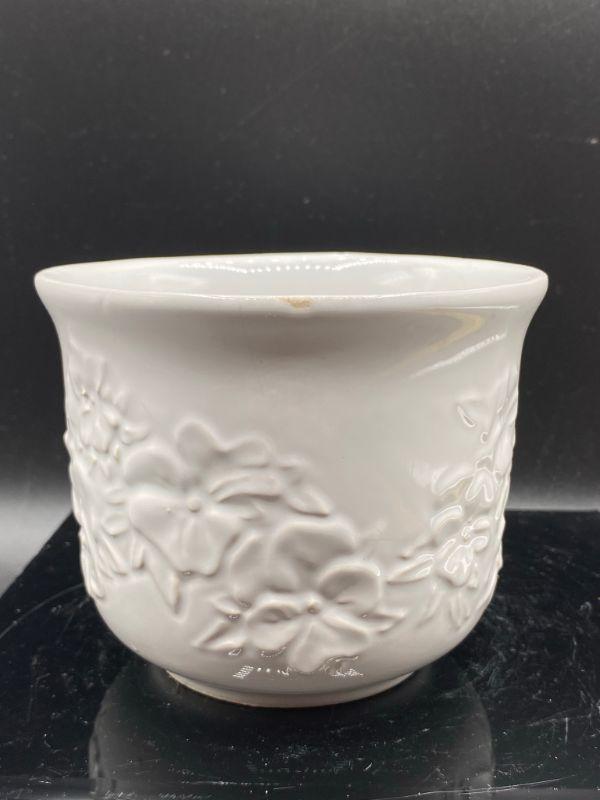 Small white planter with flower embossed design. About 5". Has a small chip in the rim.
