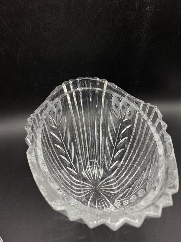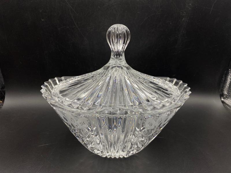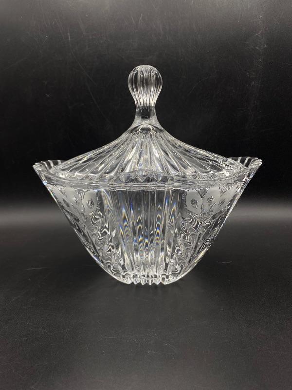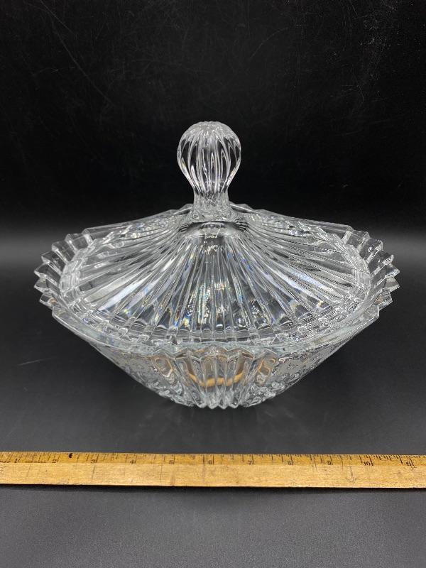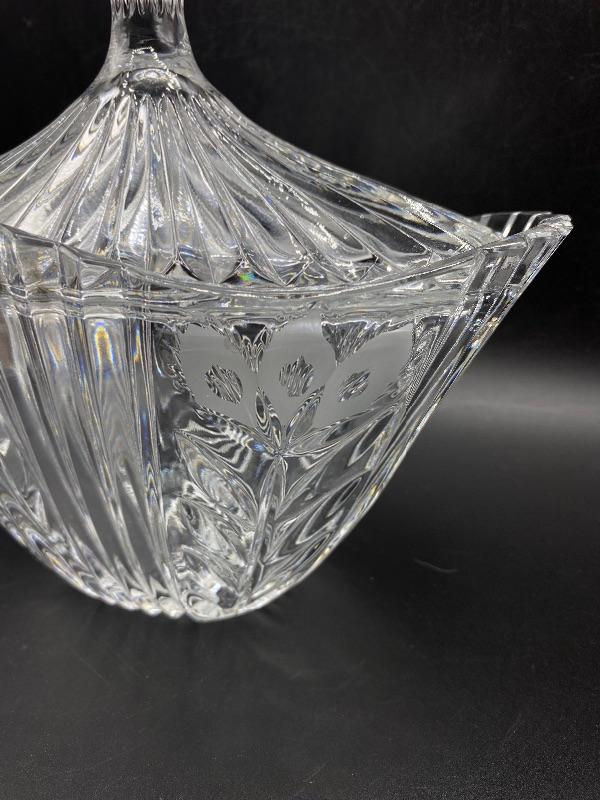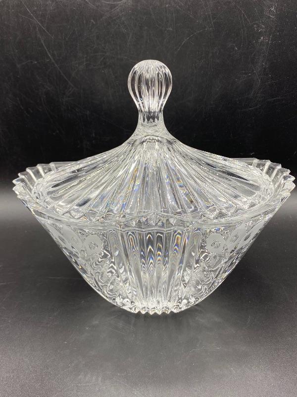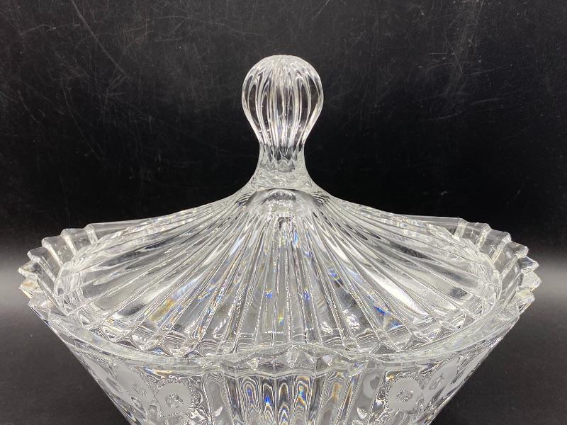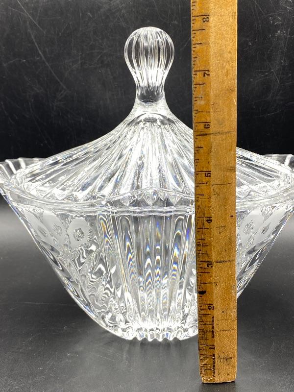 Beautiful floral etched candy dish. Clear ribbed crystal, oblong shape. Stands about 8" with lid. Good condition, no chips.