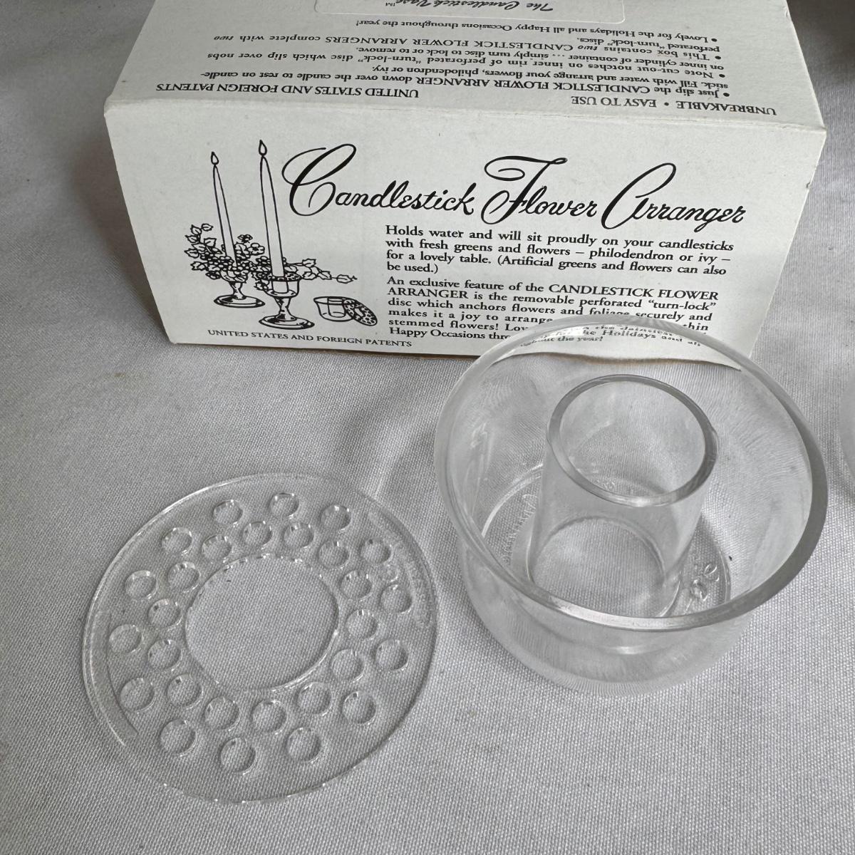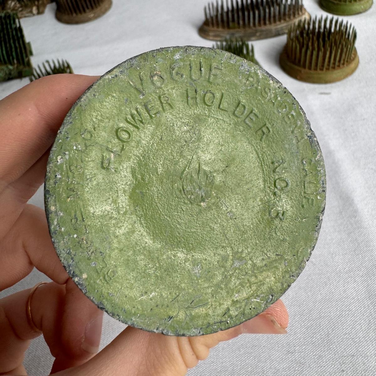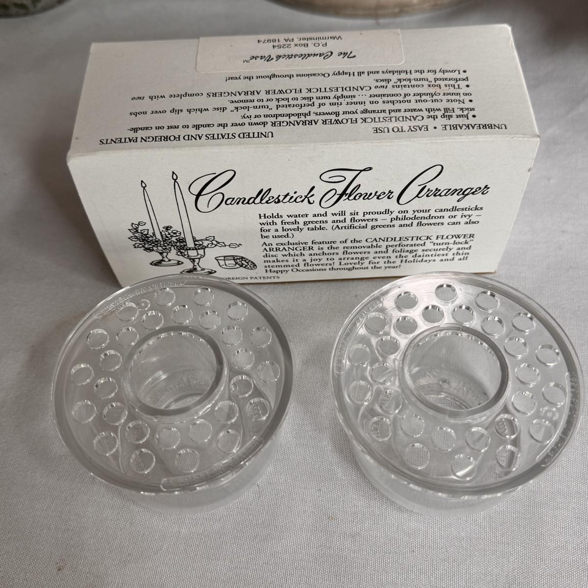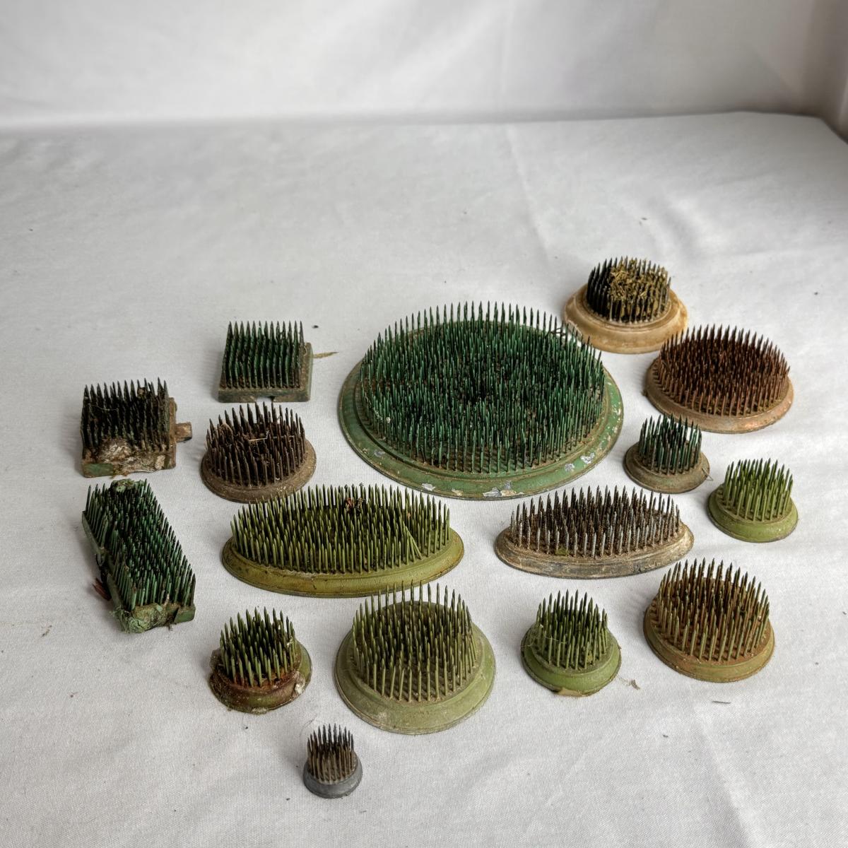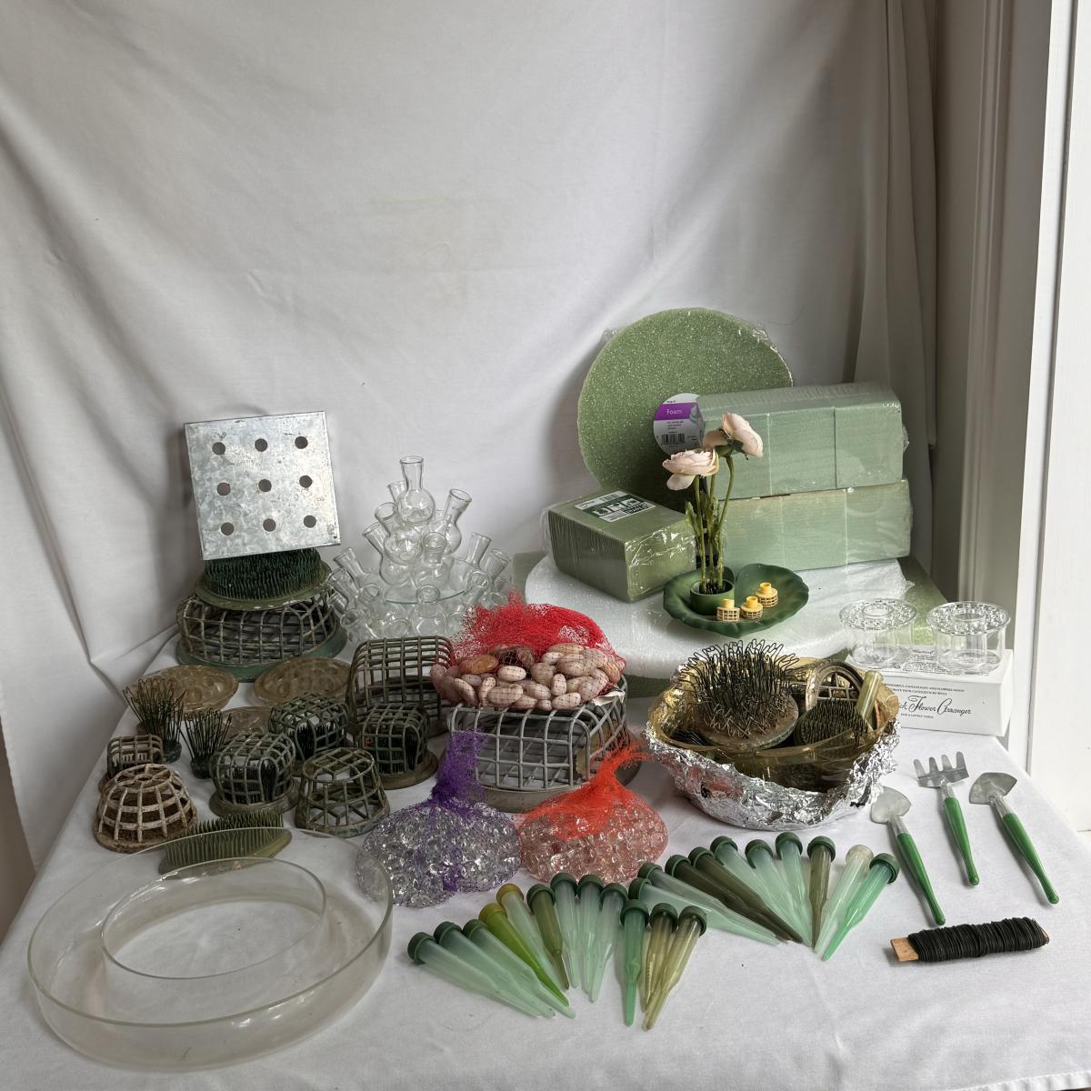 This lot includes over thirty flower frogs of different sizes, two candlestick flower arrangements, several plastic floral water picks, two bags of marbles, one bag of rocks, three piece mini garden tool set, seven pieces of foam in various sizes, one glass propagation display with several vases, one ceramic lily pad with flower frog in the middle, and a handful of other flower arrangement accessories. The largest piece of foam is the rectangle that measures 18” x 12” x 2”H.