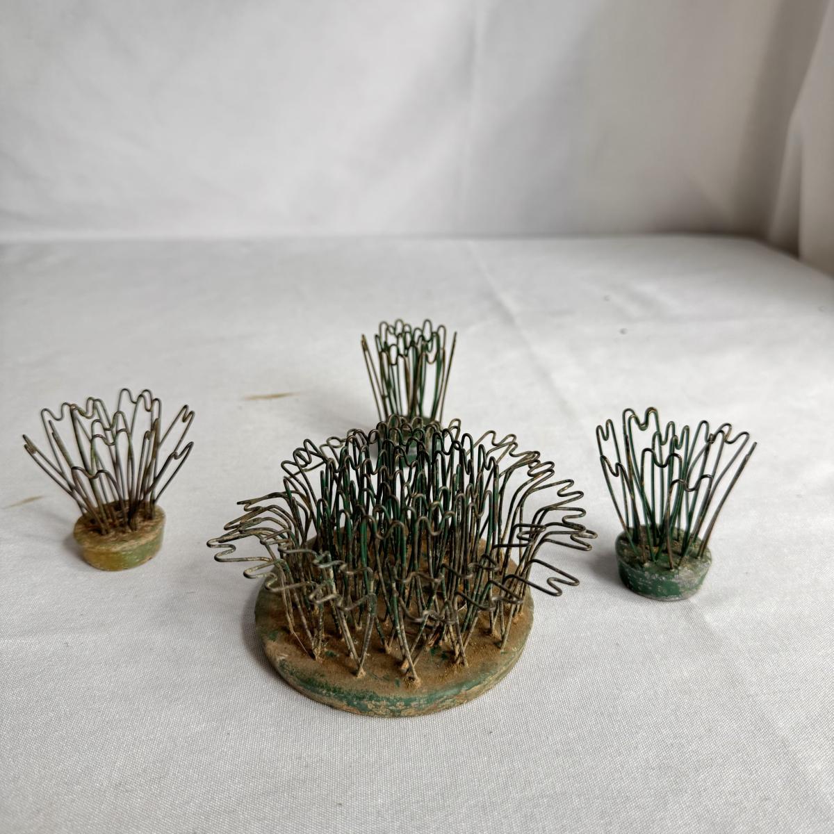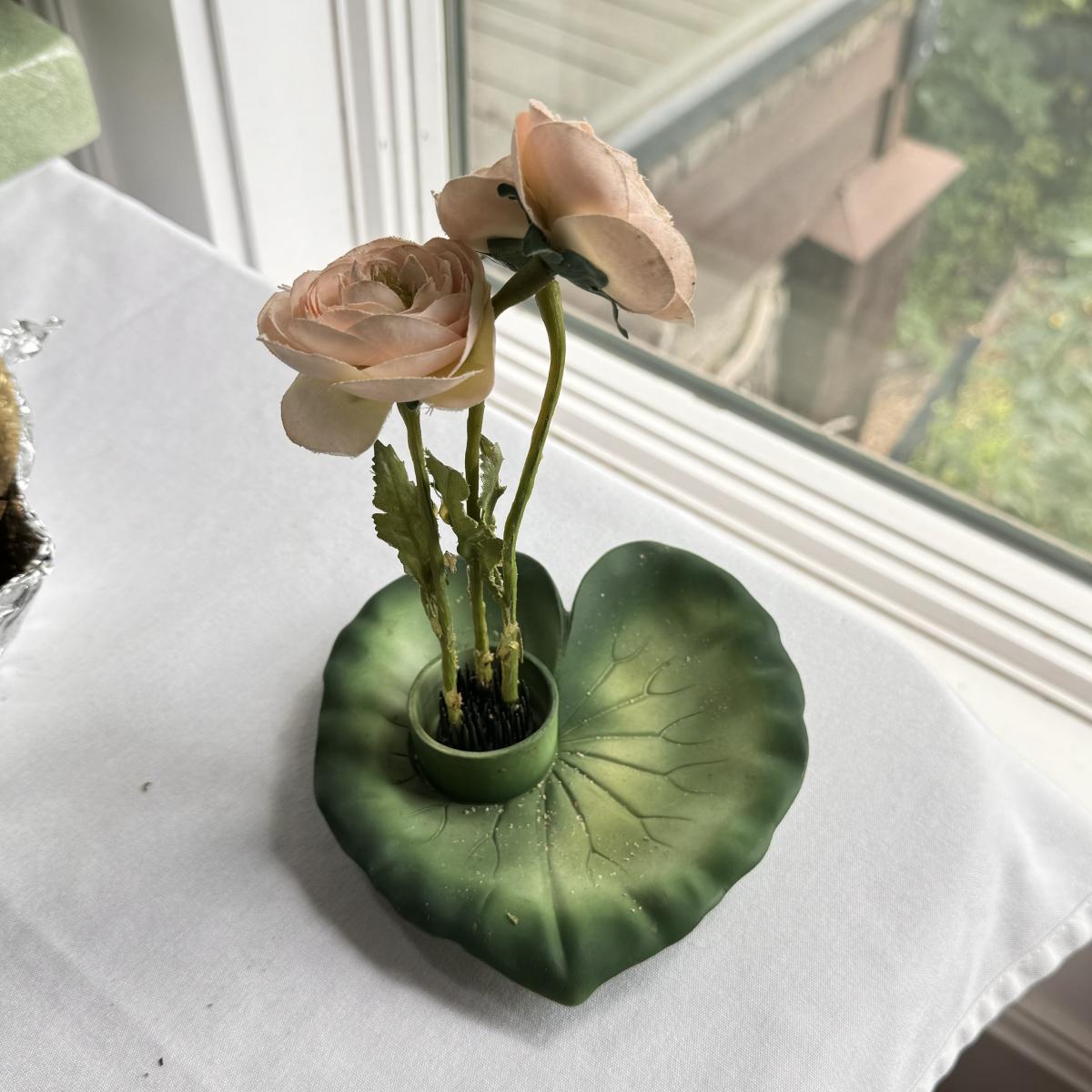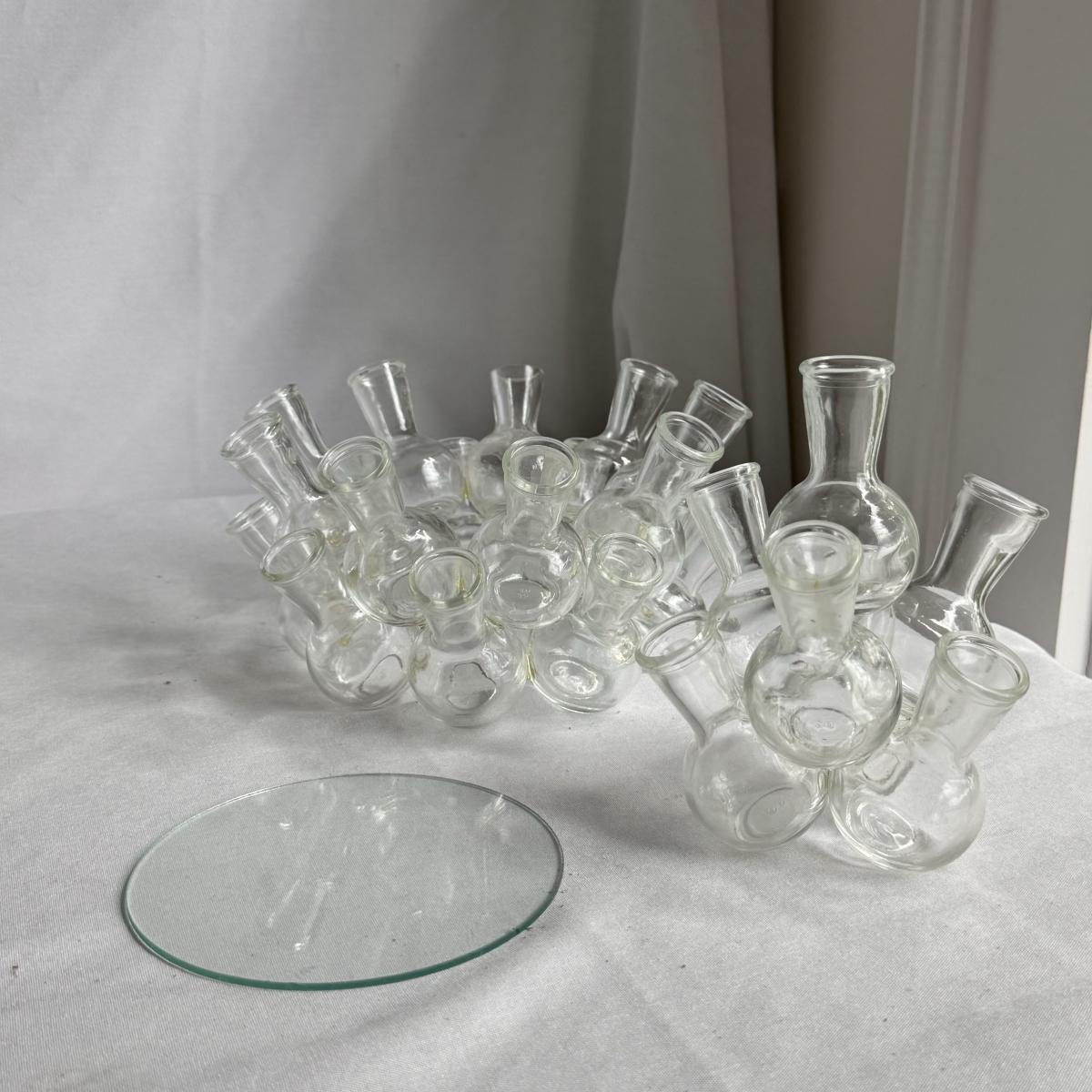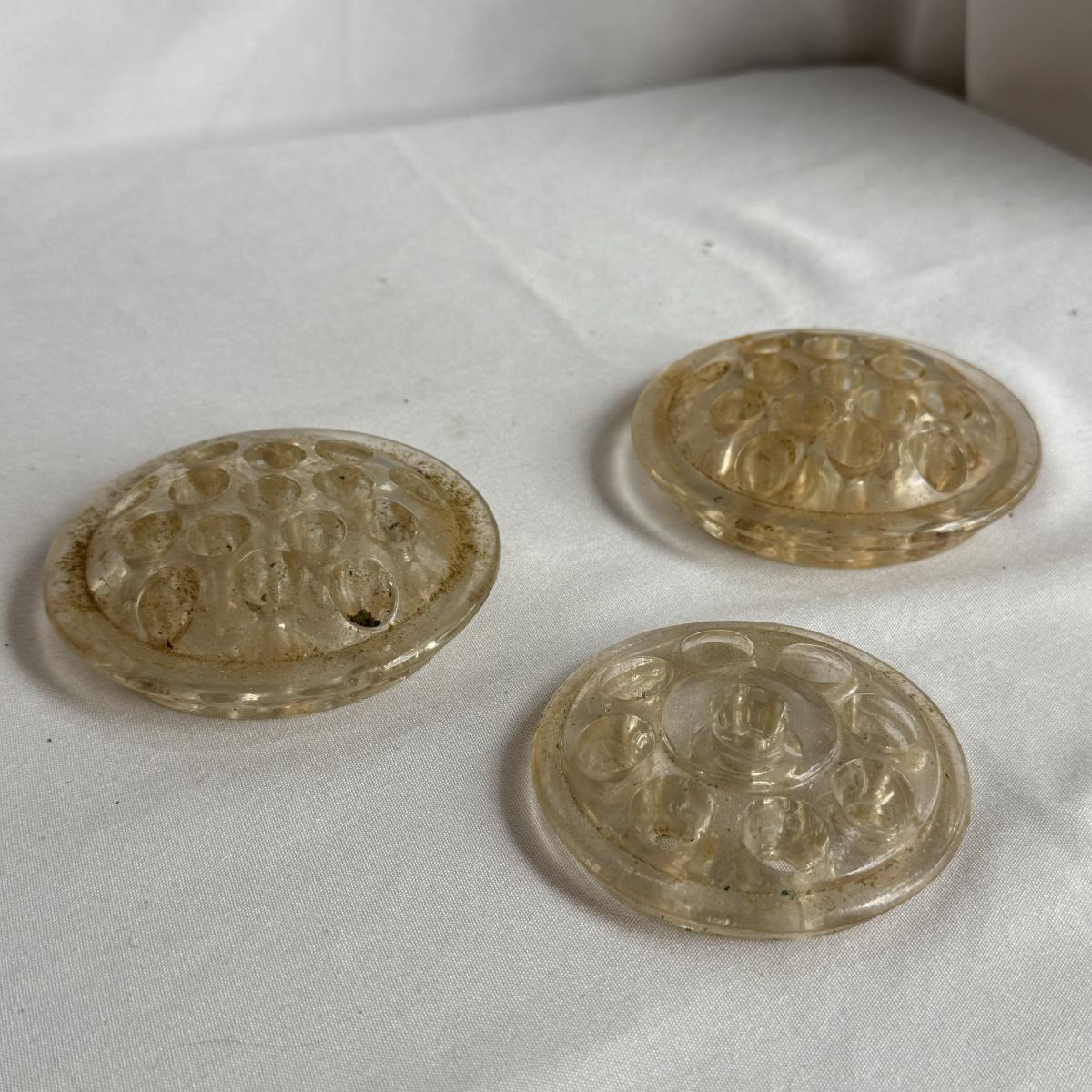 This lot includes over thirty flower frogs of different sizes, two candlestick flower arrangements, several plastic floral water picks, two bags of marbles, one bag of rocks, three piece mini garden tool set, seven pieces of foam in various sizes, one glass propagation display with several vases, one ceramic lily pad with flower frog in the middle, and a handful of other flower arrangement accessories. The largest piece of foam is the rectangle that measures 18” x 12” x 2”H.