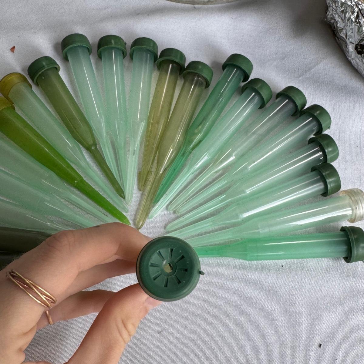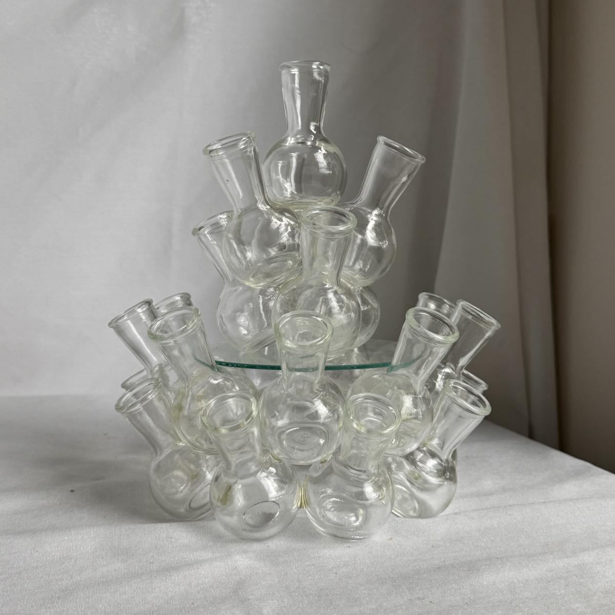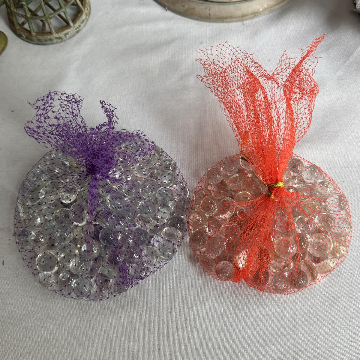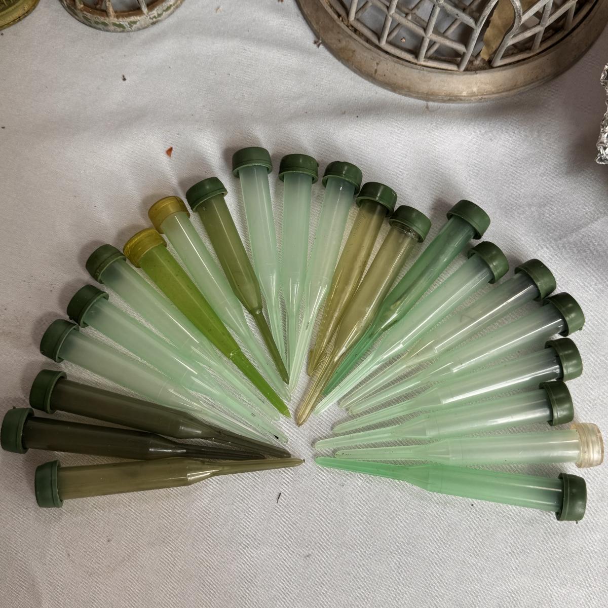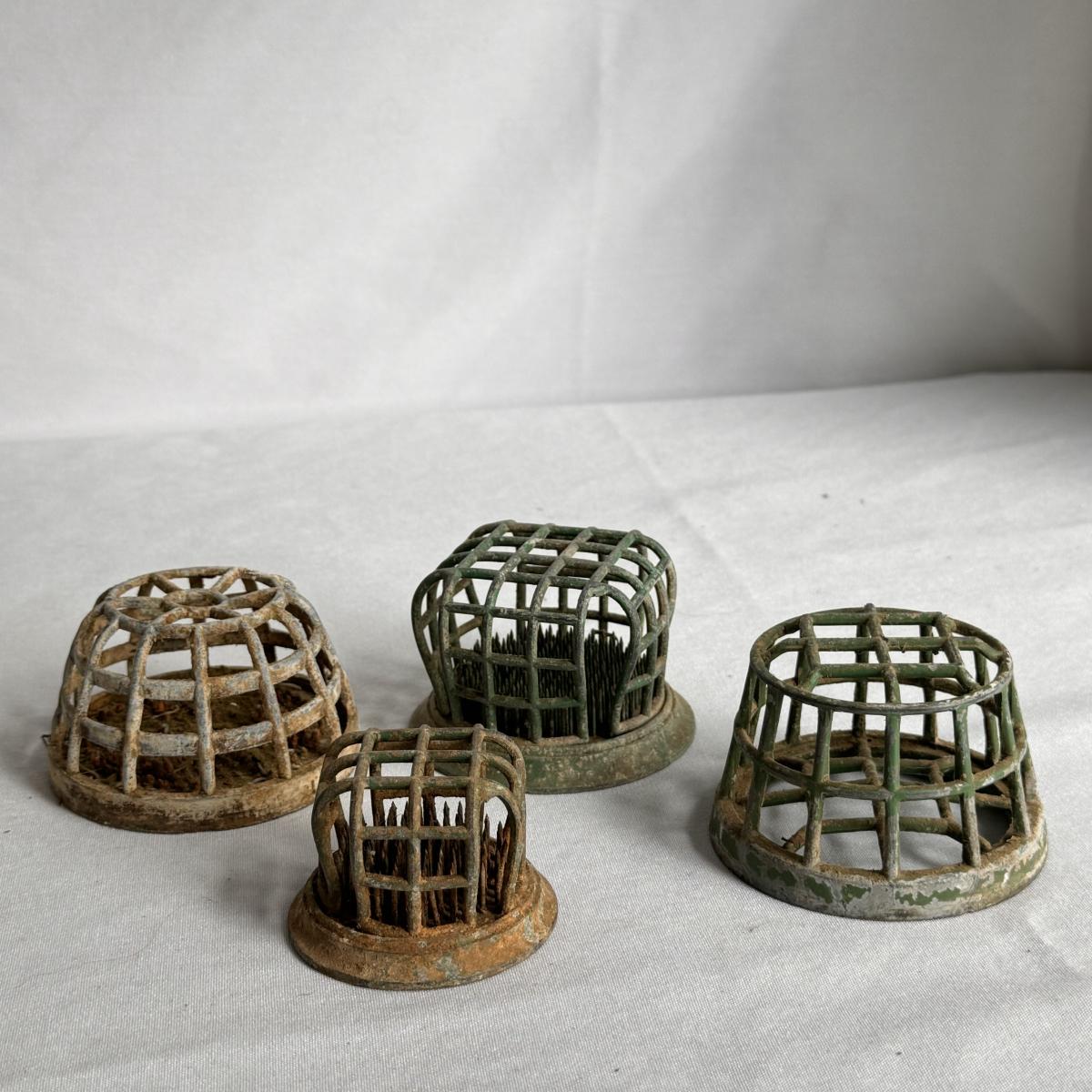 This lot includes over thirty flower frogs of different sizes, two candlestick flower arrangements, several plastic floral water picks, two bags of marbles, one bag of rocks, three piece mini garden tool set, seven pieces of foam in various sizes, one glass propagation display with several vases, one ceramic lily pad with flower frog in the middle, and a handful of other flower arrangement accessories. The largest piece of foam is the rectangle that measures 18” x 12” x 2”H.