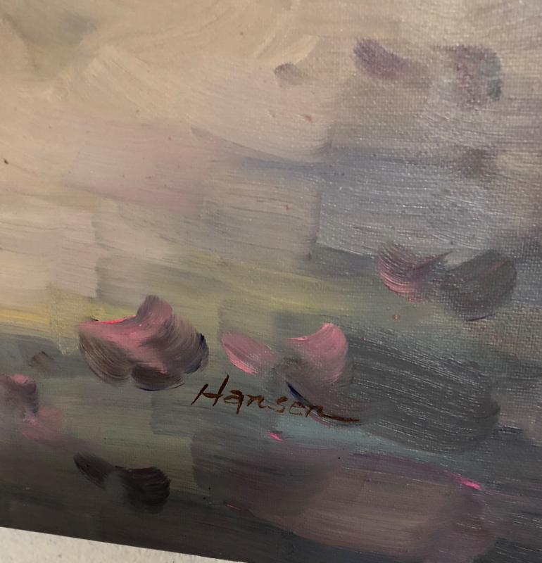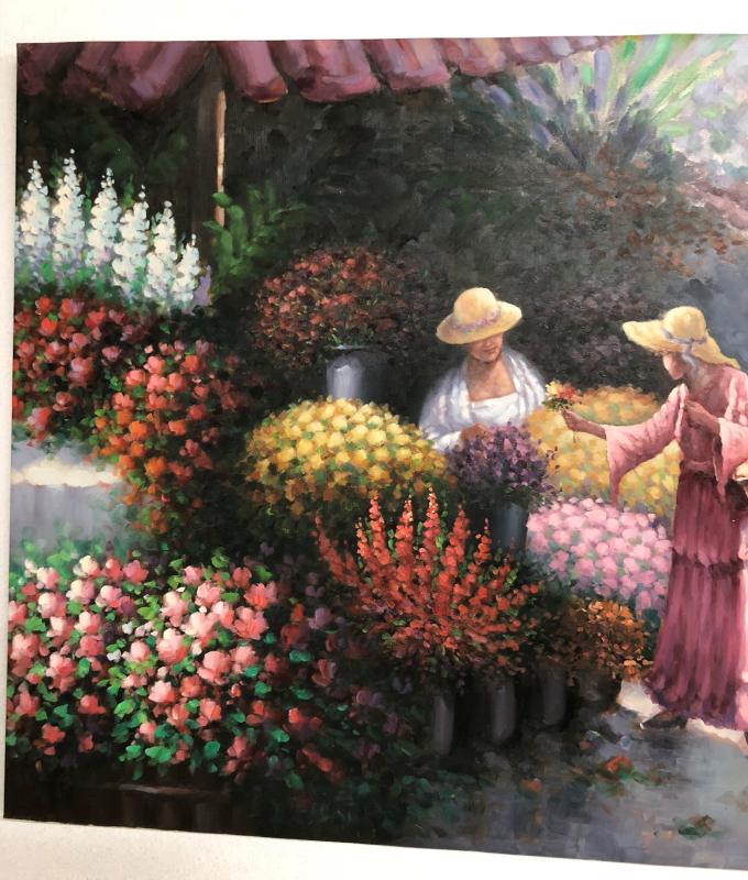Here is a colorful impressionistic style art print of a past flower market by Hansen...24 x 36"...Excellent condition...
