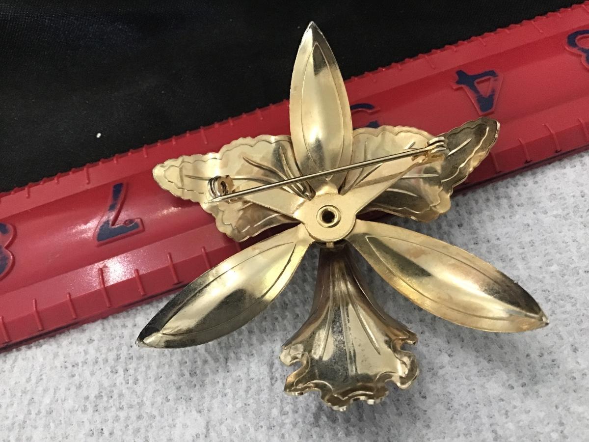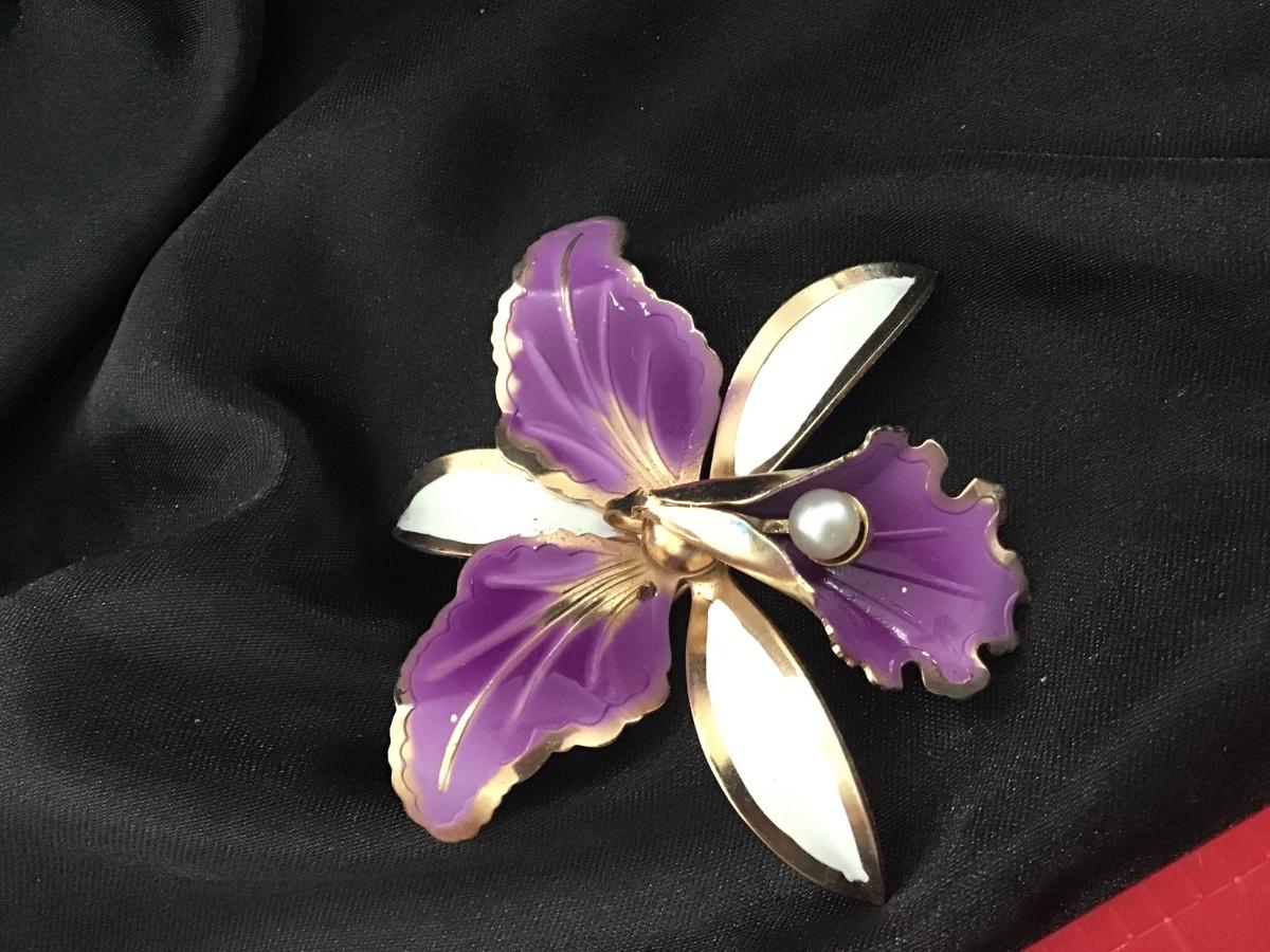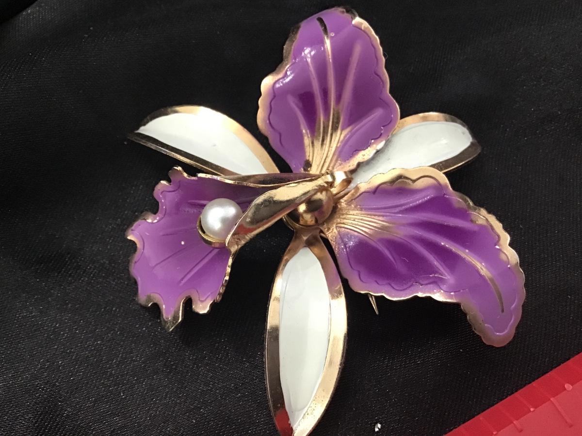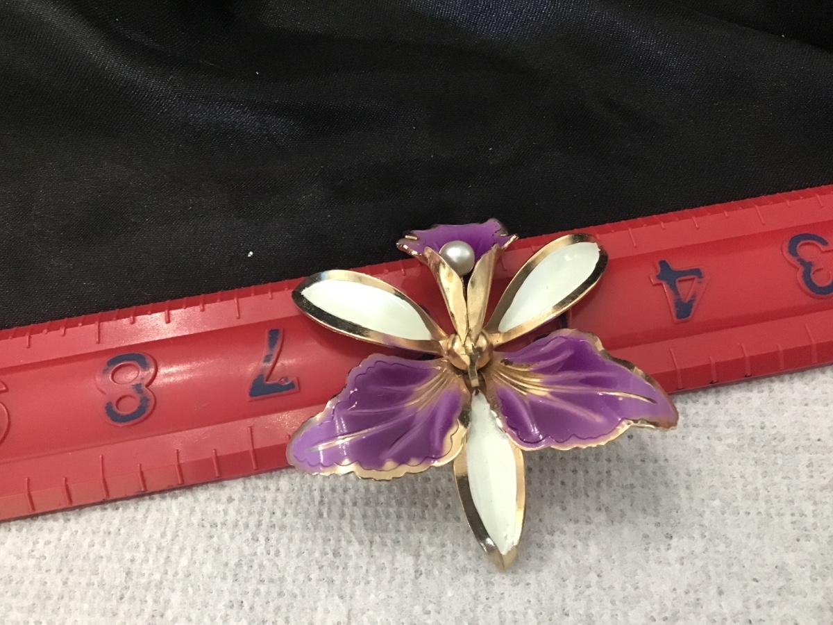Flower Orchid White Purple Enamel Pearl Vintage Gold Brooch Pin