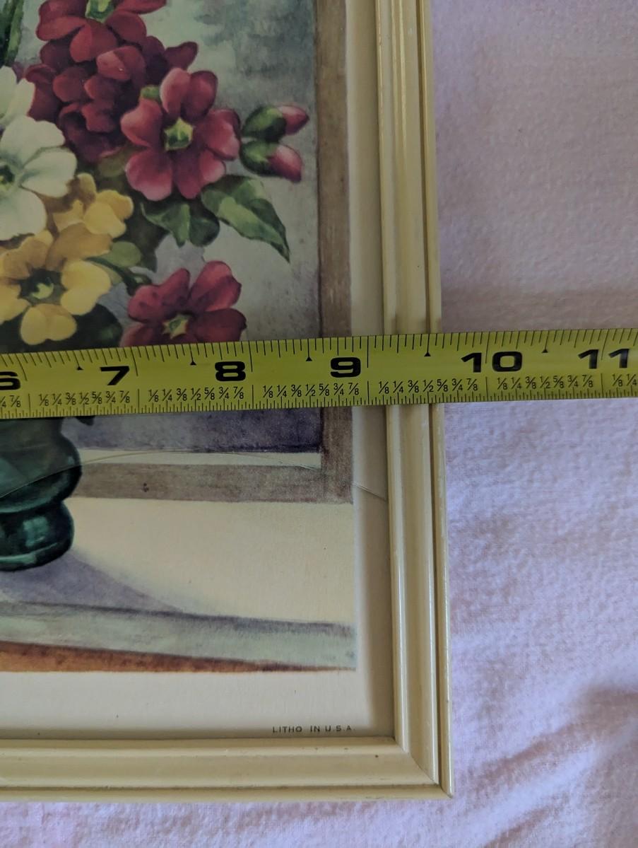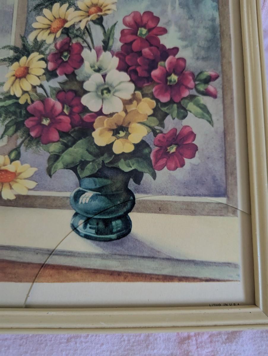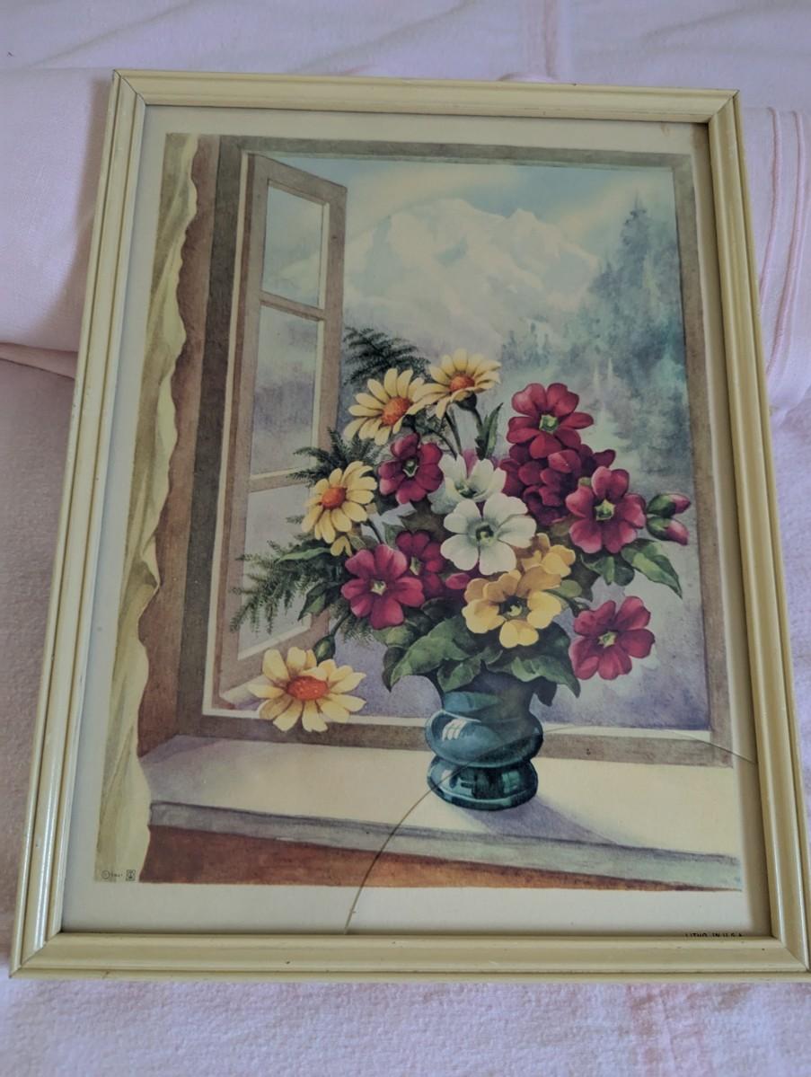 Framed Vintage "Flowers in Window" Print. Glass is Broke, and piece gone.