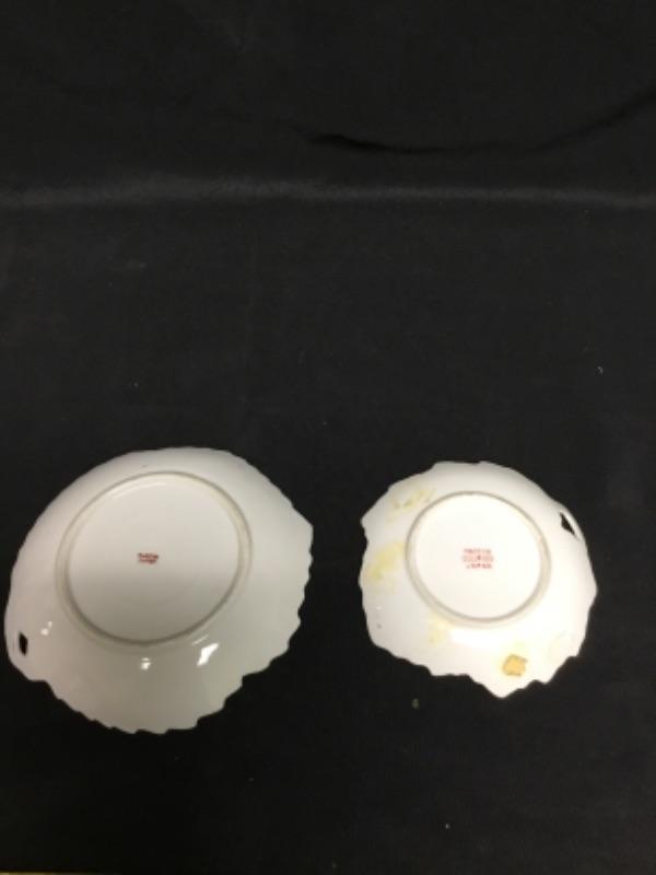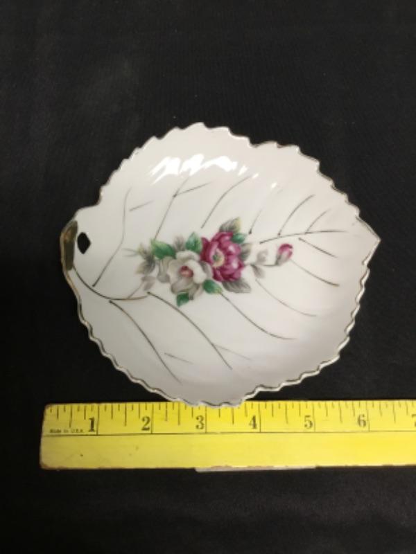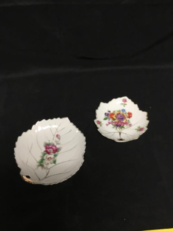 Set of 2 leaf shaped plates Japan. Floral design on both.