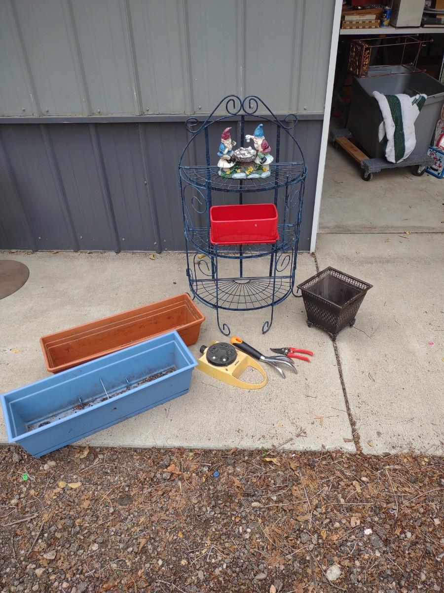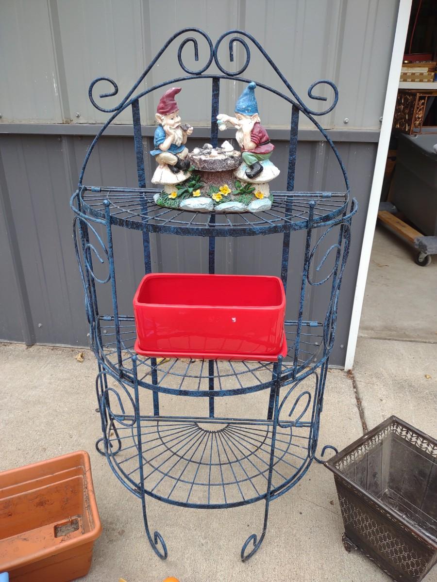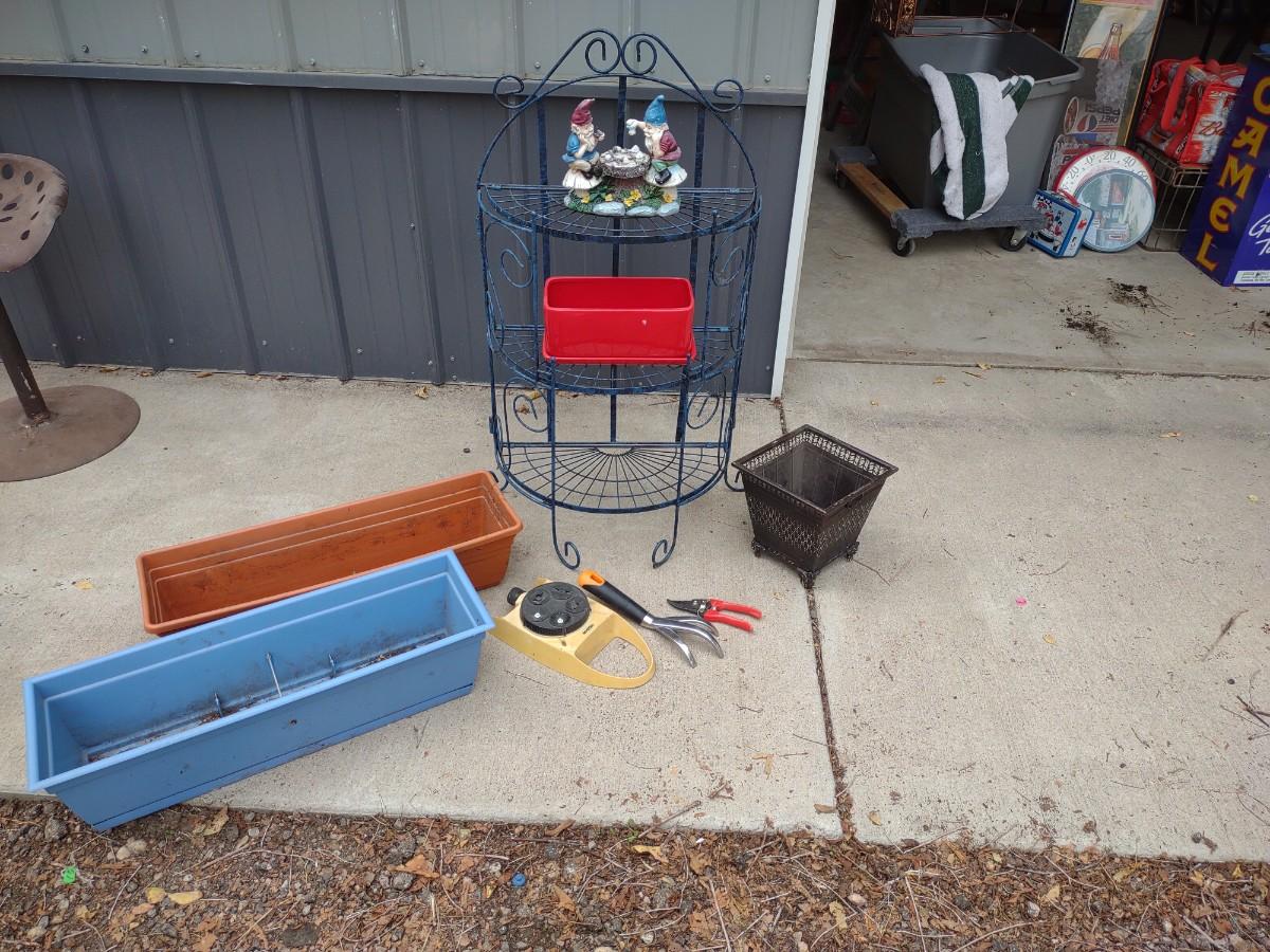 FLOWER POTS, FOLDING METAL SHELF, GARDEN GNOMES & TOOLS