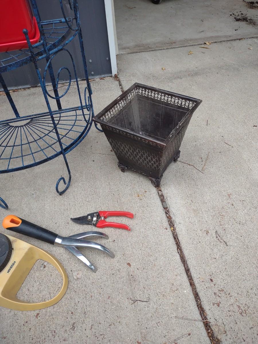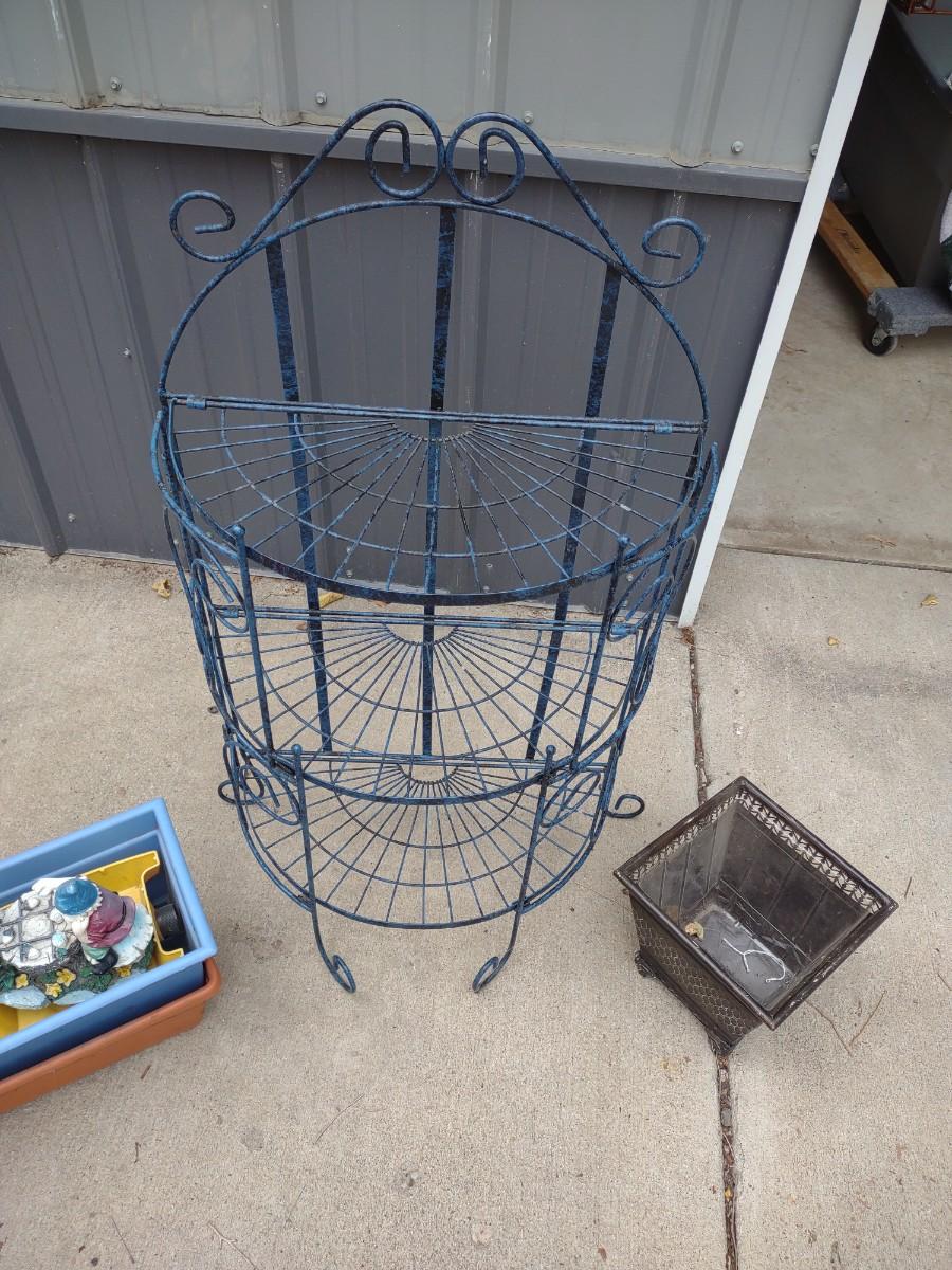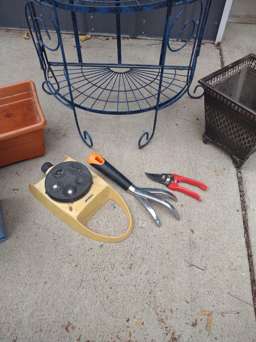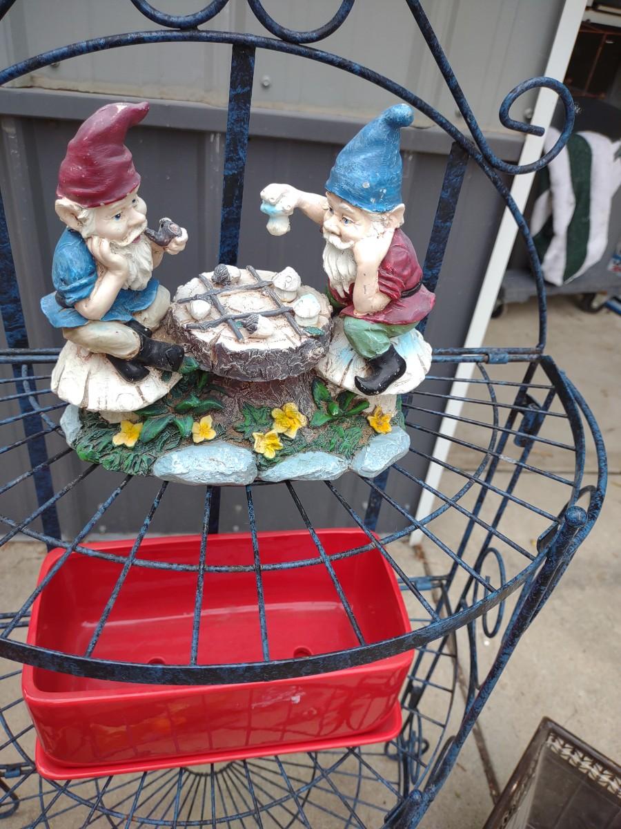 FLOWER POTS, FOLDING METAL SHELF, GARDEN GNOMES & TOOLS
