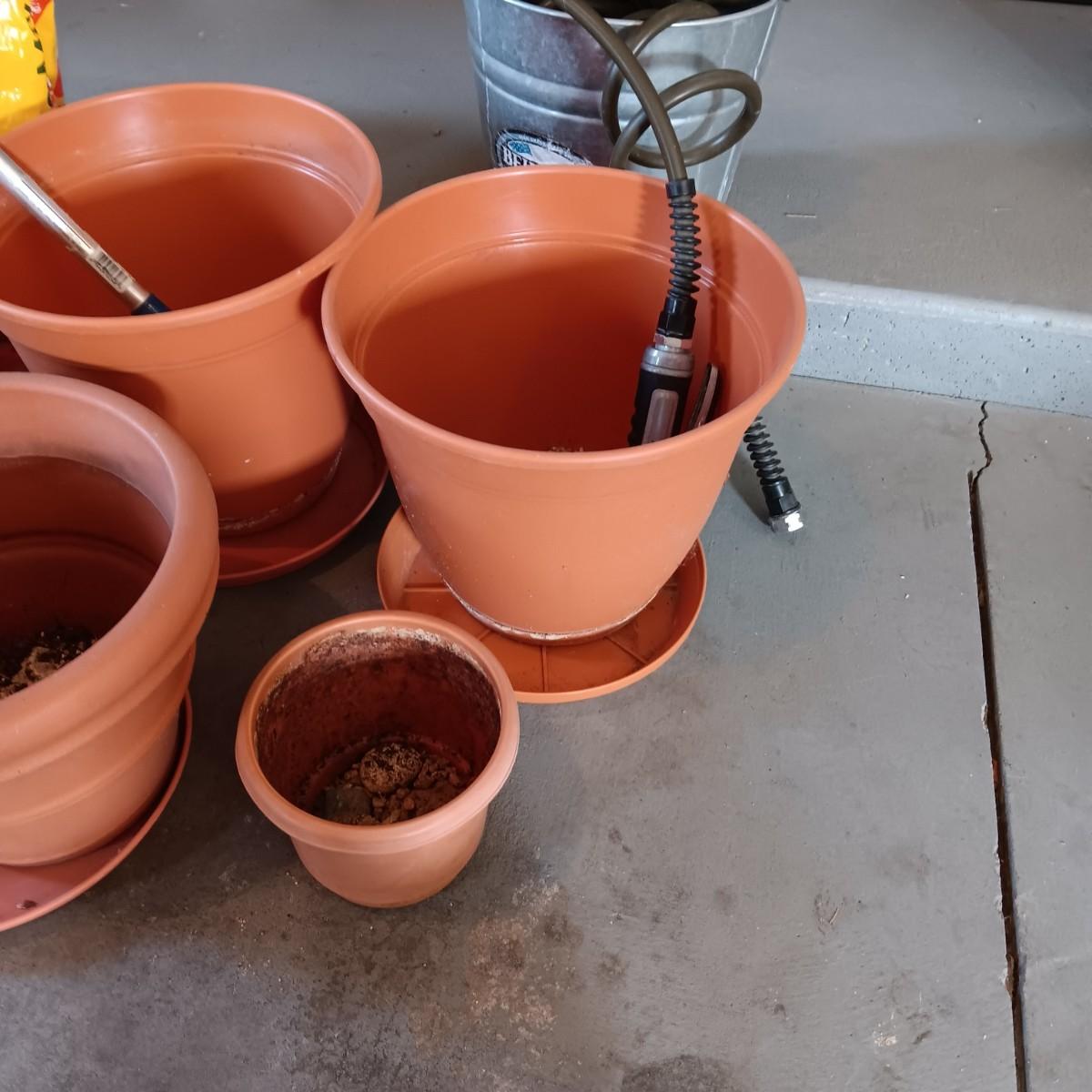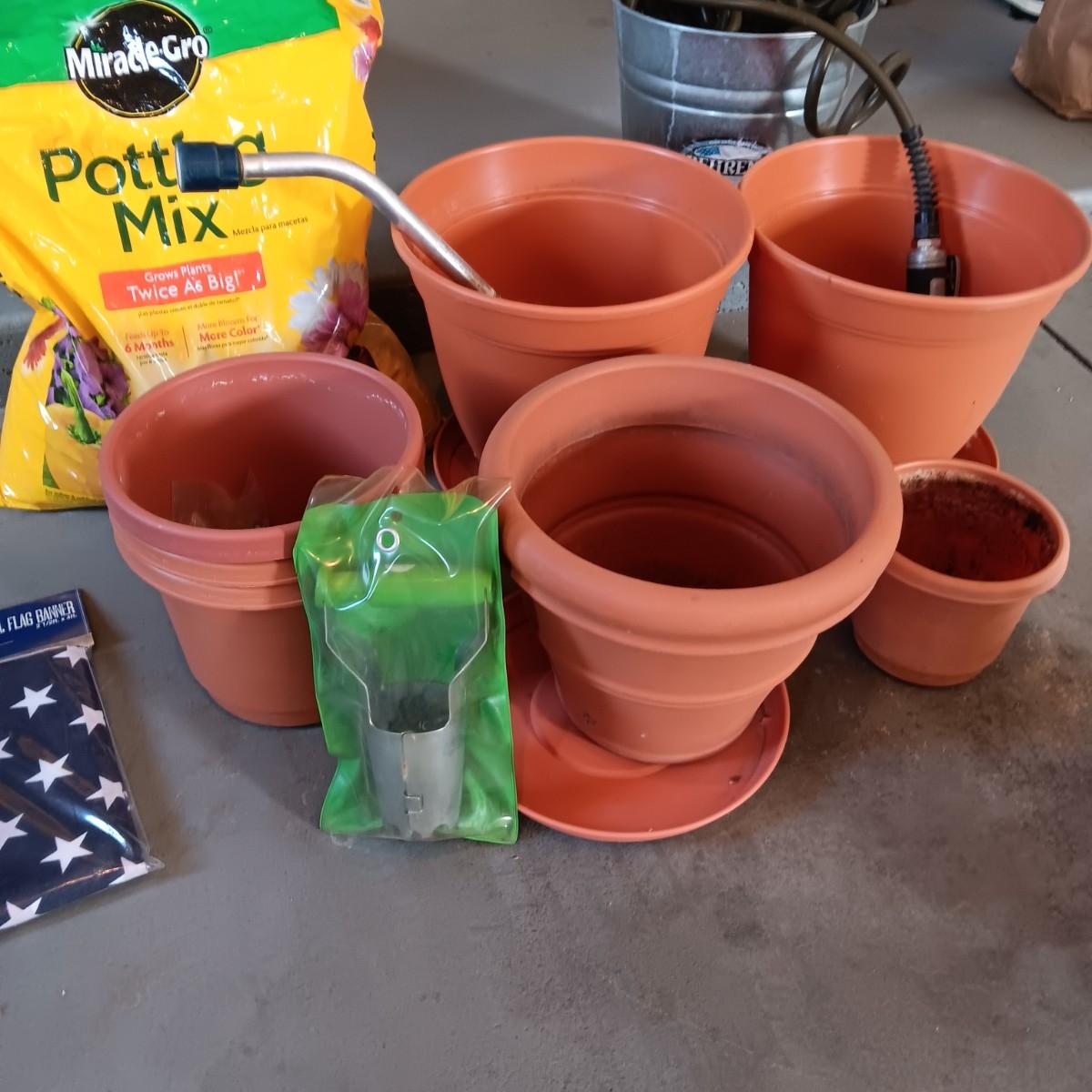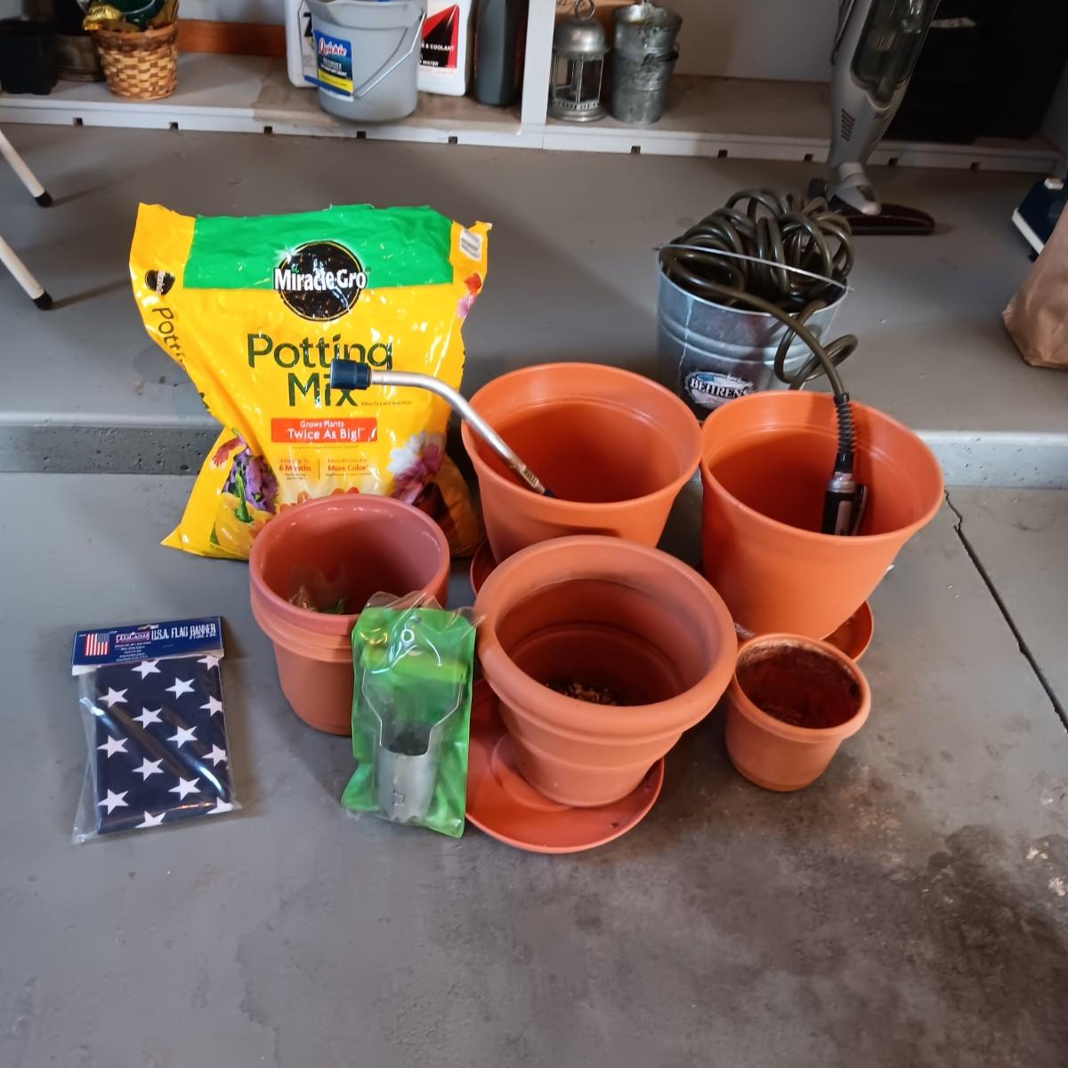 FLOWER POTS, GARDEN HOSE W/SPRAYER, PARTIAL BAG OF SOIL AND MORE