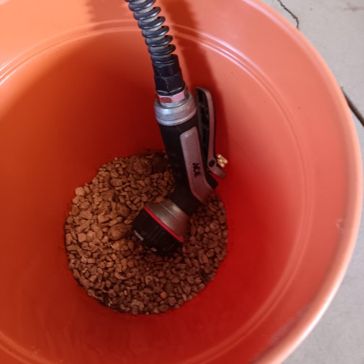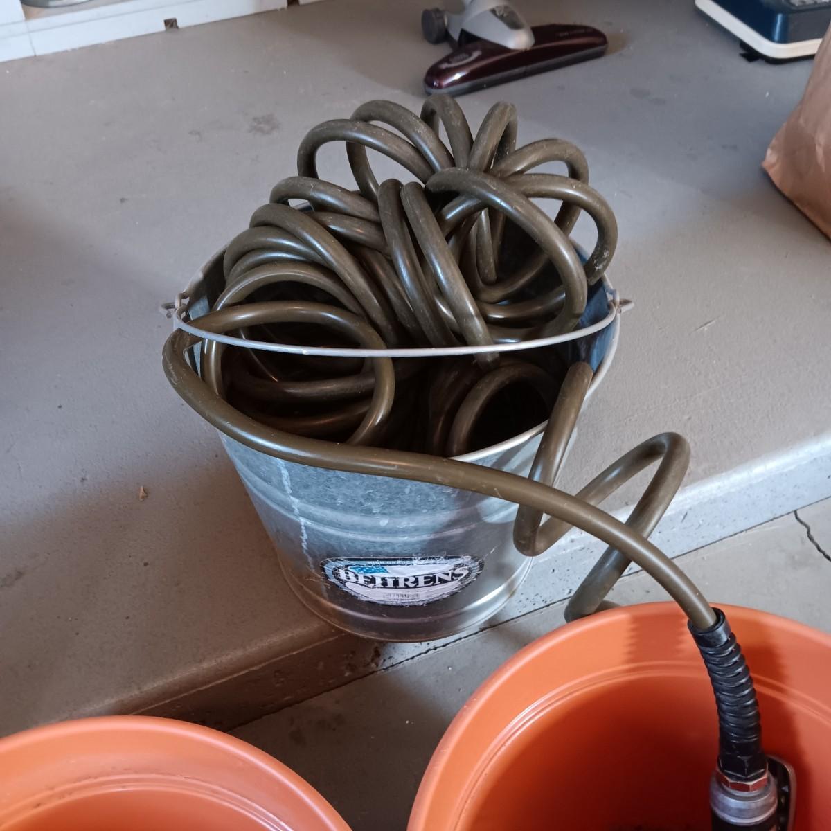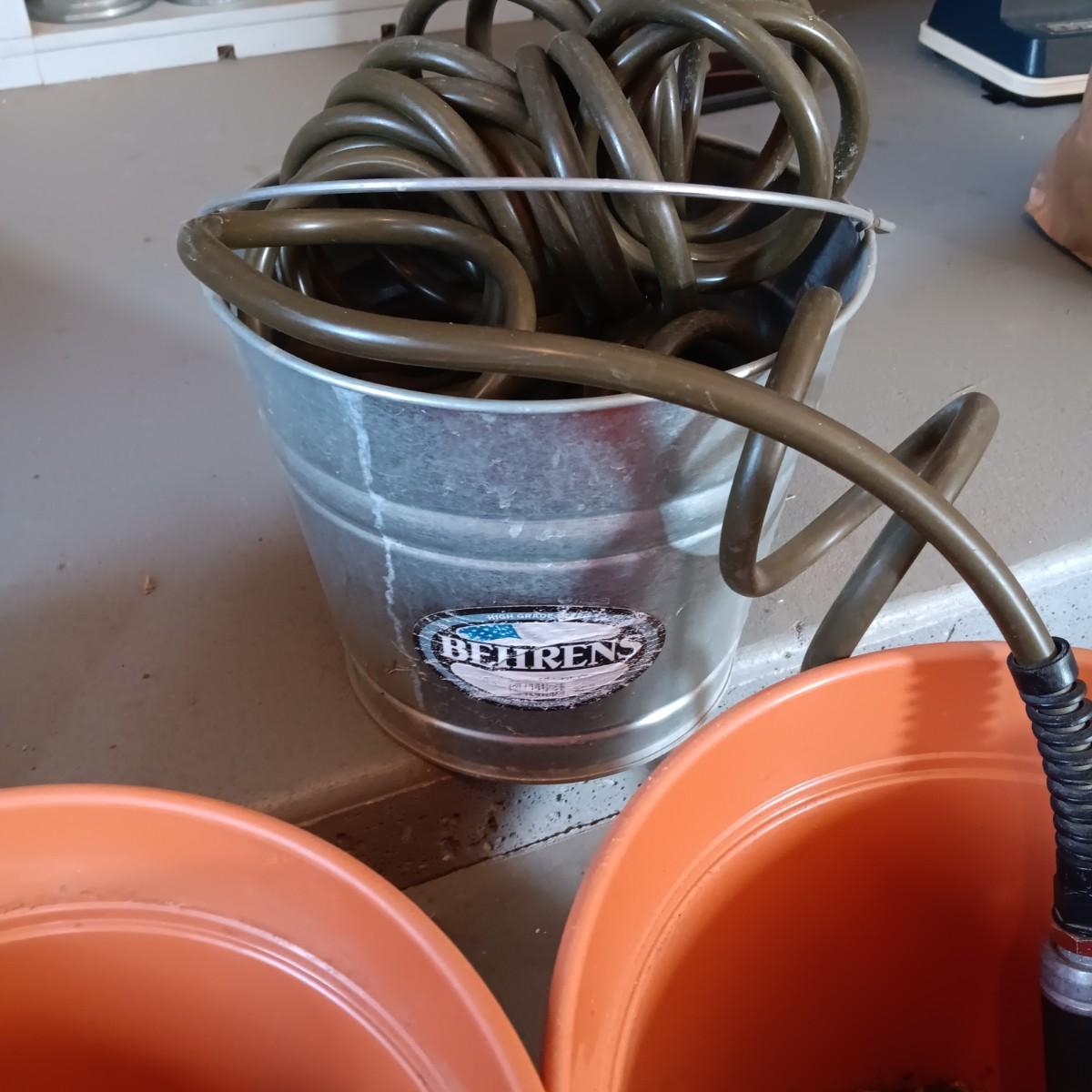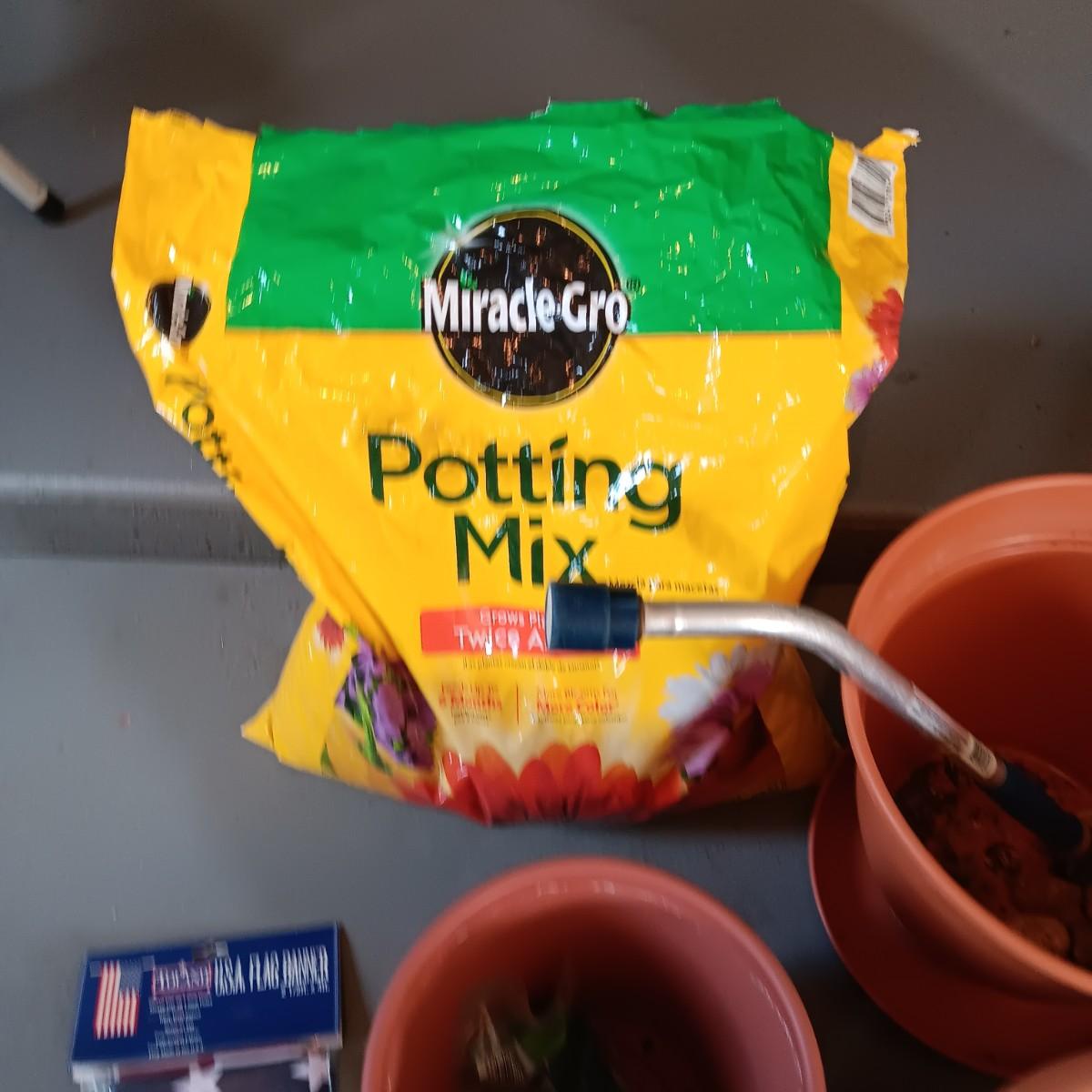FLOWER POTS, GARDEN HOSE W/SPRAYER, PARTIAL BAG OF SOIL AND MORE