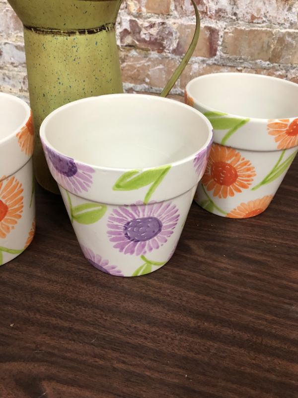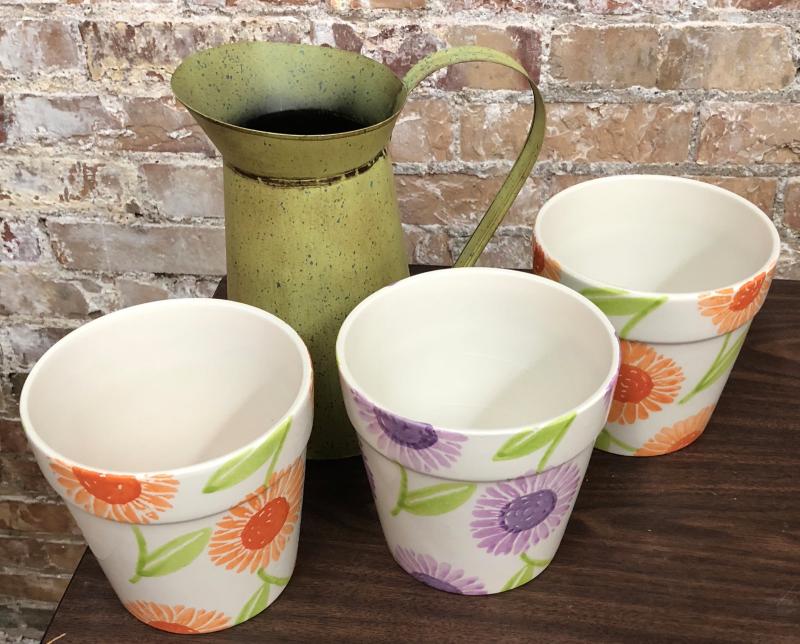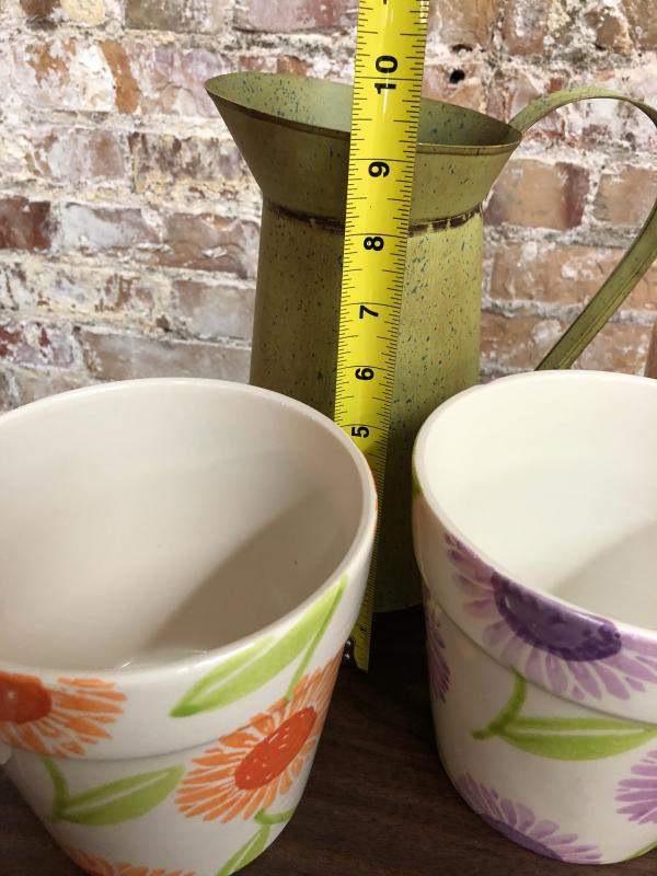 Flower pots with tin water can. If you need shipping please be aware that the cost of shipping may be more than what the item cost. All items ship from zip code 84109, you can go to USPS.com for estimates of cost.