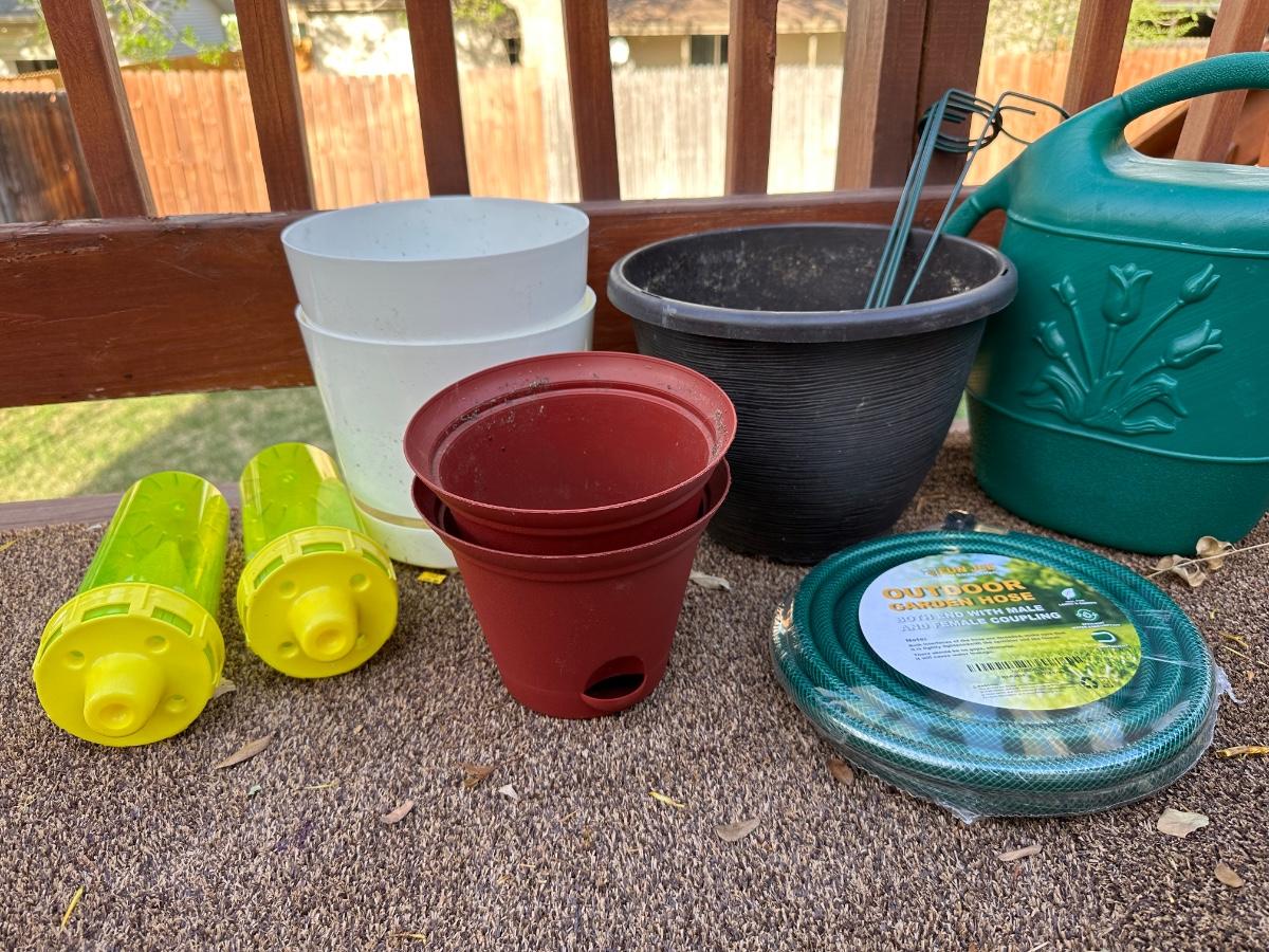 FLOWER POTS, WATERING CAN AND NEW GARDEN HOSE