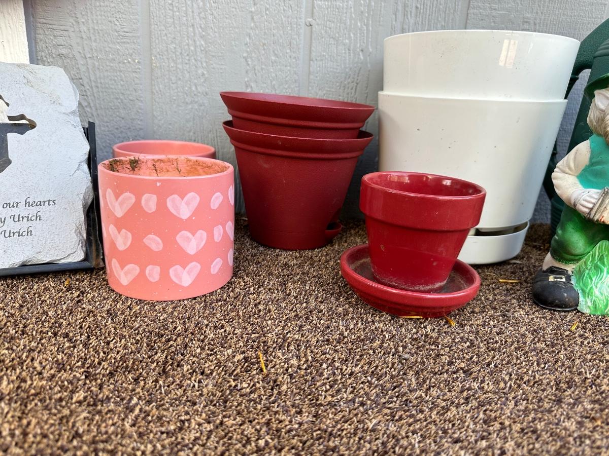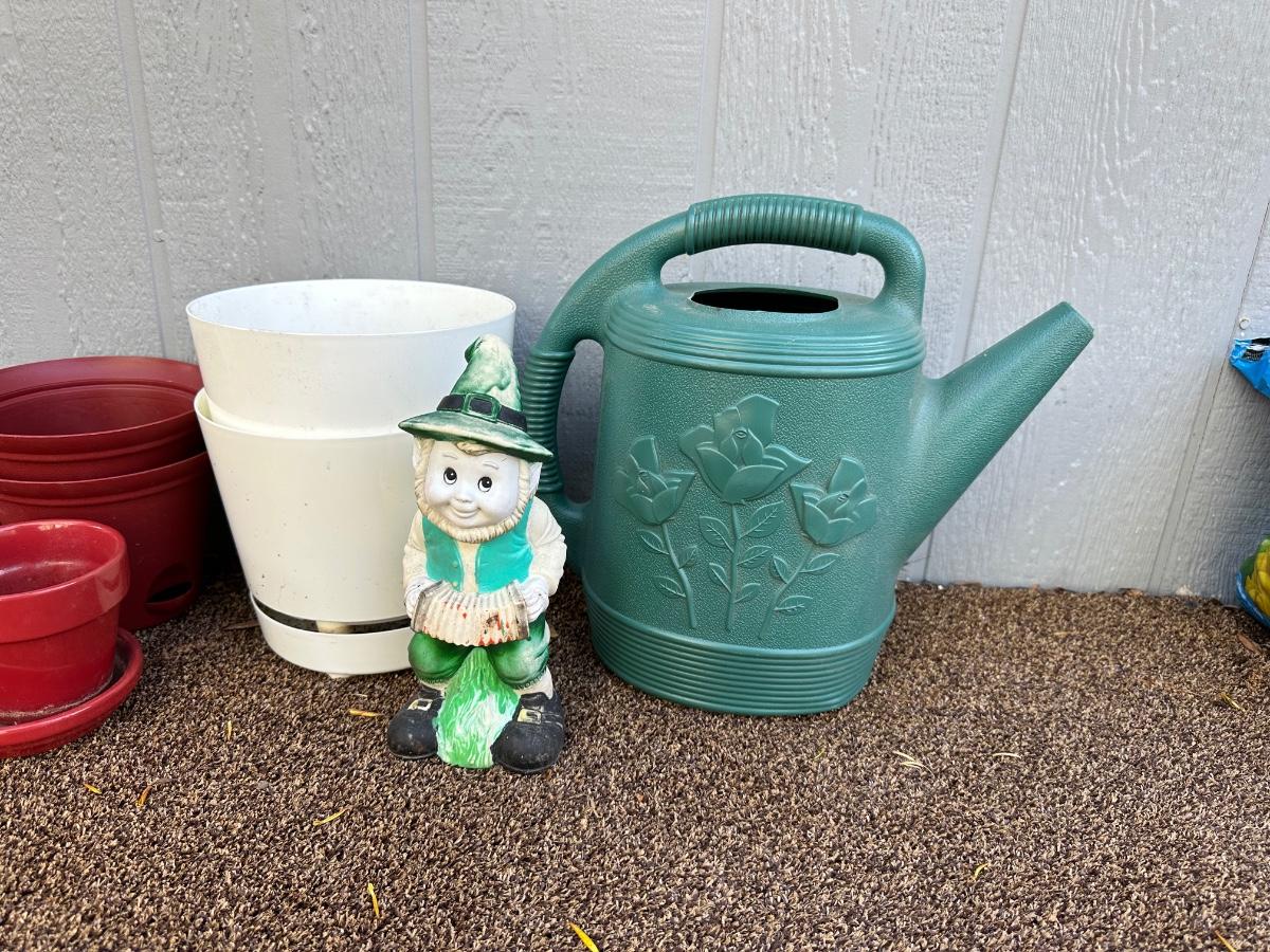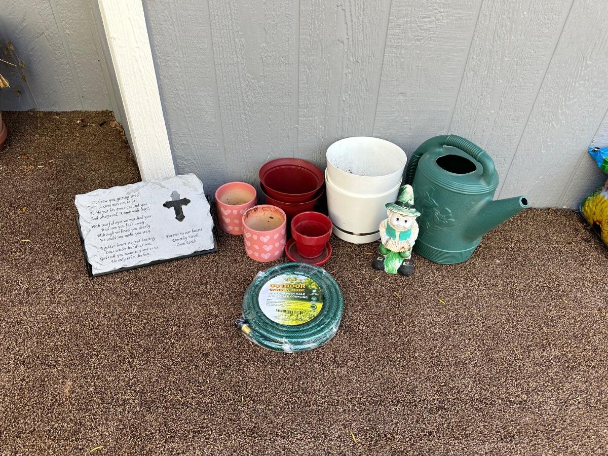 FLOWER POTS, WATERING CAN AND NEW GARDEN HOSE