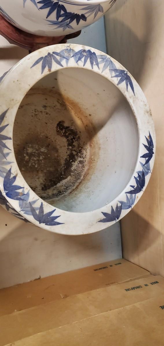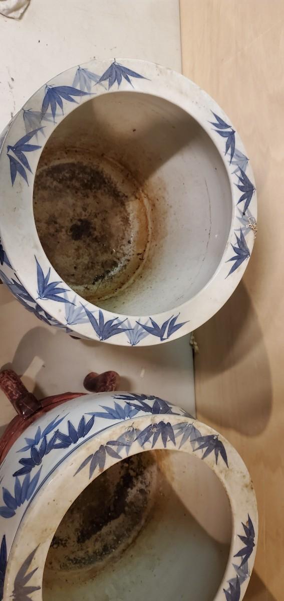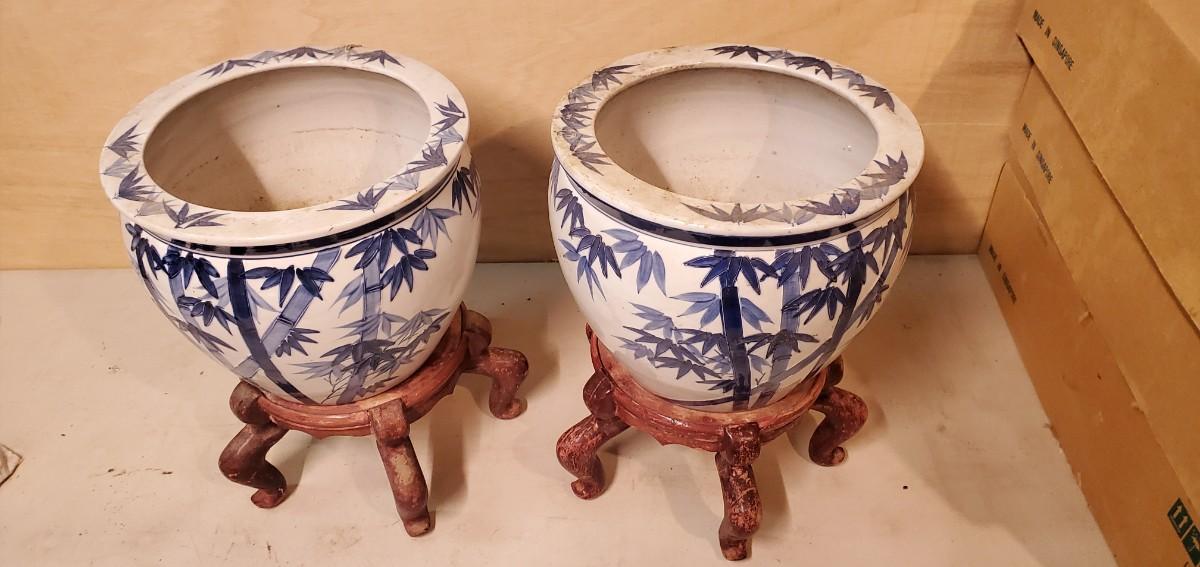 Nice set of flowers pots with stands, pots measure 11 in Dia x10 in tall and are blue and white in color