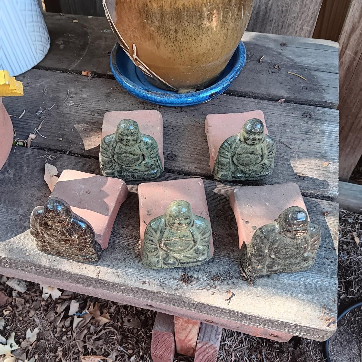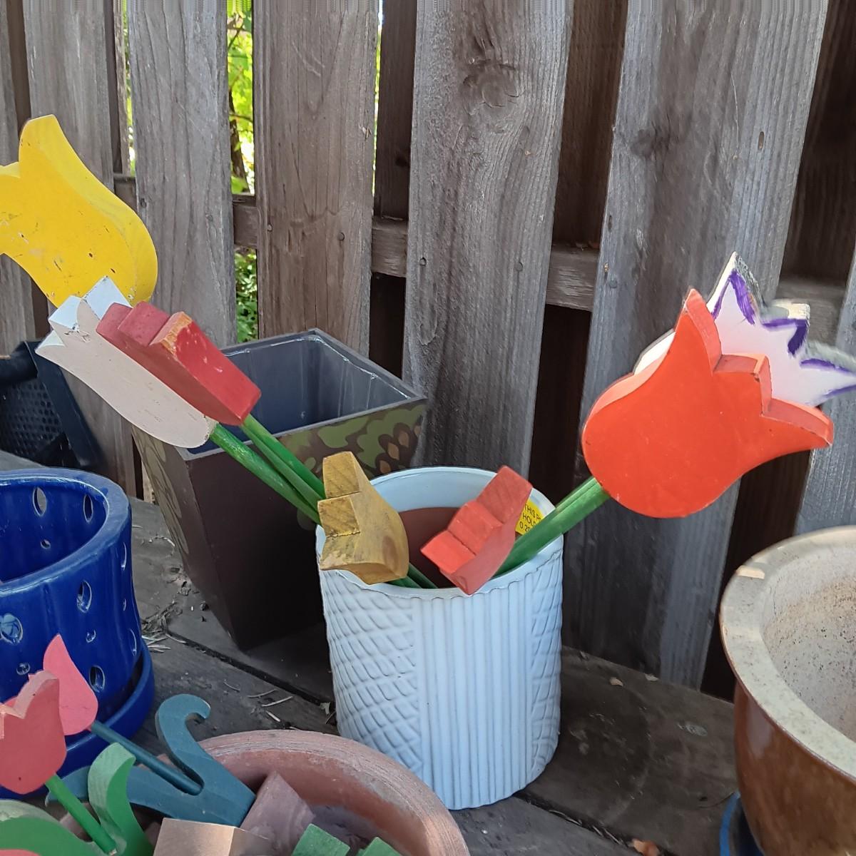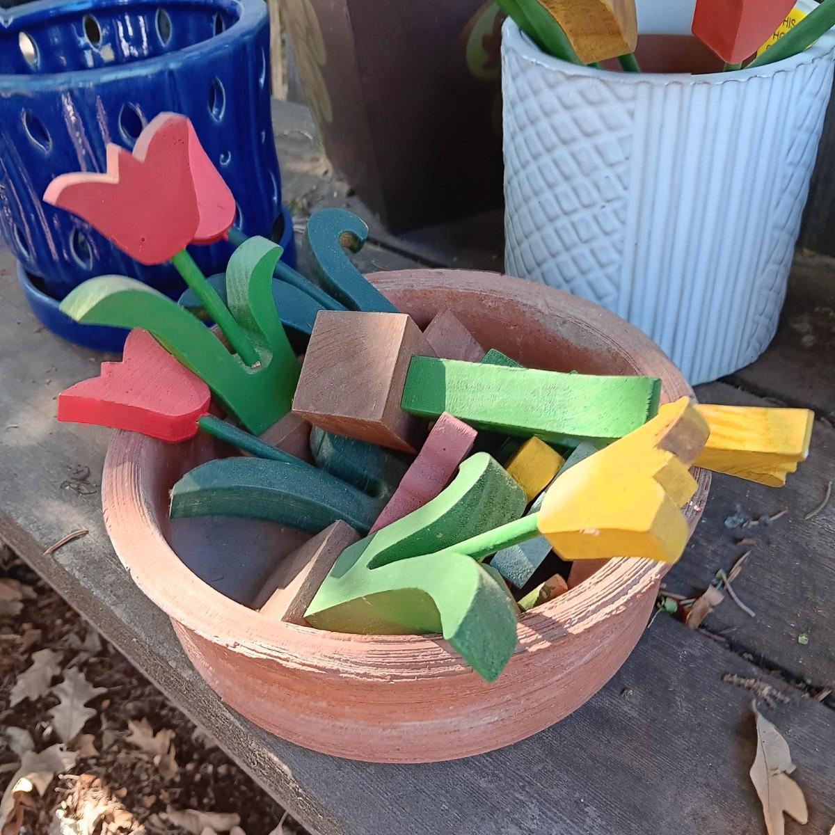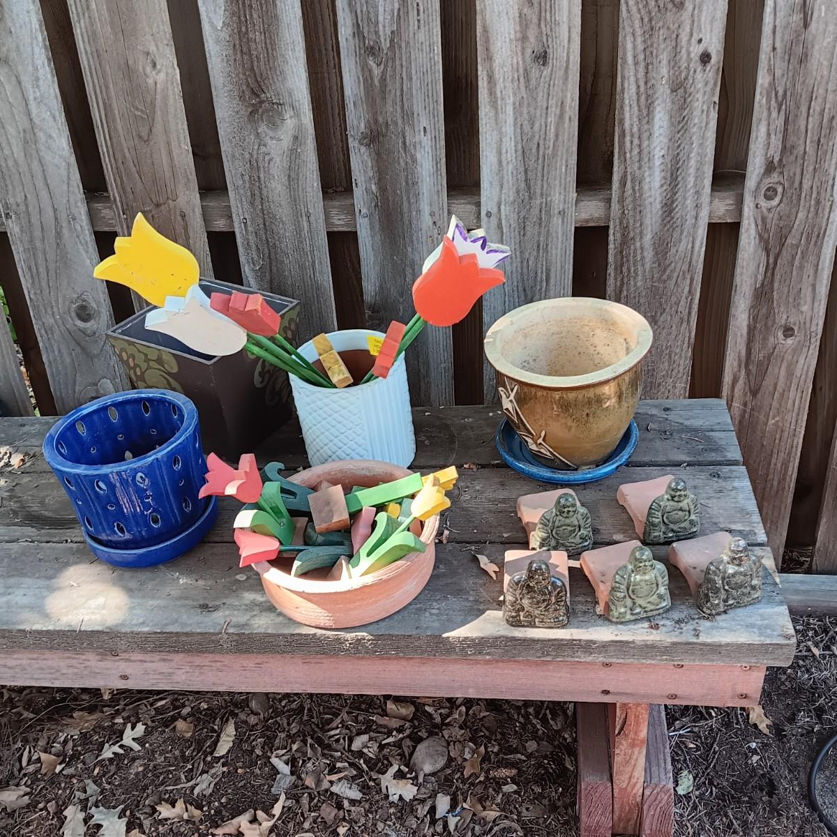 FLOWER POTS, WOODEN FLOWERS AND BUDDHA POT RESTS