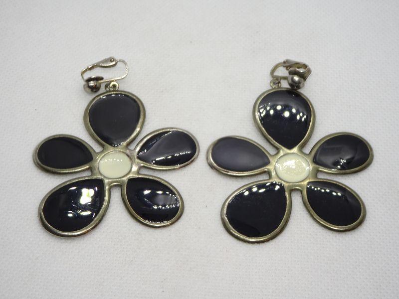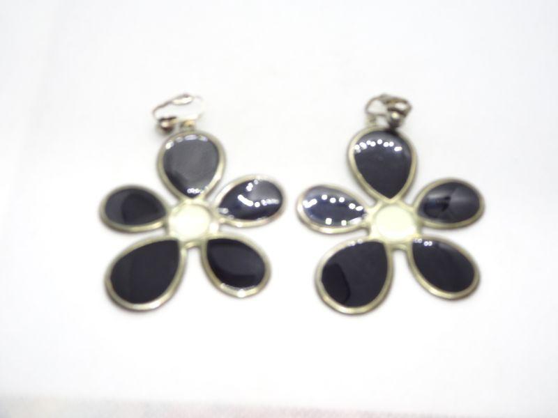 FLOWER POWER Black & White Dangle Clip Earrings