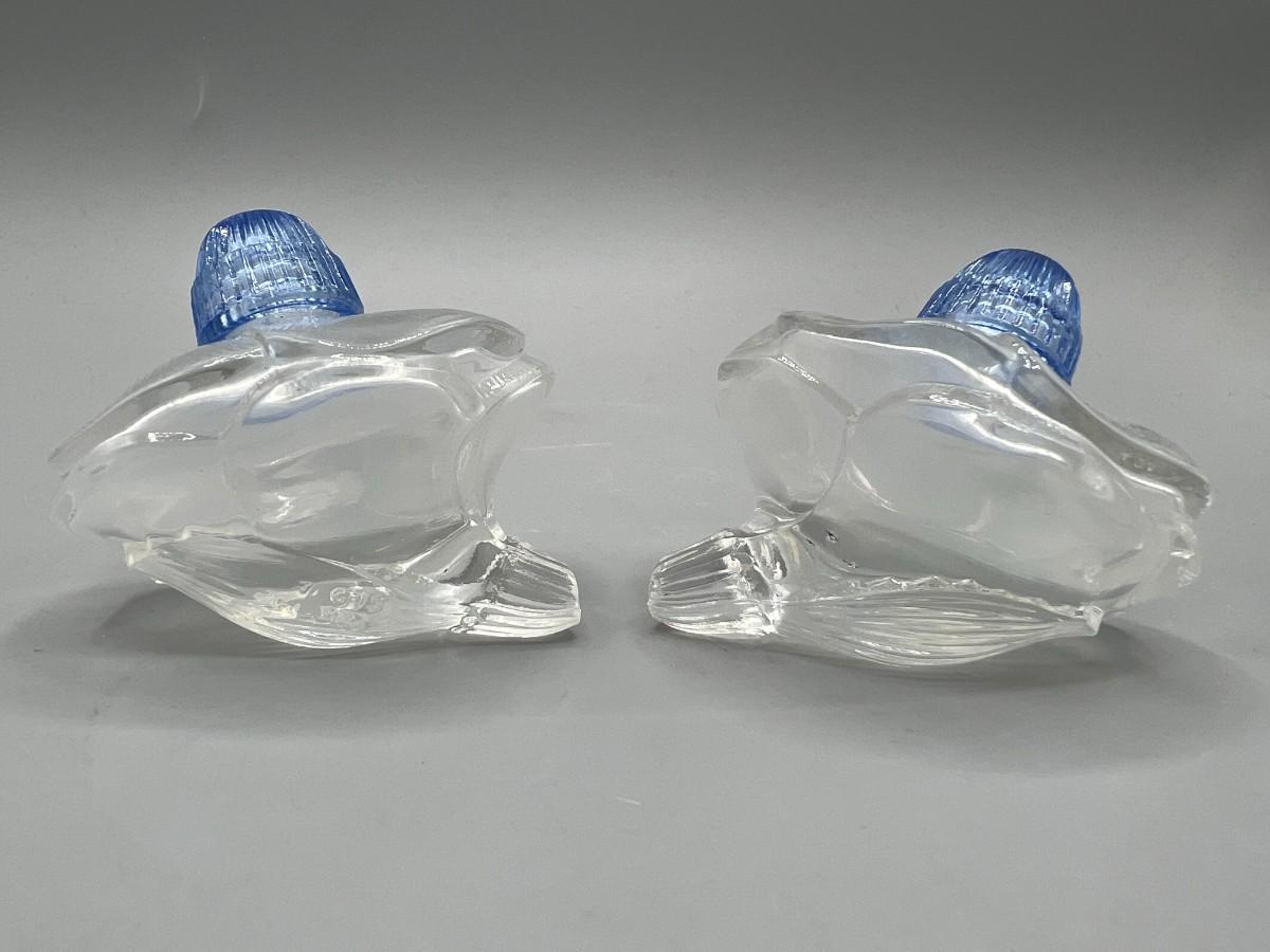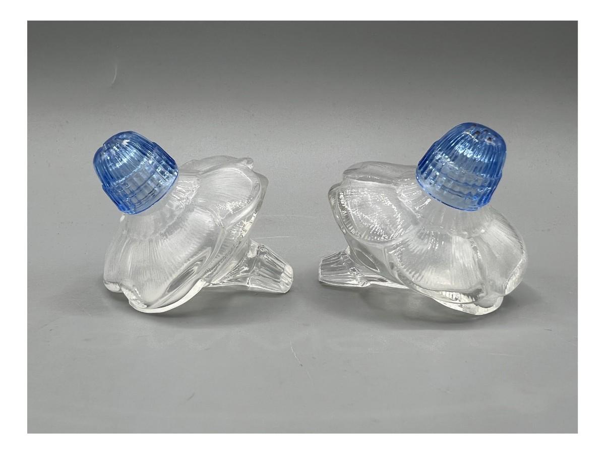 Interesting flower shaped salt and pepper shakers. Clear glass with blue shaker caps. Made in Czechoslovakia.