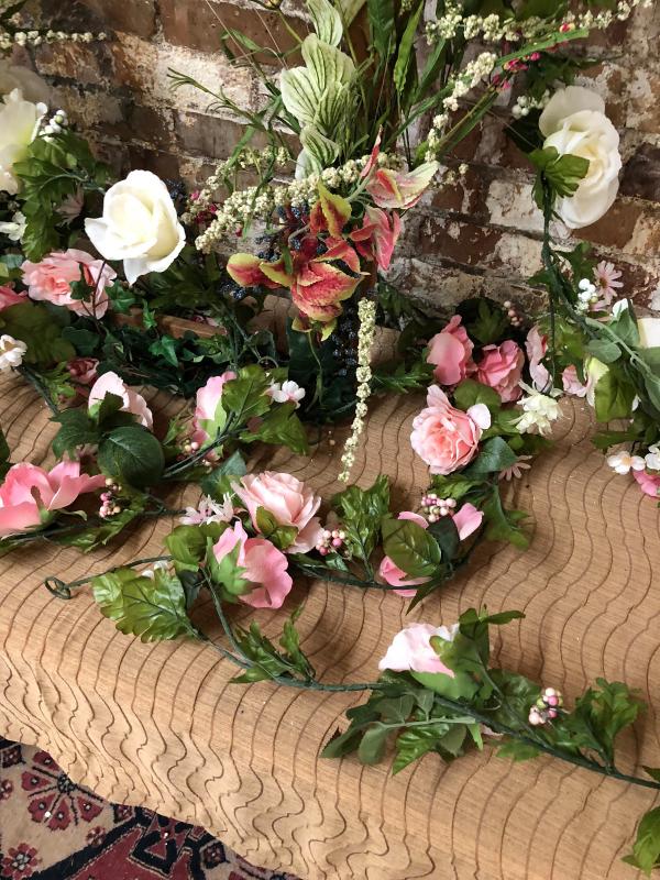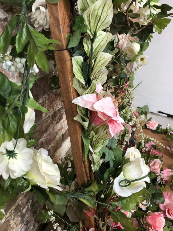Large floral arrangement on a wood window frame