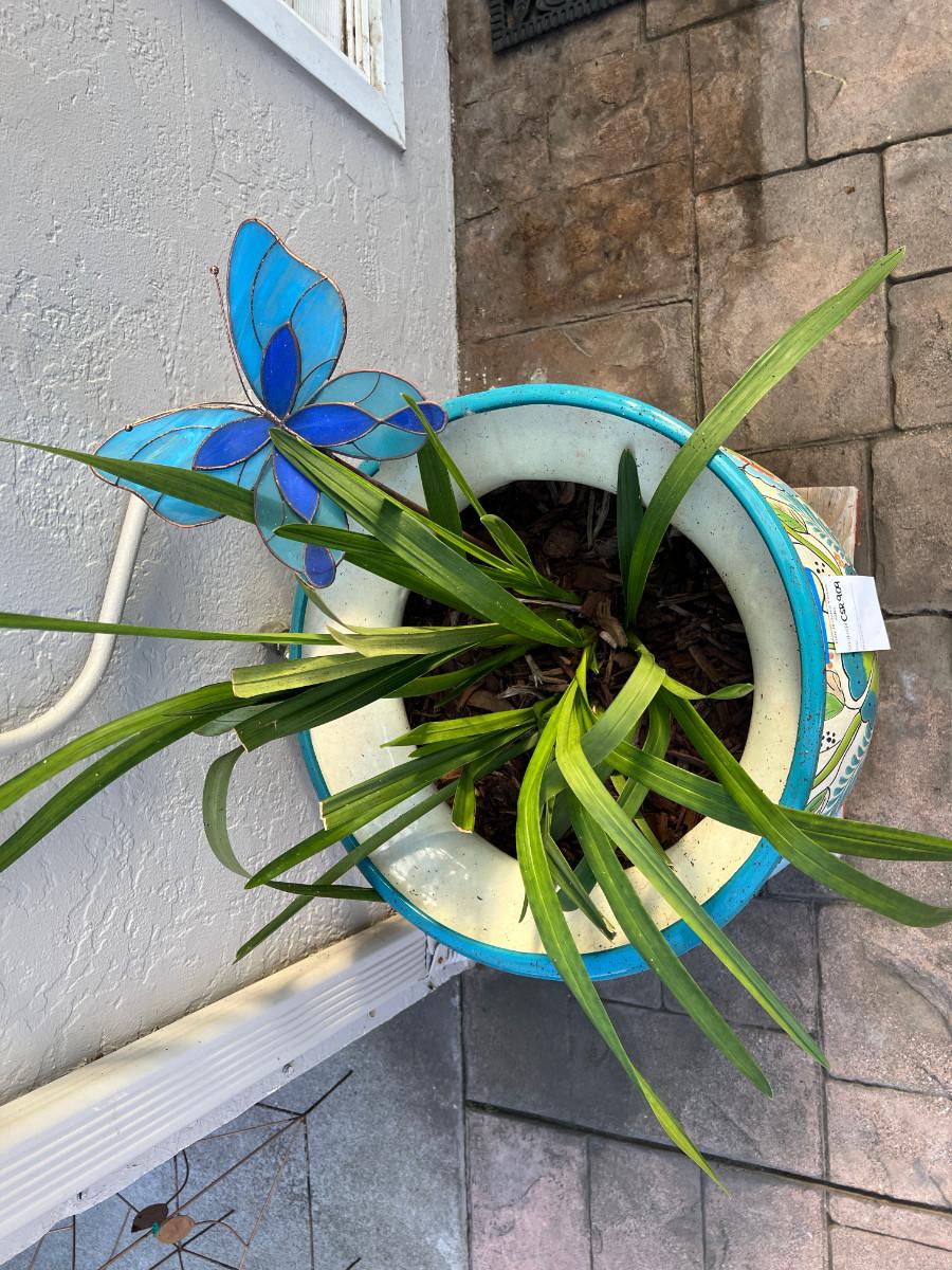 Plant included, heavy please be prepared to move this beauty. Butterfly glass ornament included