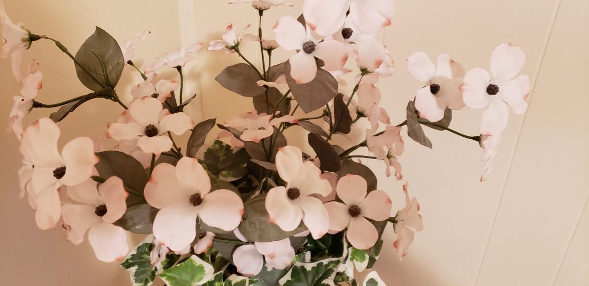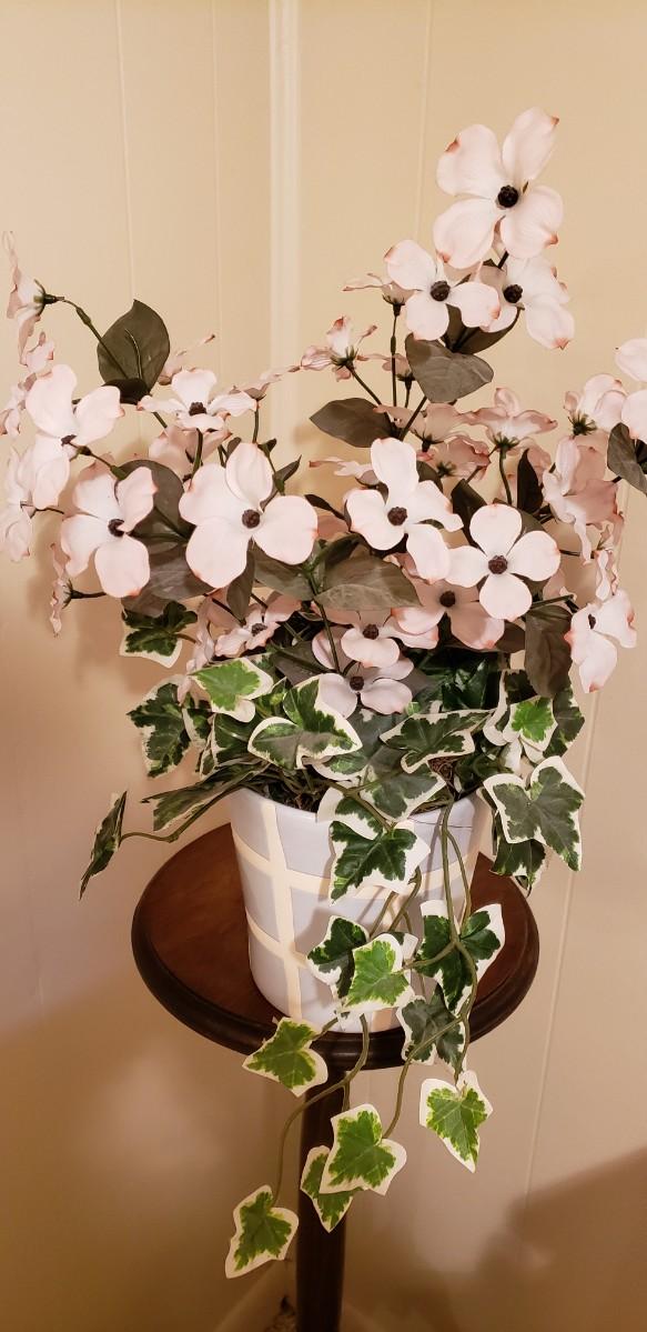 light blue & white planter; 7 " diameter 61/2 h. Overall 20" height. Artificial
