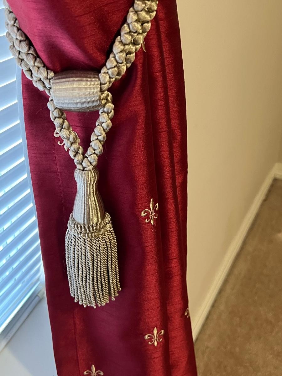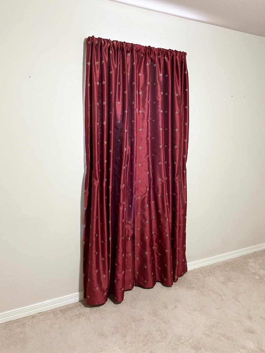 Includes 2 panels & rope ties ~ The design has no fading but the back grey paneling has fading from the sun, see photos ~ Does not affect the beautiful interior design ~ Does not include curtain rod or hardware ~ Each panel = 84” L x 49” W