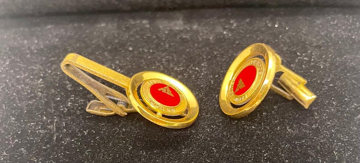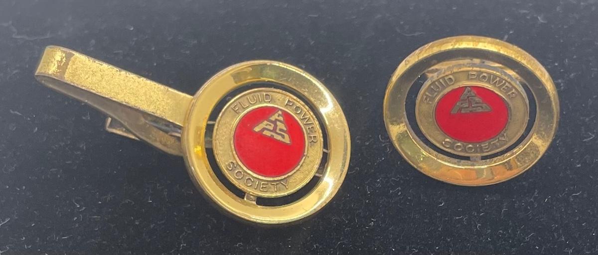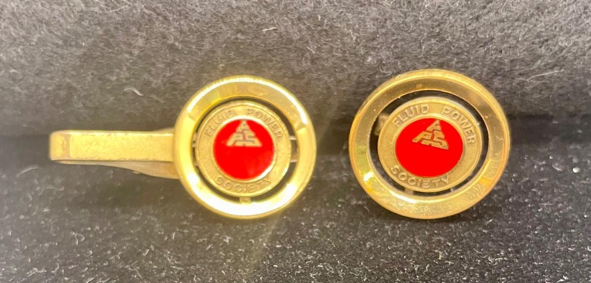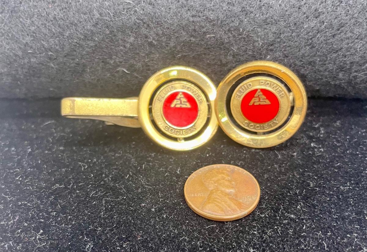 Gold-tone tie bar and lapel pin with the Fluid Power Society (FPS) logo in red and gold. Good condition.