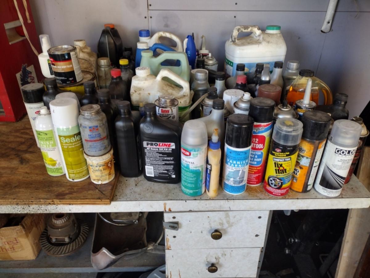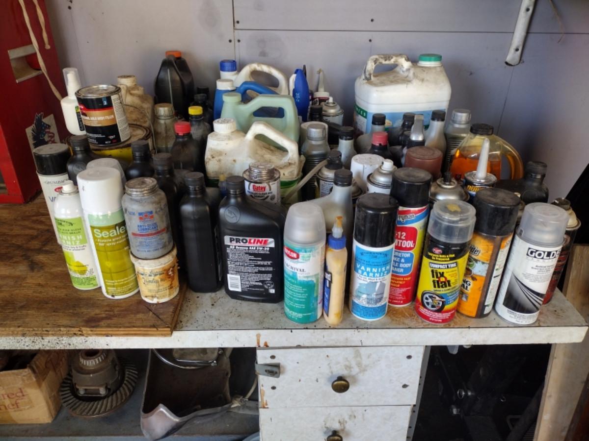 Lots of automotive and household products. There are brand new bottles of oil and transmission fluid as well as other items.