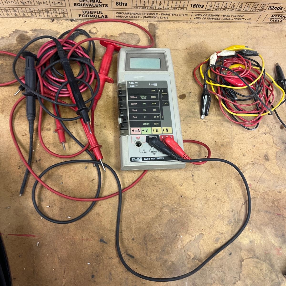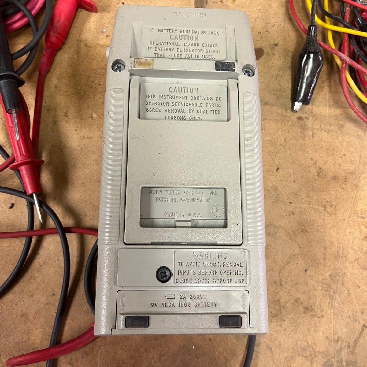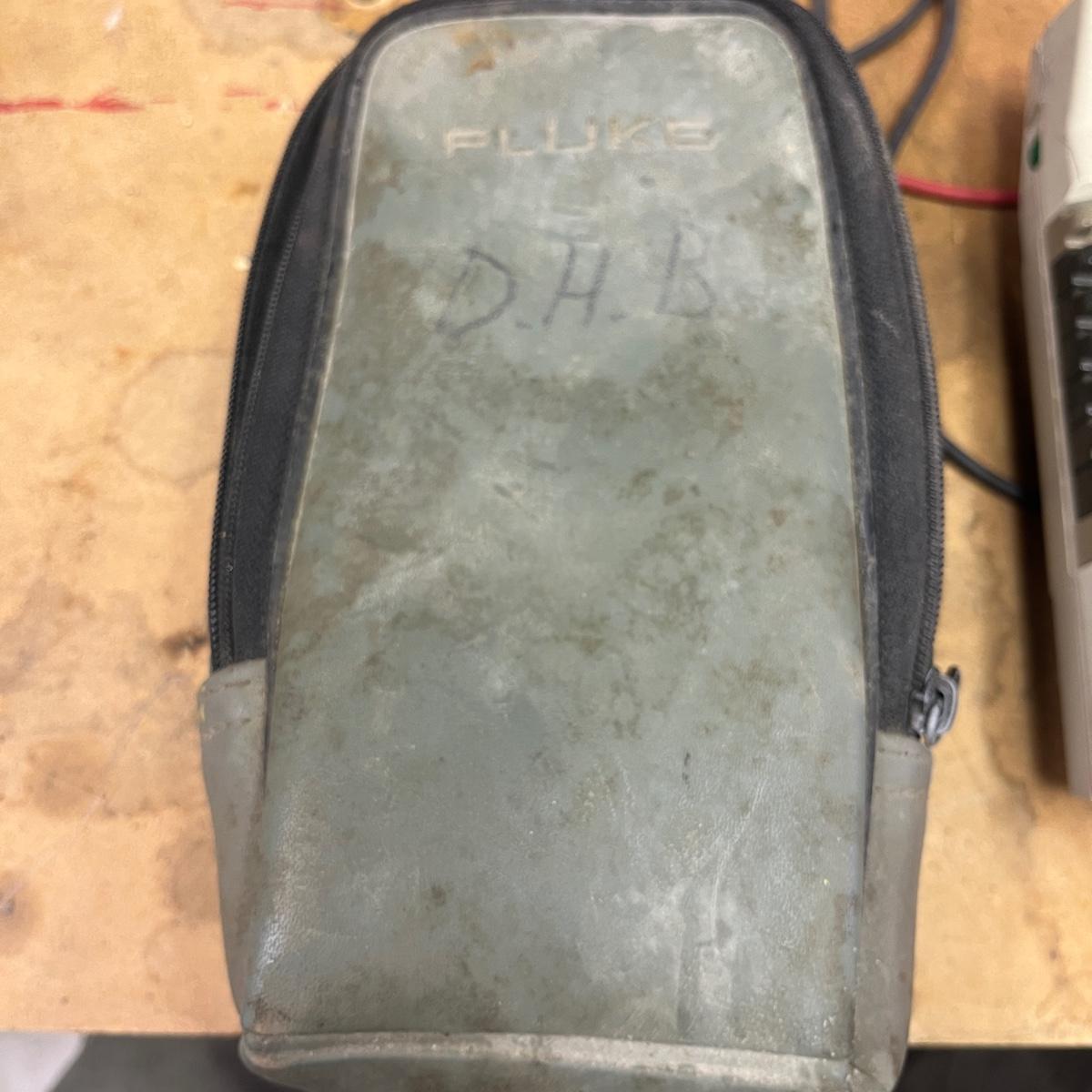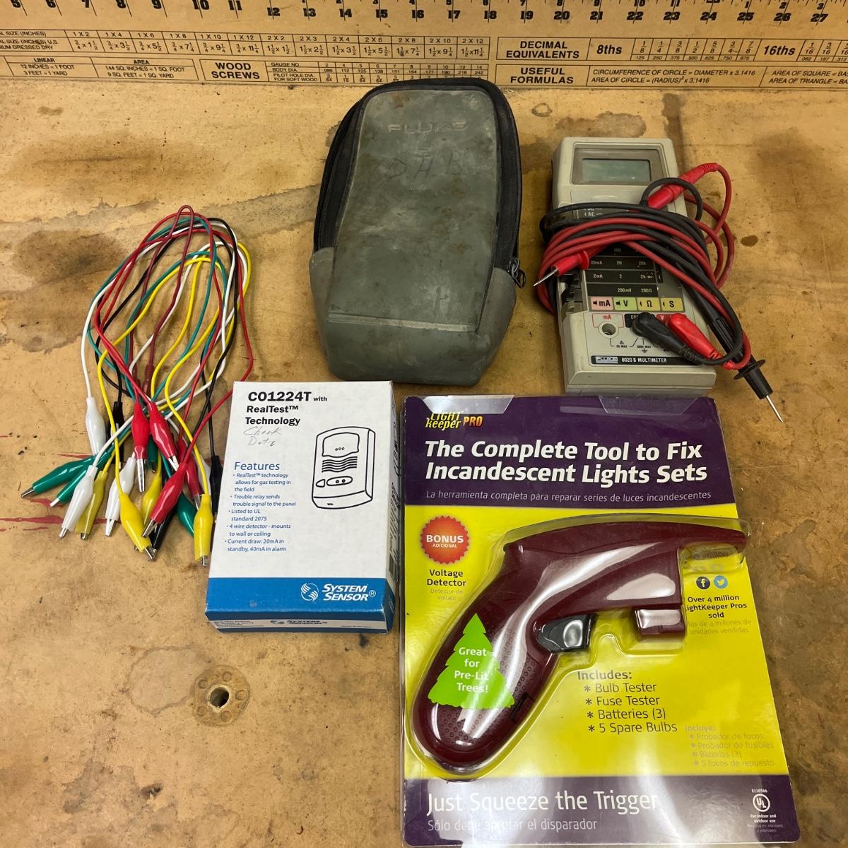 Lot includes a Fluke multimeter with case, Milwaukee voltage detector, Realtest CO2 detector, spare wires and more. Multimeter measures 3.5” x 1.5” x 7”H. Multimeter and voltage detector both powered on when switched on.