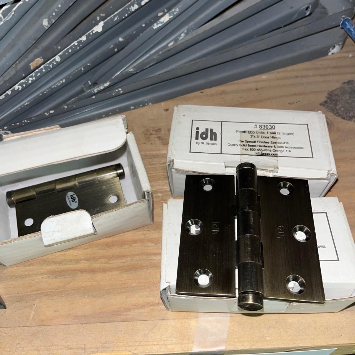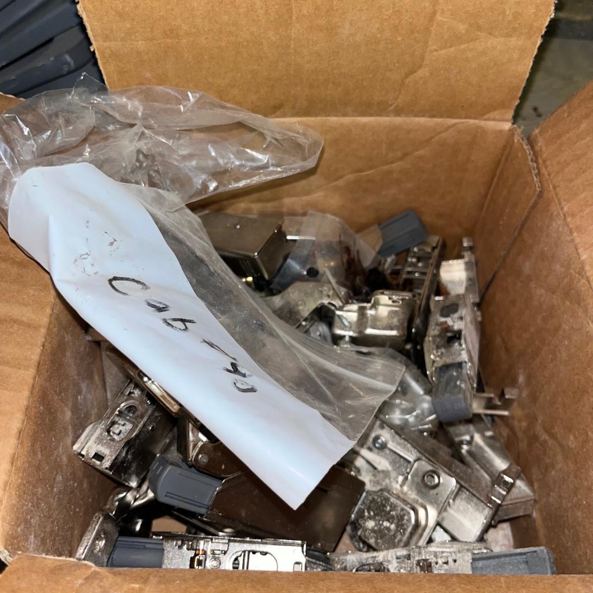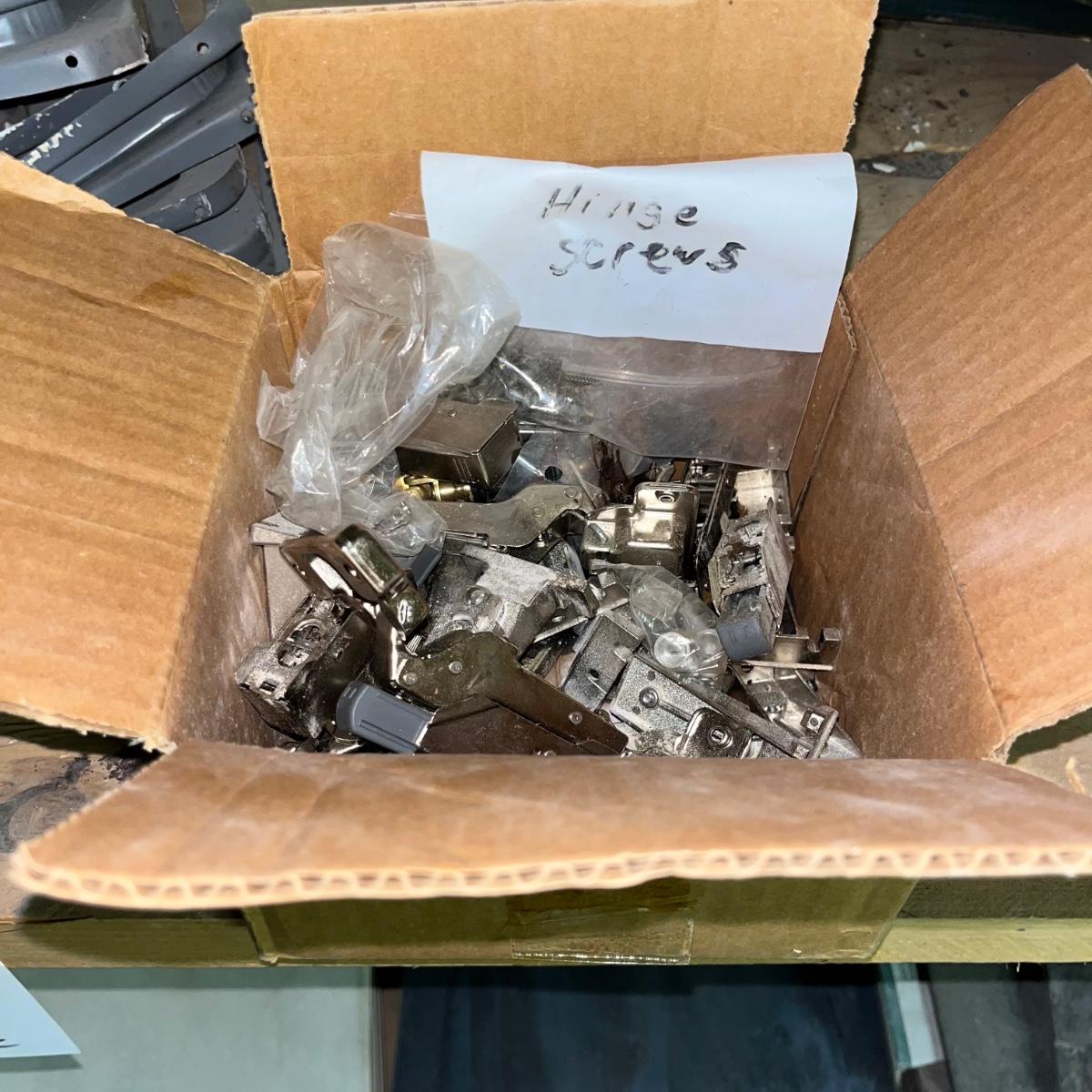 Lot includes three 48” fluorescent lamps with an open box of bulbs, Over 12 metal shelf brackets, door hinges, drains, soft close cabinet hinges and more.