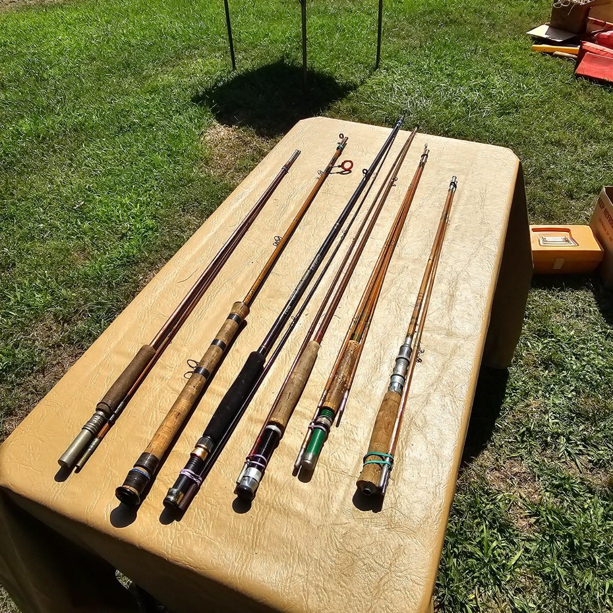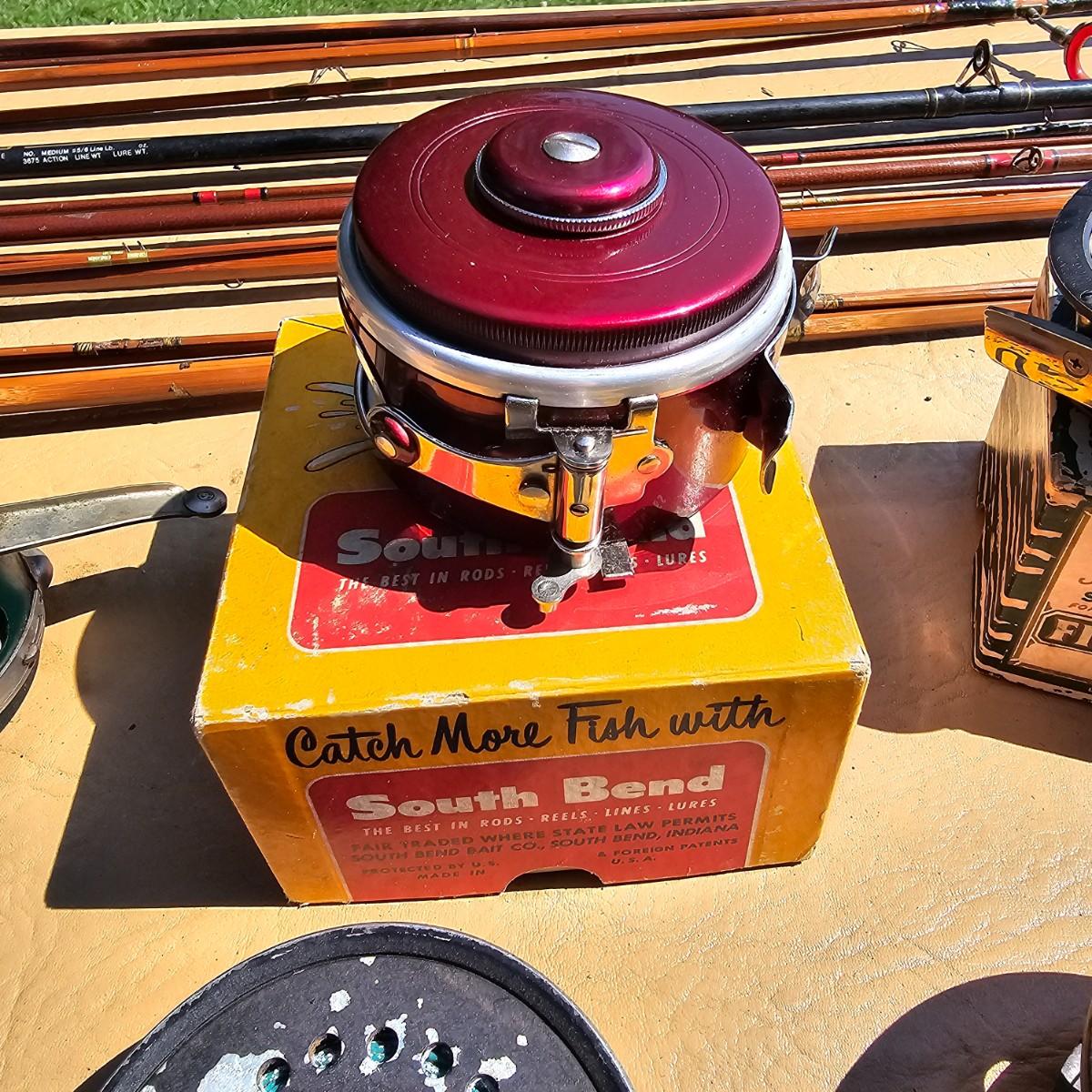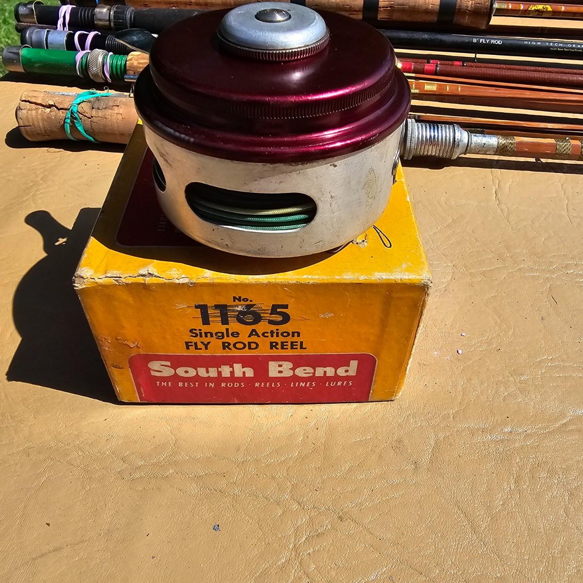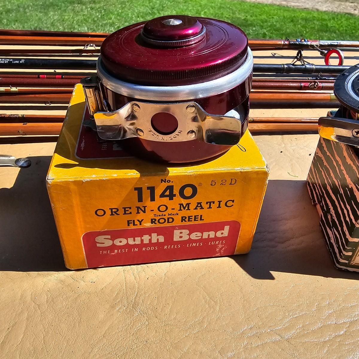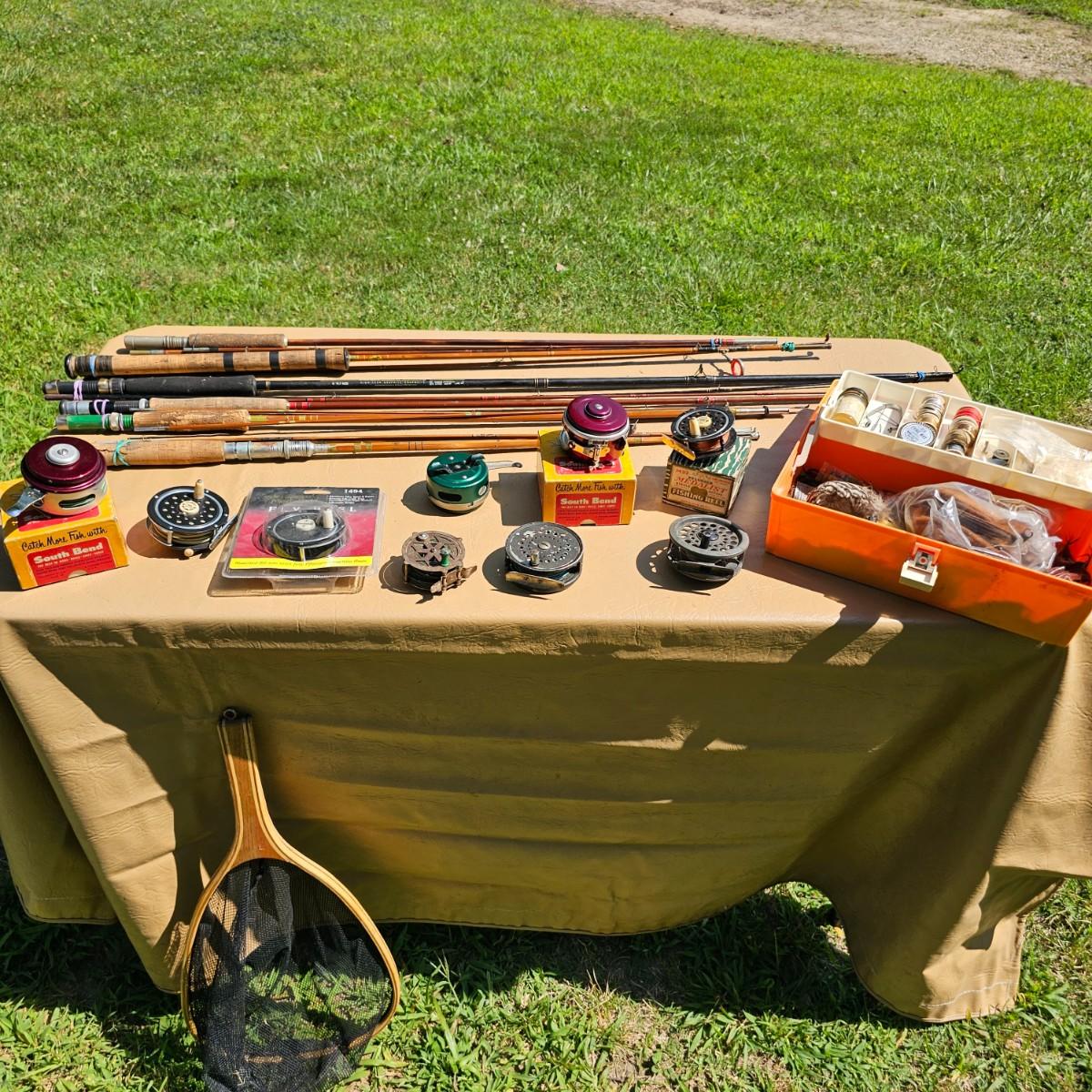 Nine fly reels by South Bend, Pflueger, others and six rods as well as a tackle box of fly tying materials and a vise. Four bamboo, one graphite and one glass rod in eight foot nine foot .and longer. Rods by South Bend, Pearl, Herters and others. One net also included. See photos for details. Local pickup only.