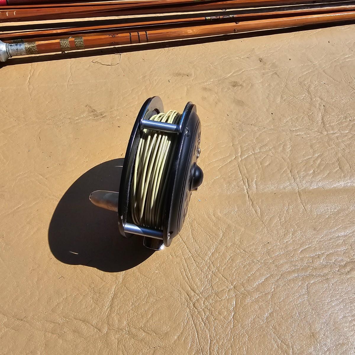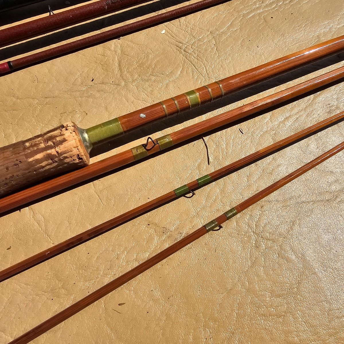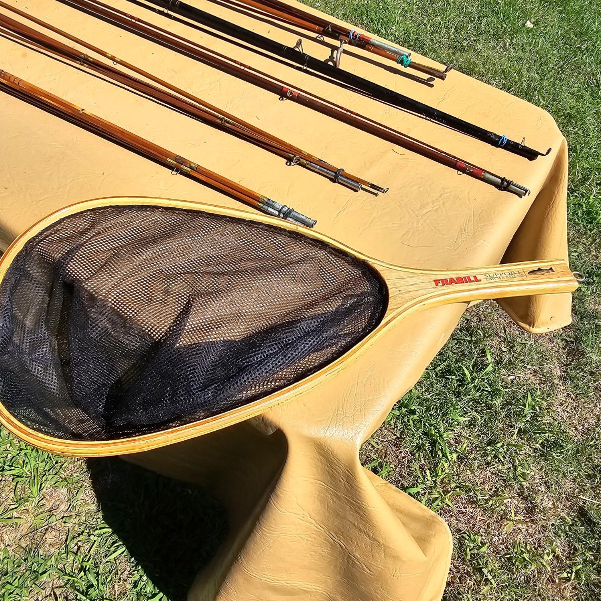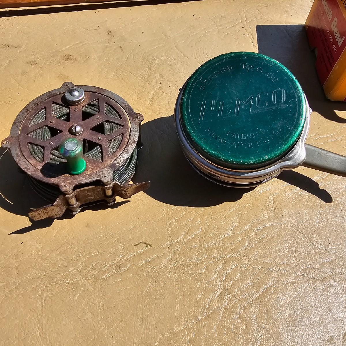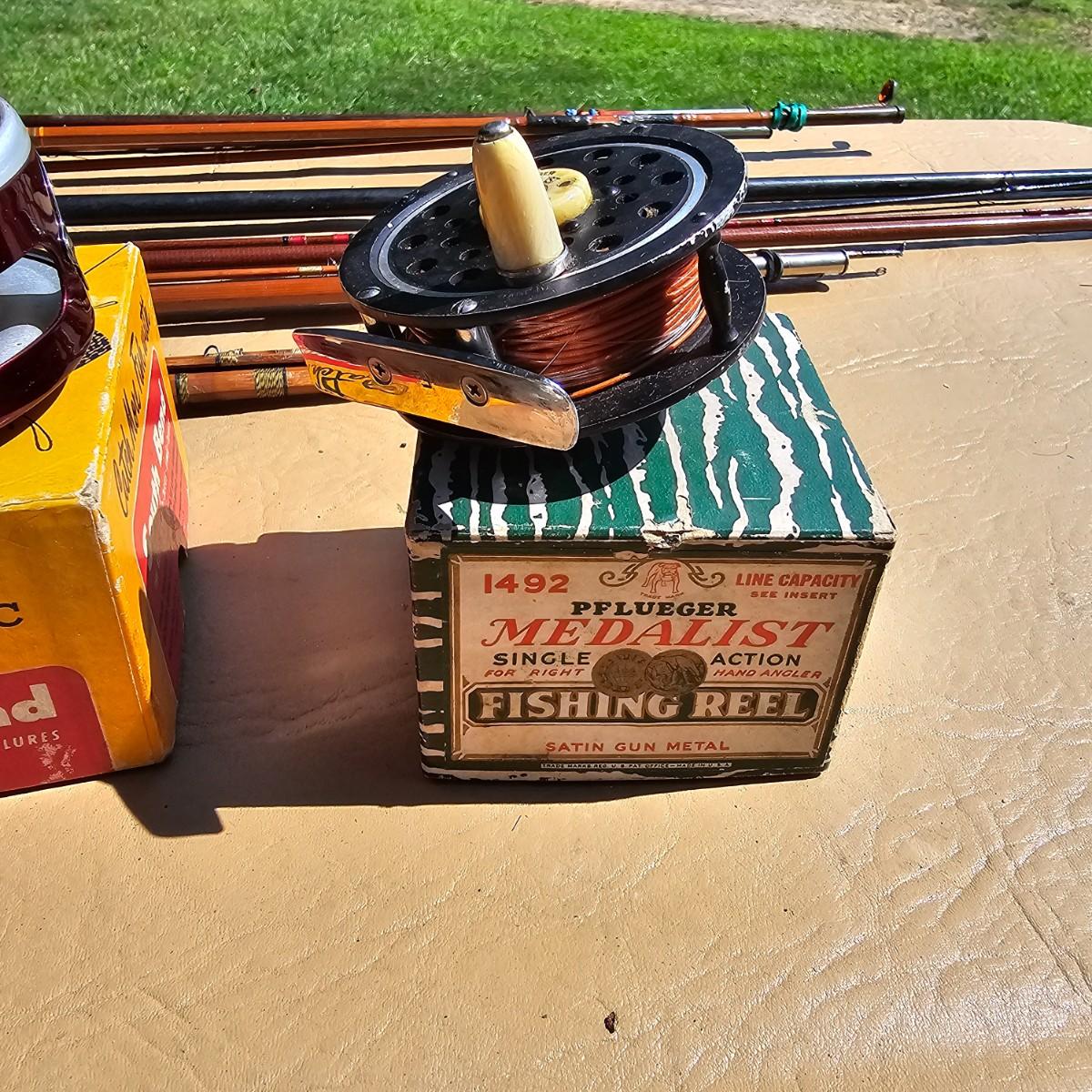 Nine fly reels by South Bend, Pflueger, others and six rods as well as a tackle box of fly tying materials and a vise. Four bamboo, one graphite and one glass rod in eight foot nine foot .and longer. Rods by South Bend, Pearl, Herters and others. One net also included. See photos for details. Local pickup only.
