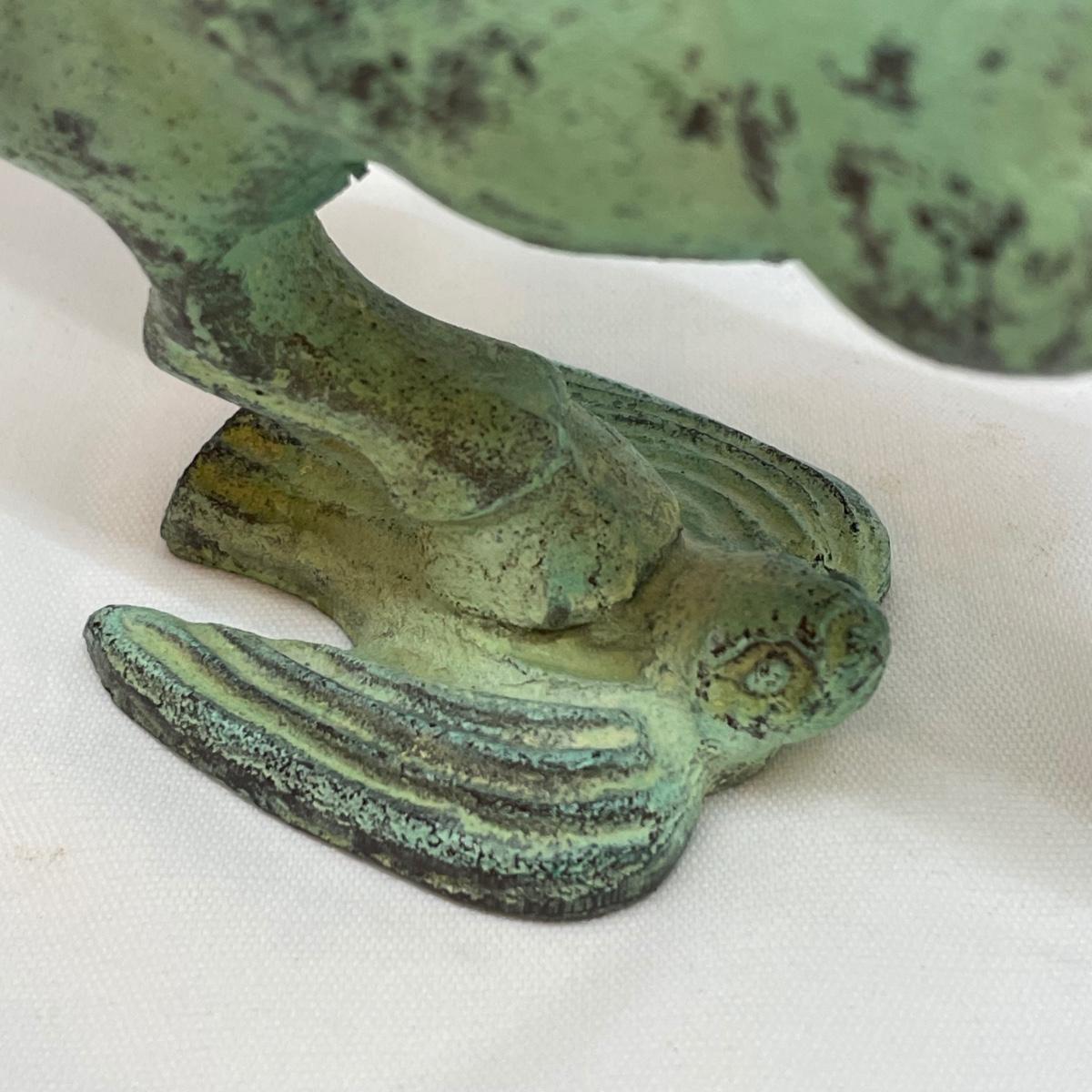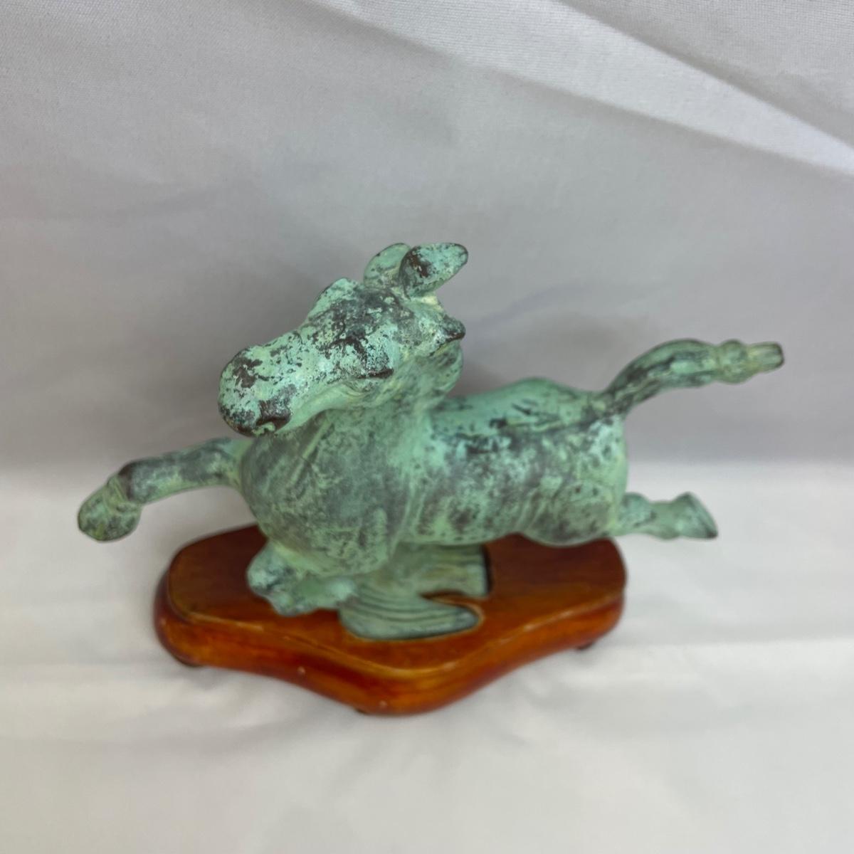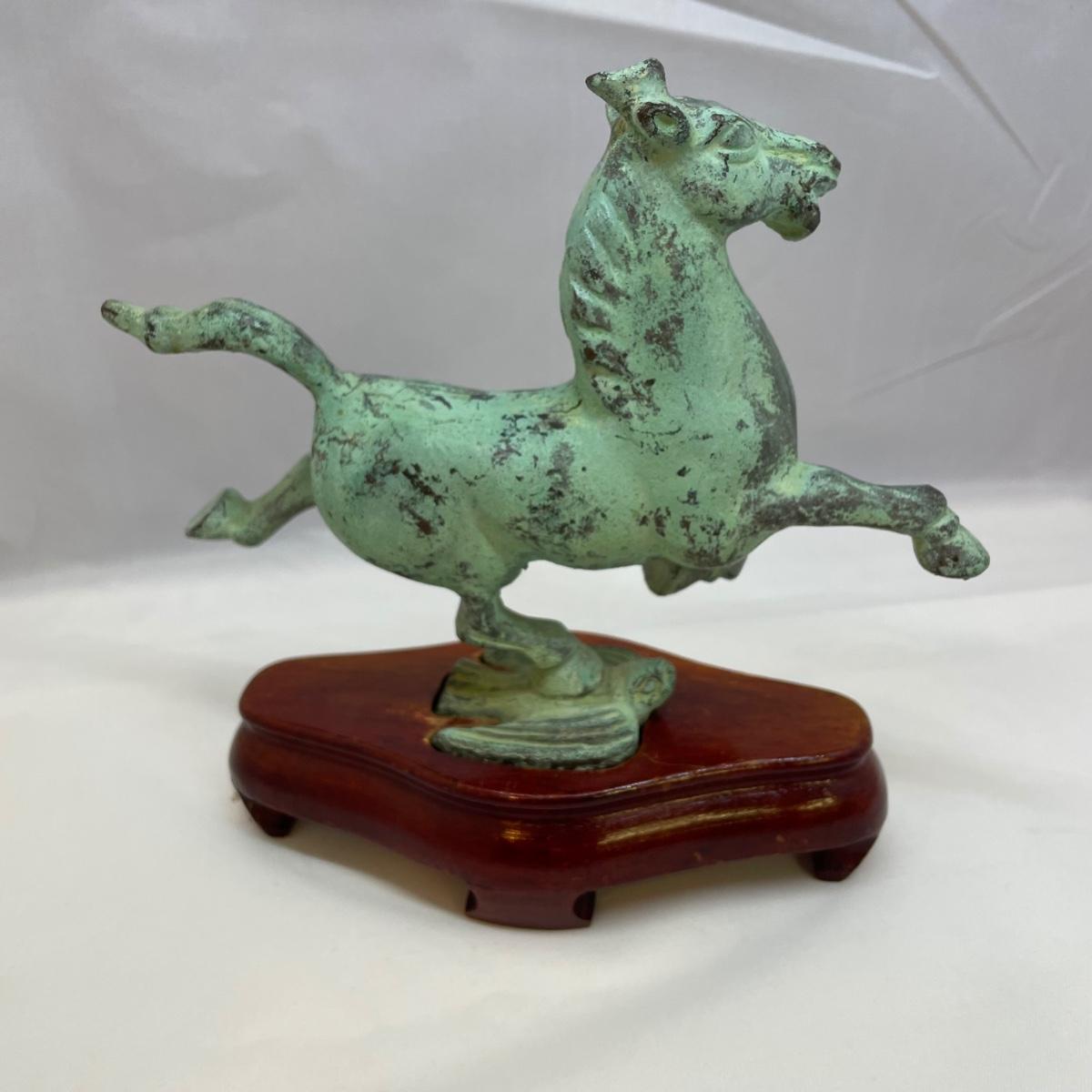 This heavenly steed appears to be made of bronze with a gorgeous patina that was likely manufactured and not caused by age, but possibly paint. The horse is riding on the wings of a bird which sits perfectly in its wooden stand. Sculpture measures approximately 7” x 3” x 7”H. See images. Shipping available.